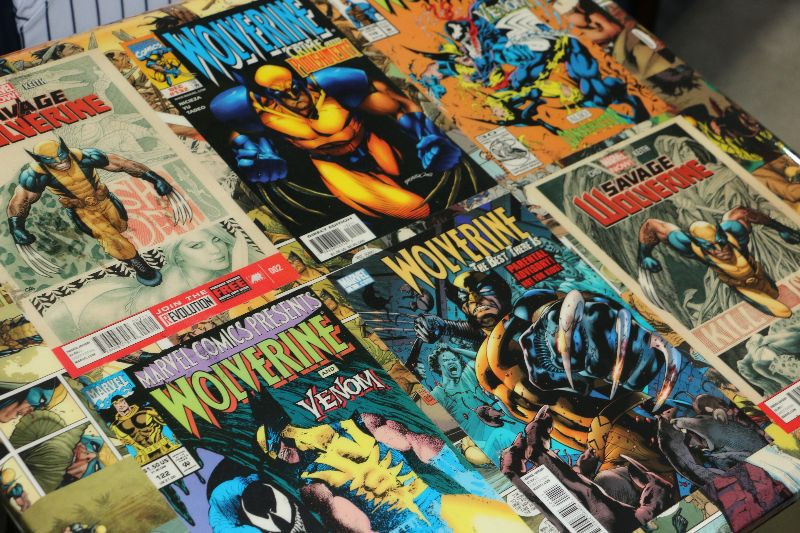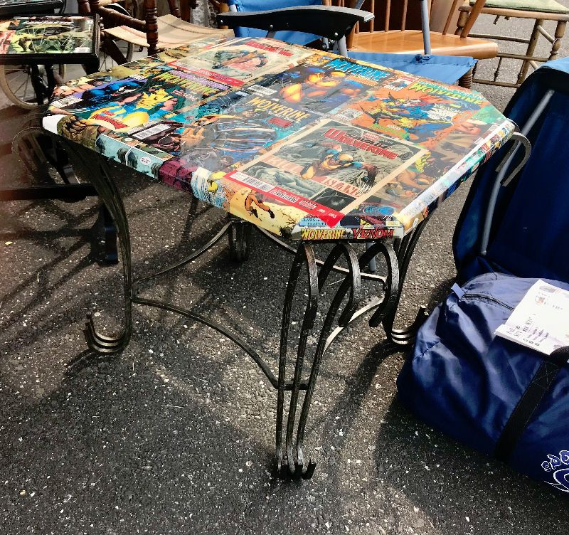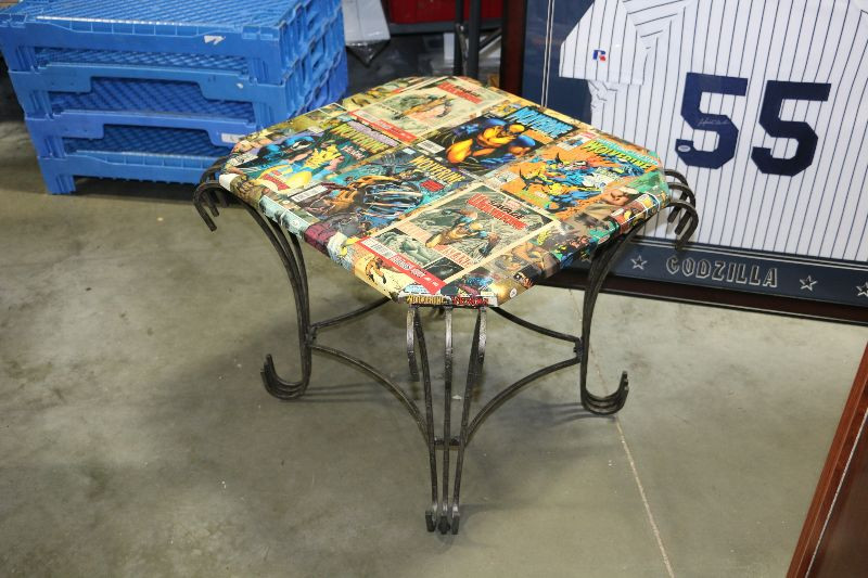 A unique one-of-a-kind end table, This end table with iron claws on each corner (not sharp) has been repurposed with REAL Marvel Wolverine comic books. The table surface has been covered in real Wolverine comics which have been bonded to the table and coated with an epoxy surface giving the table a shiny glass like surface. The table top is 23” x 26”. The table with its iron claws screams Wolverine! A beautiful piece for any comic book fan. THIS ITEM IS OFFERED FOR A LOCAL PICK UP AND GROUND SHIPPING IS ALSO AVAILABLE ON REQUEST - PLEASE EMAIL FOR SHIPPING QUOTES PRIOR BIDDING!