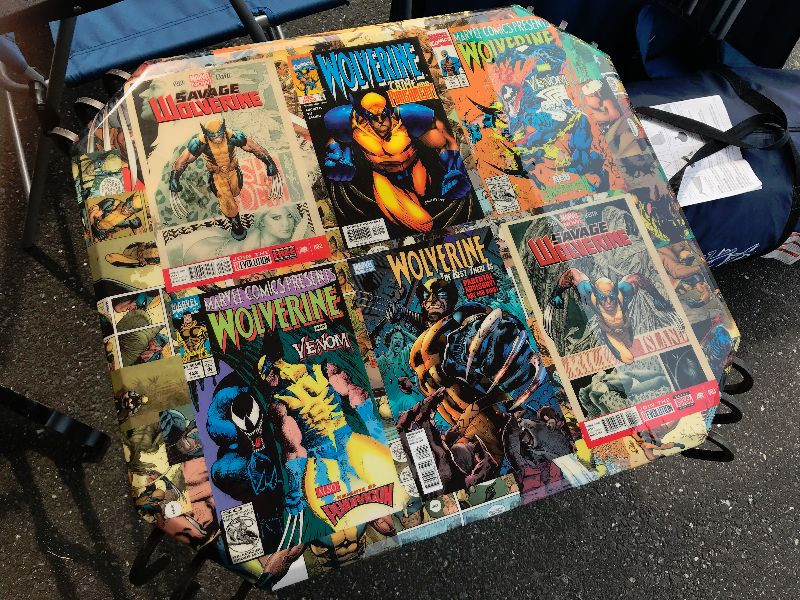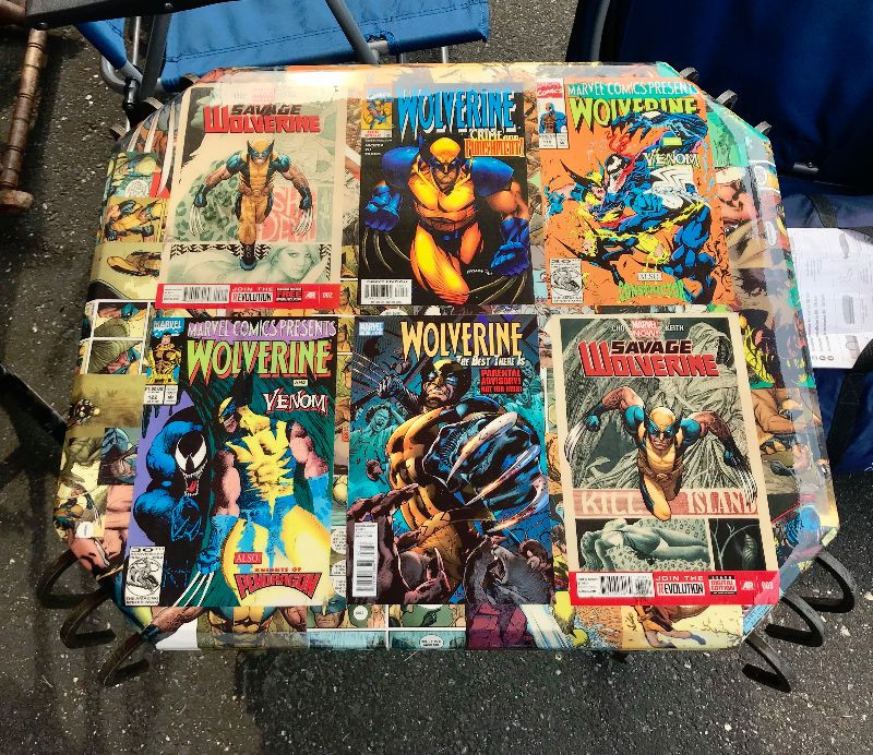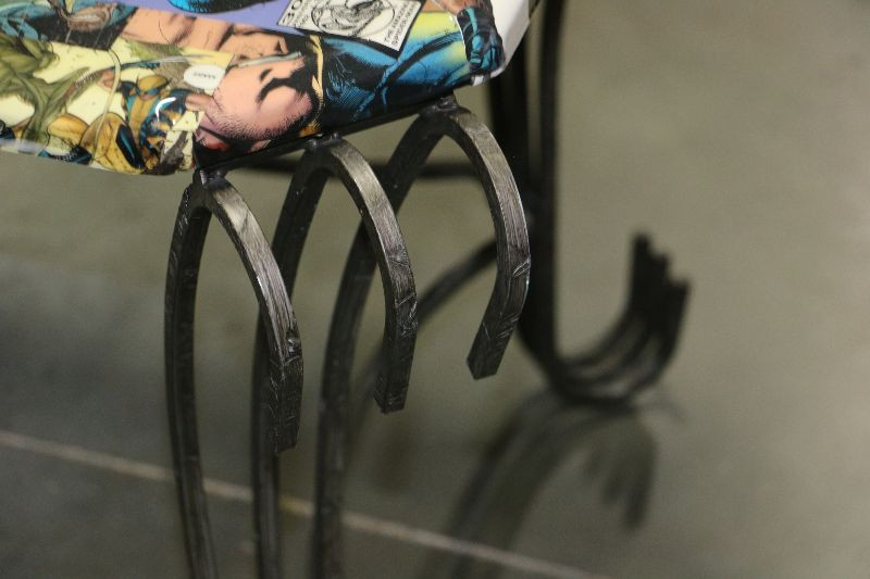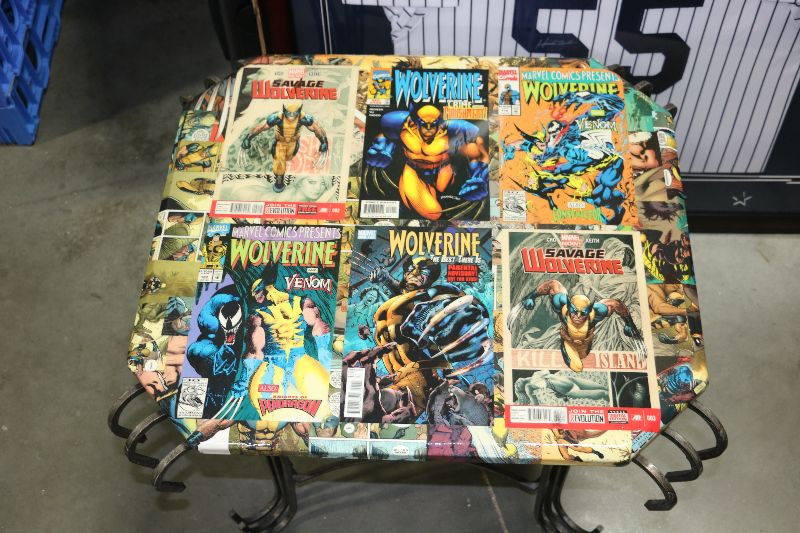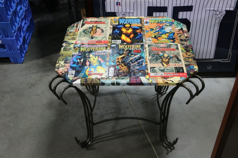 A unique one-of-a-kind end table, This end table with iron claws on each corner (not sharp) has been repurposed with REAL Marvel Wolverine comic books. The table surface has been covered in real Wolverine comics which have been bonded to the table and coated with an epoxy surface giving the table a shiny glass like surface. The table top is 23” x 26”. The table with its iron claws screams Wolverine! A beautiful piece for any comic book fan. THIS ITEM IS OFFERED FOR A LOCAL PICK UP AND GROUND SHIPPING IS ALSO AVAILABLE ON REQUEST - PLEASE EMAIL FOR SHIPPING QUOTES PRIOR BIDDING!
