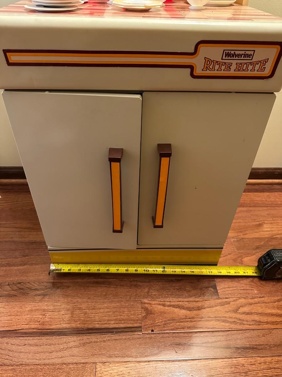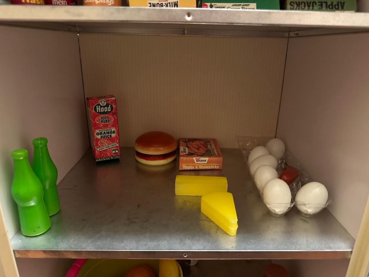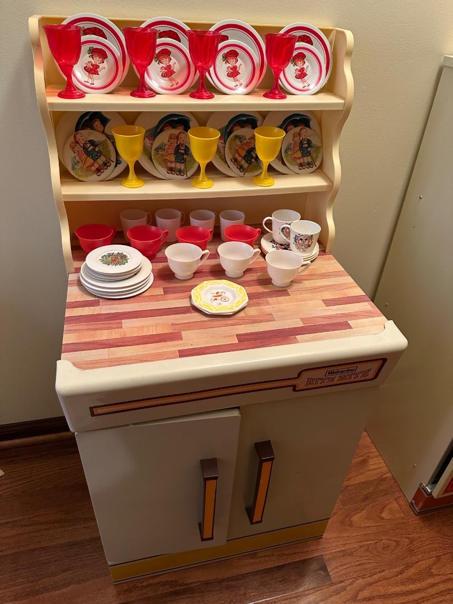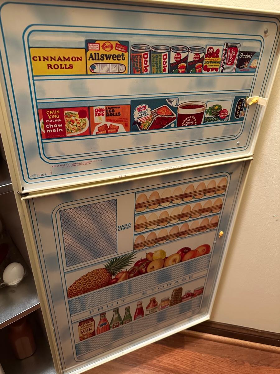 Wolverine metal refrigerator & hutch set and tea set accessories.