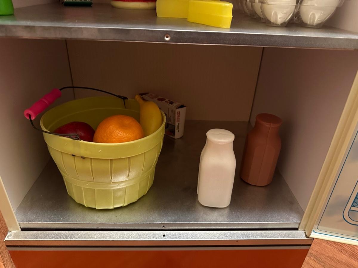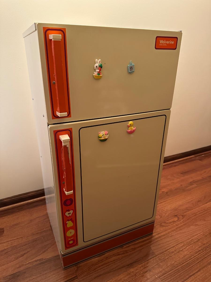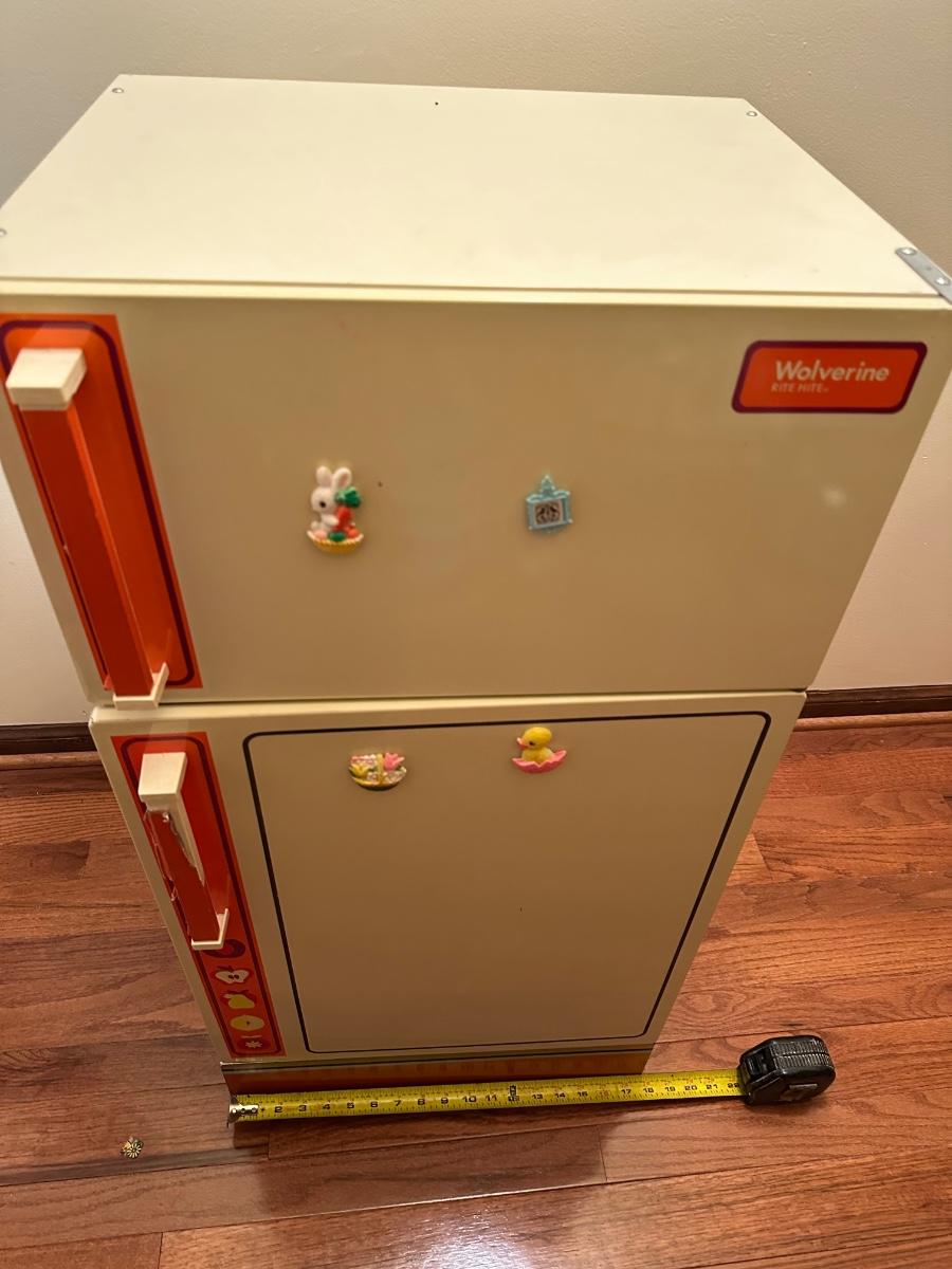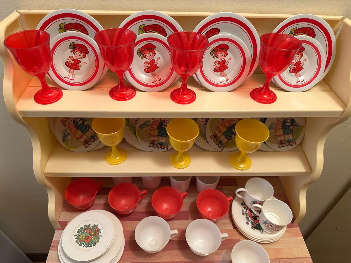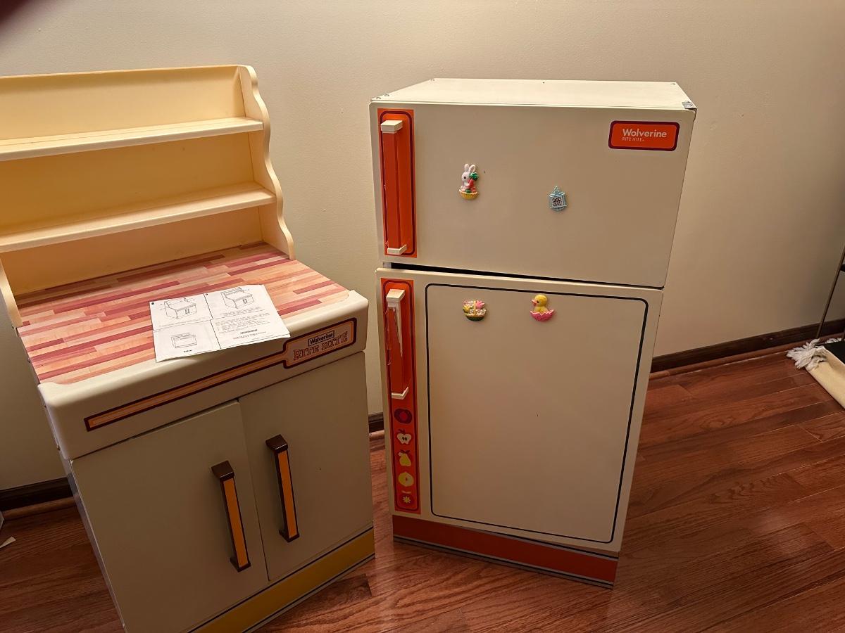 Wolverine metal refrigerator & hutch set and tea set accessories.