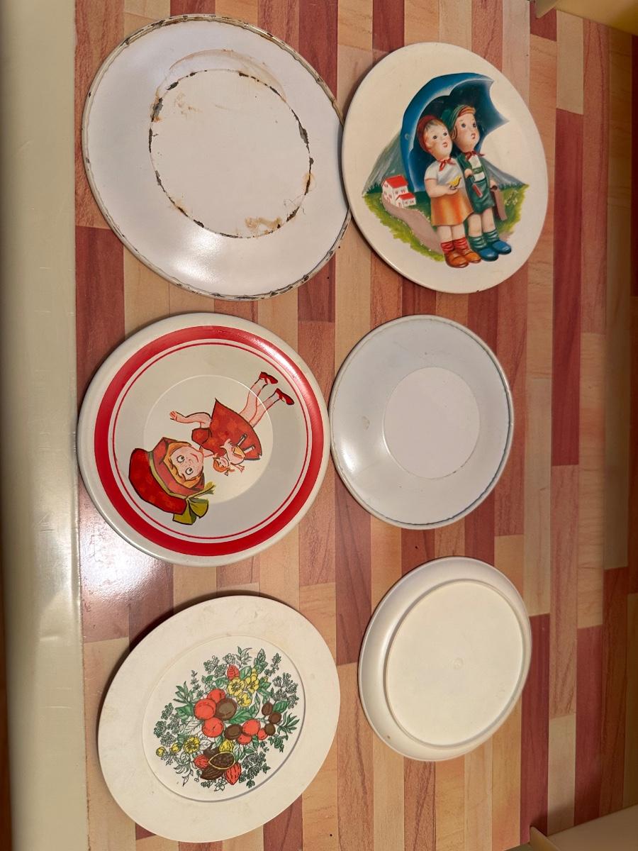 Some of the tea sets are metal and the others are plastic.