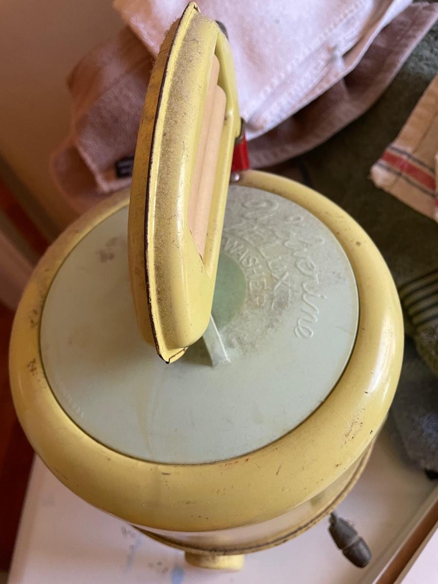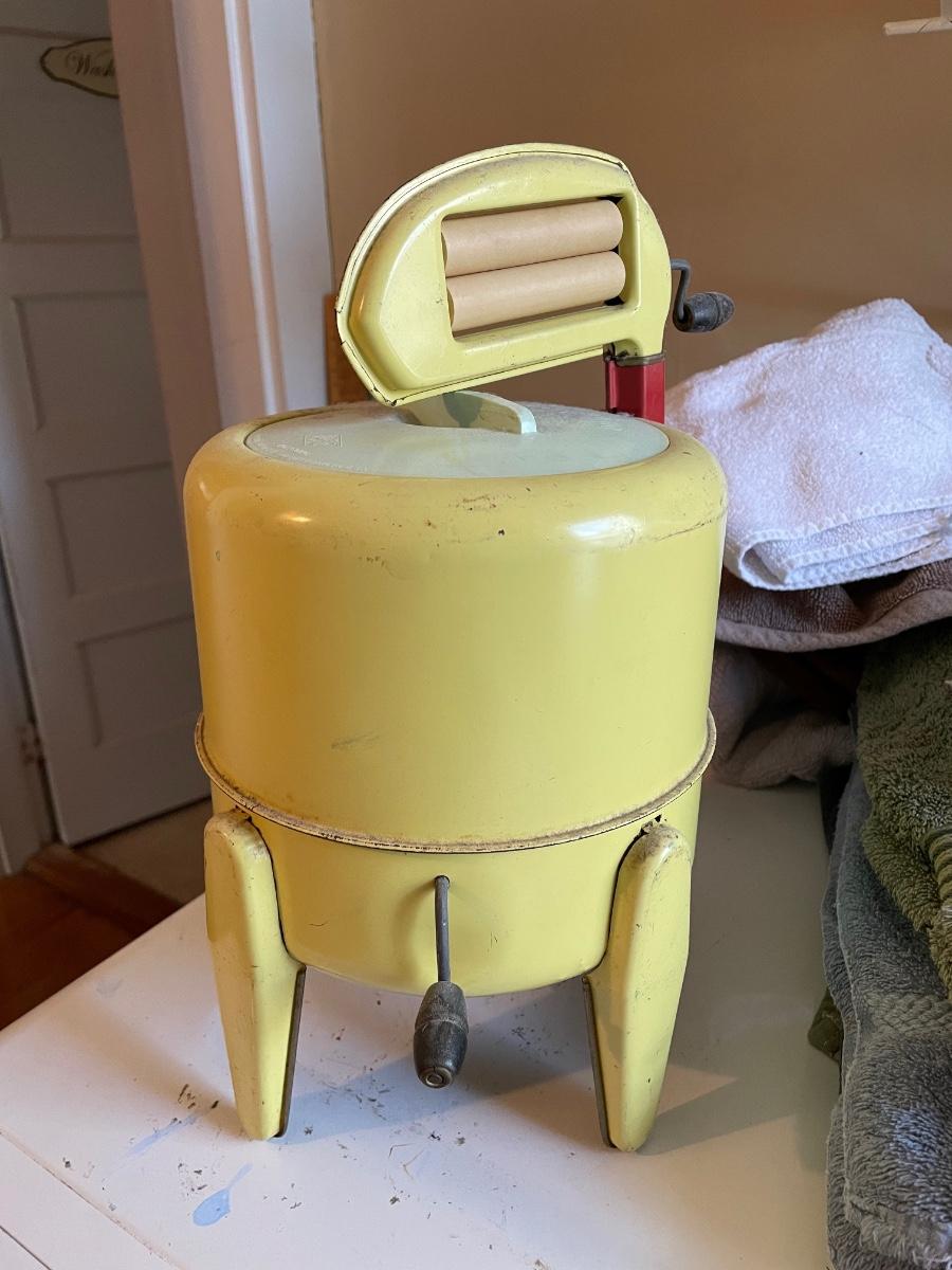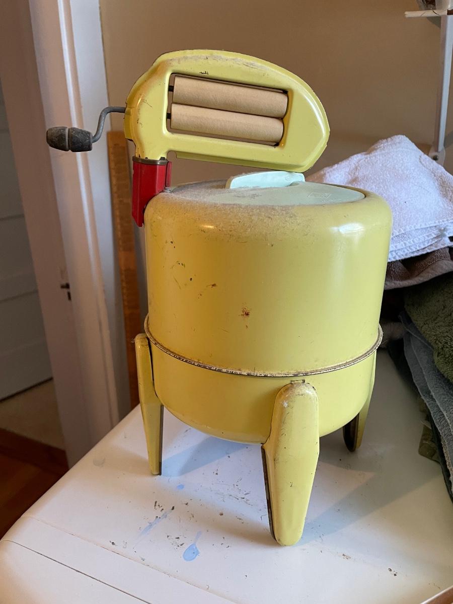 Vintage doll washing machine in rare yellow color. Has wear.