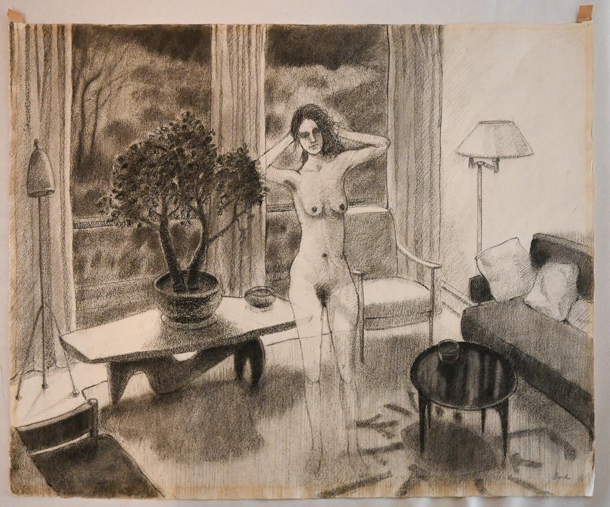 A nude woman drawing by artist Gibson Byrd (American, 1923-2002). Mixed media. Approx. 20" x 27.5".