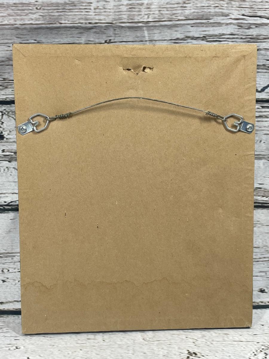 This item is in great condition and has no noticeable damages to it. It is measured as a 9x11.5. The frame has some spots of discoloration and the back of it has a small hole. It comes with a wire on the back to hang the picture.