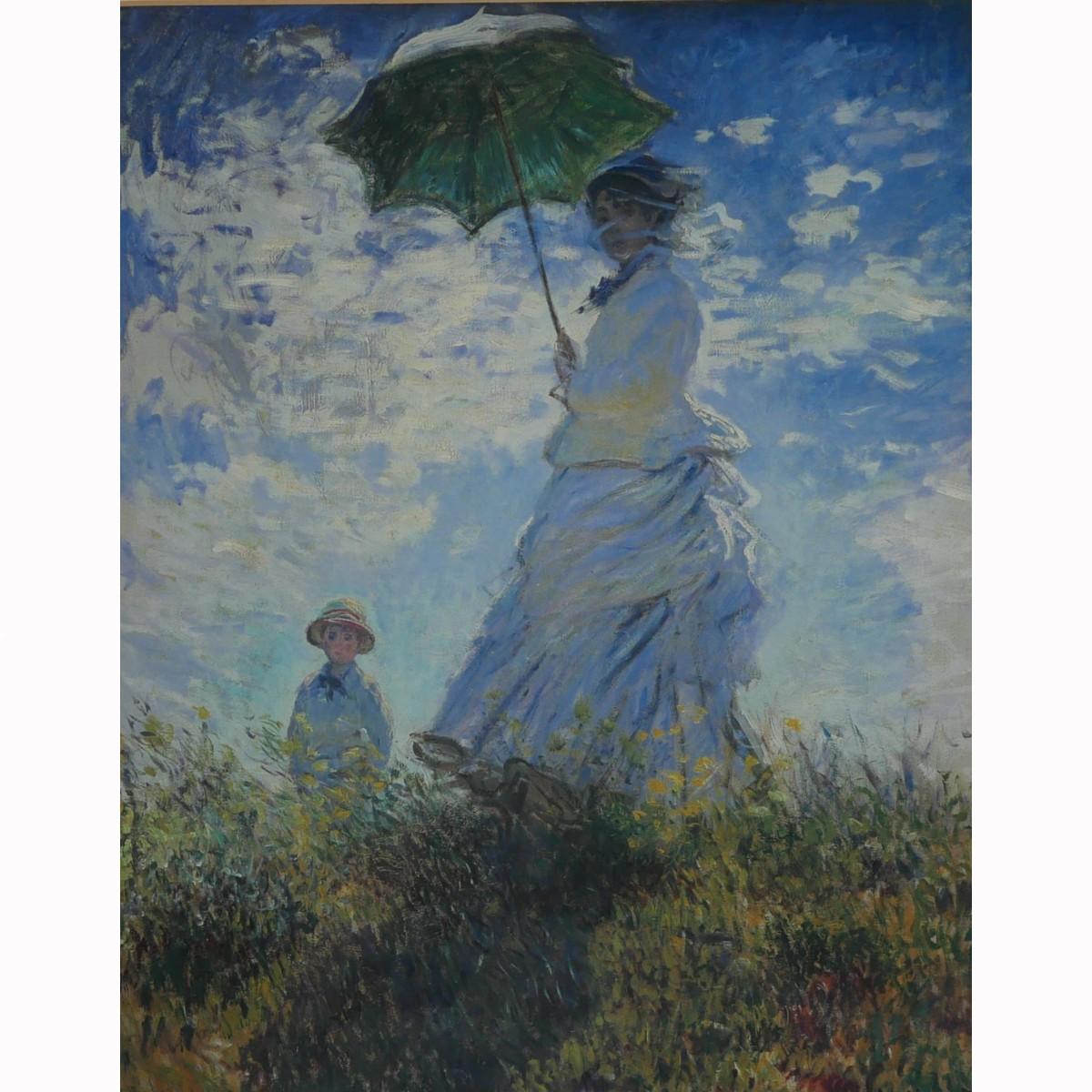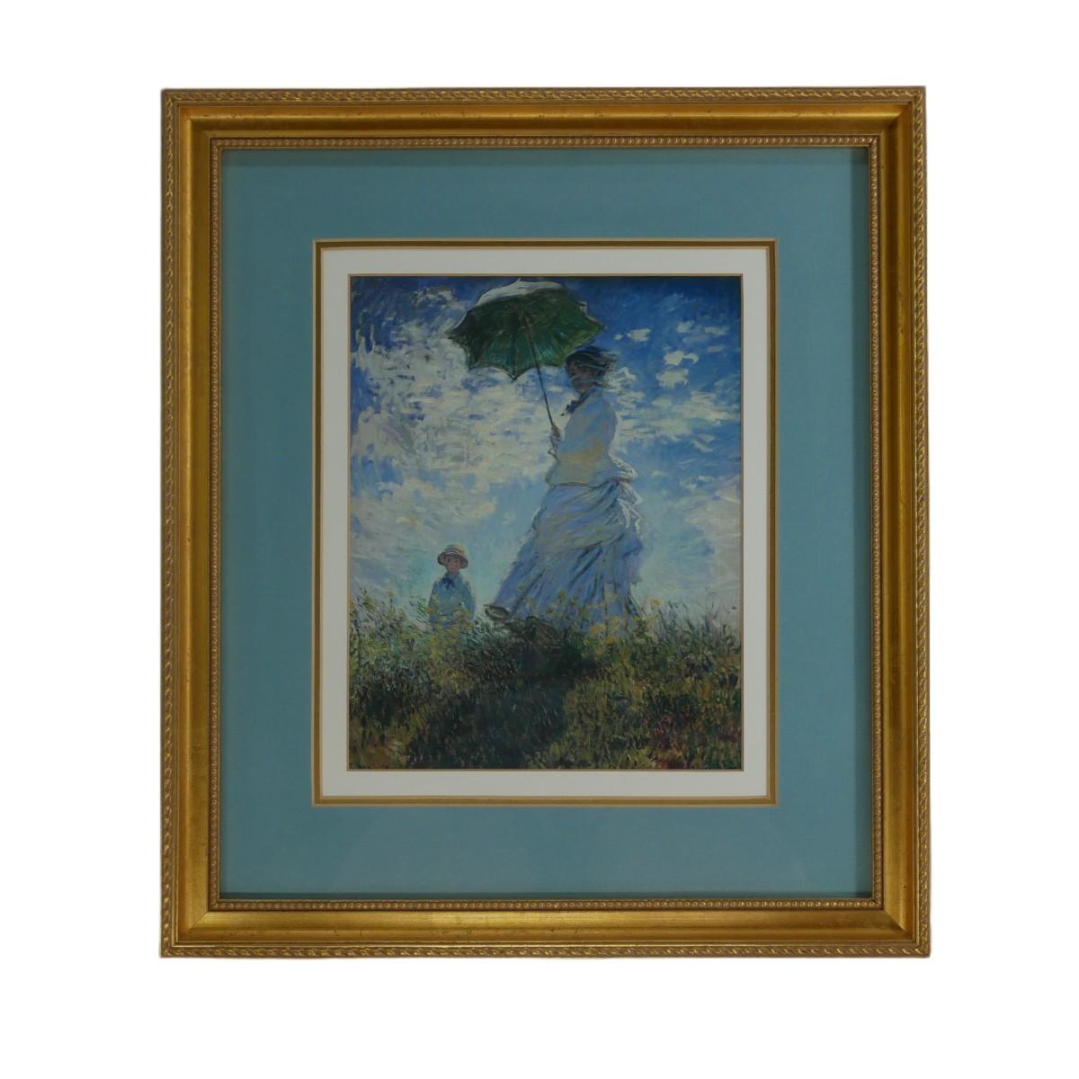 Framed print of Monet's "Woman with a Parasol" originally oil on canvas, 1875. Subjects are his wife, Madame Camille Monet, and his son, Jean Monet. Work is also known as "The Stroll". Professionally framed with gold frame and blue matting. Excellent condition! Artwork is 8.75" x 10.75", total frame is 16.5" x 18.75" x 1". (A11)