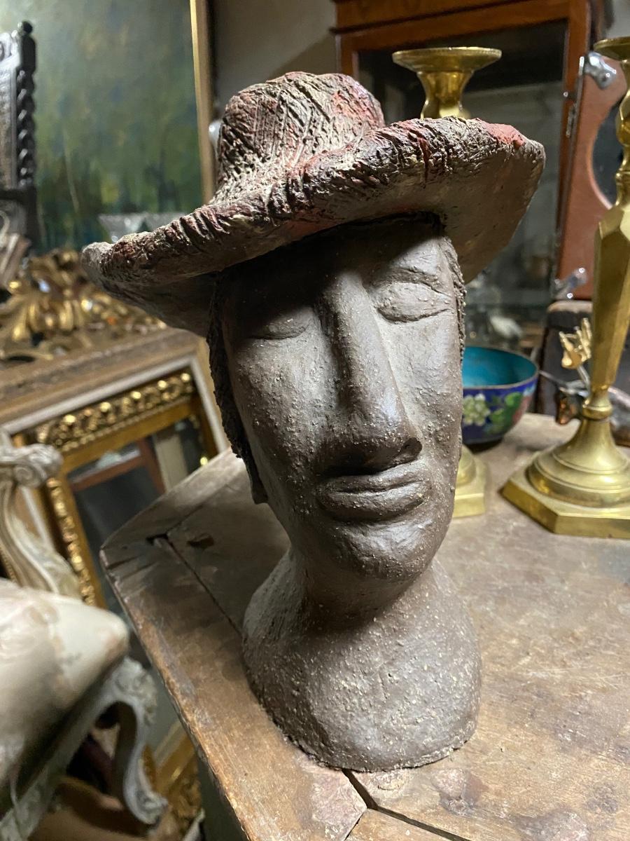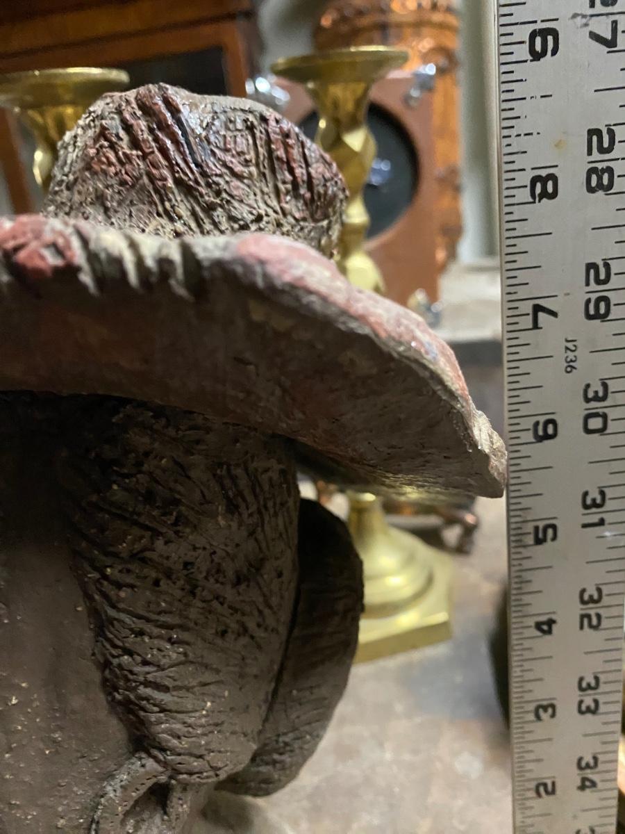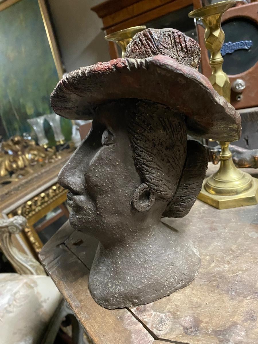 9" sculpture of woman wearing hat, eyes closed. Solid piece with details in hat and bun. Indentation on top of hat, would make a crazy candle holder!