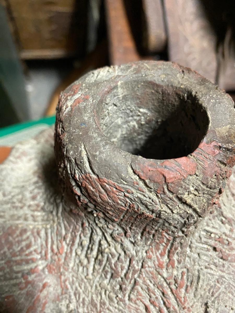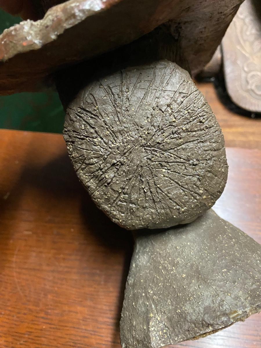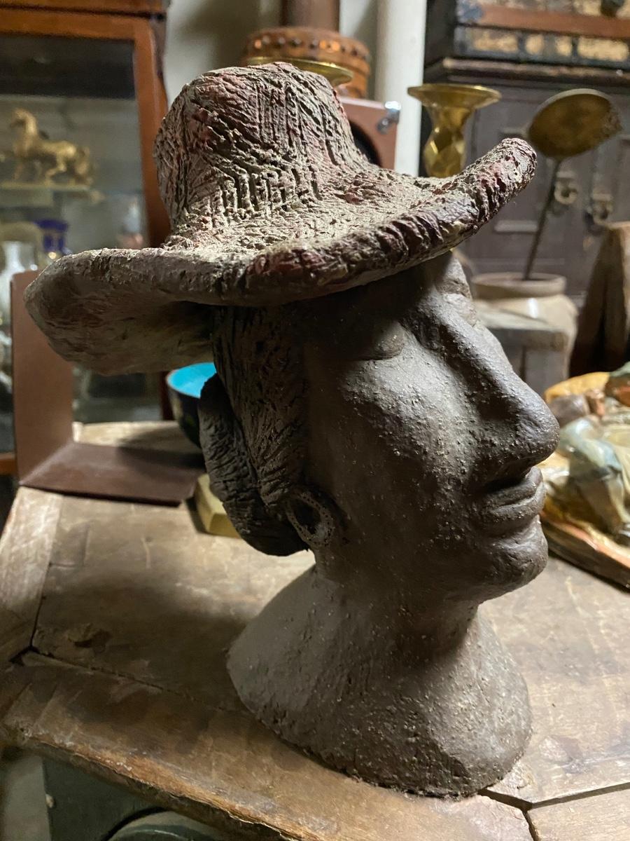 9" sculpture of woman wearing hat, eyes closed. Solid piece with details in hat and bun. Indentation on top of hat, would make a crazy candle holder!