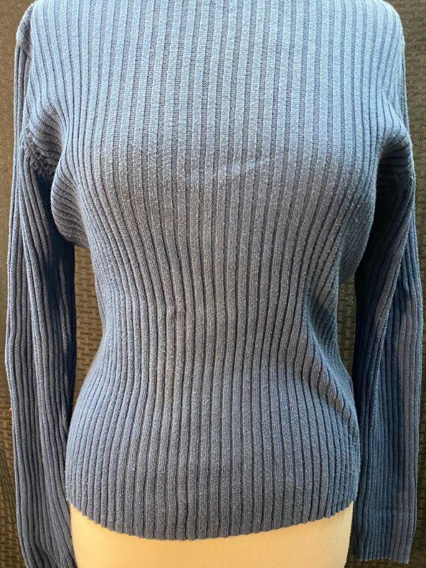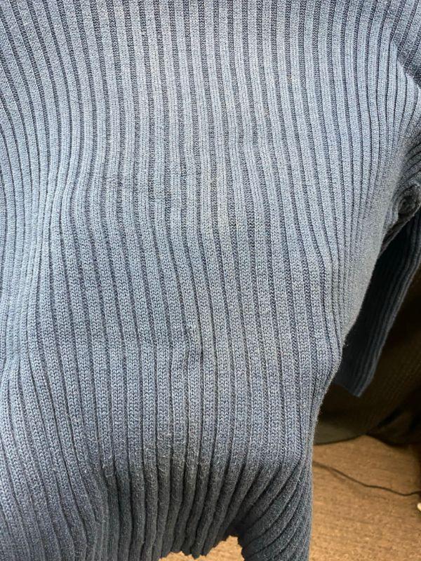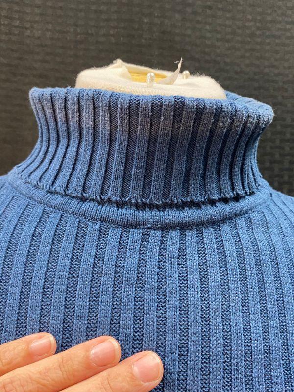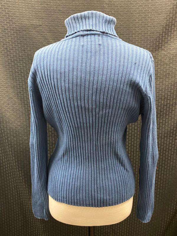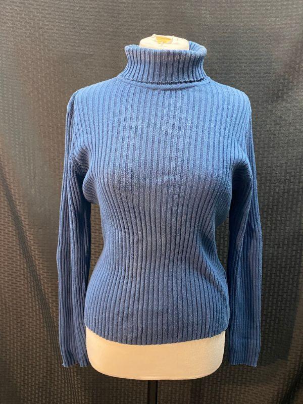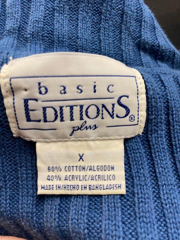 Woman's Basic Editions Plus blue turtleneck sweater. Ribbed with long sleeves. Size X, looks on the smaller side. There is some discoloration around the neck and shoulders. Also on the front it seems to be discolored. Unsure if the discoloration is due to being in a packed closet dusty or not. No holes.