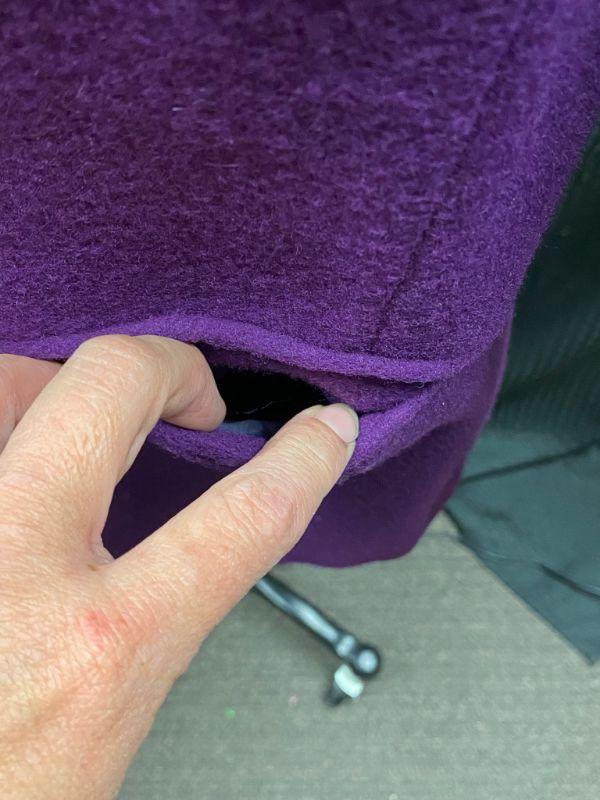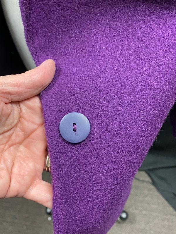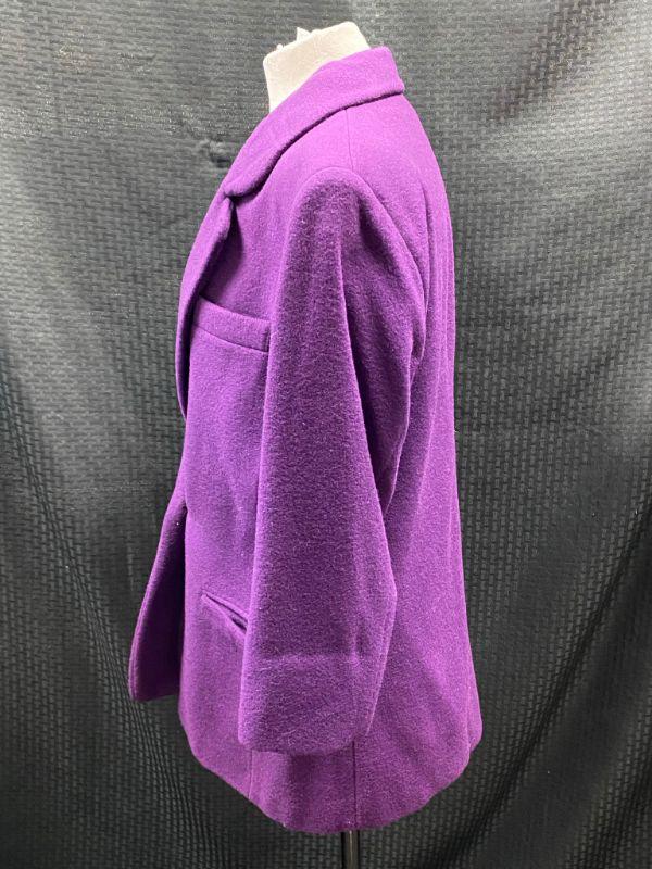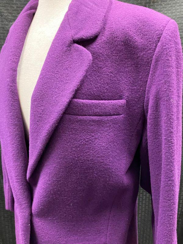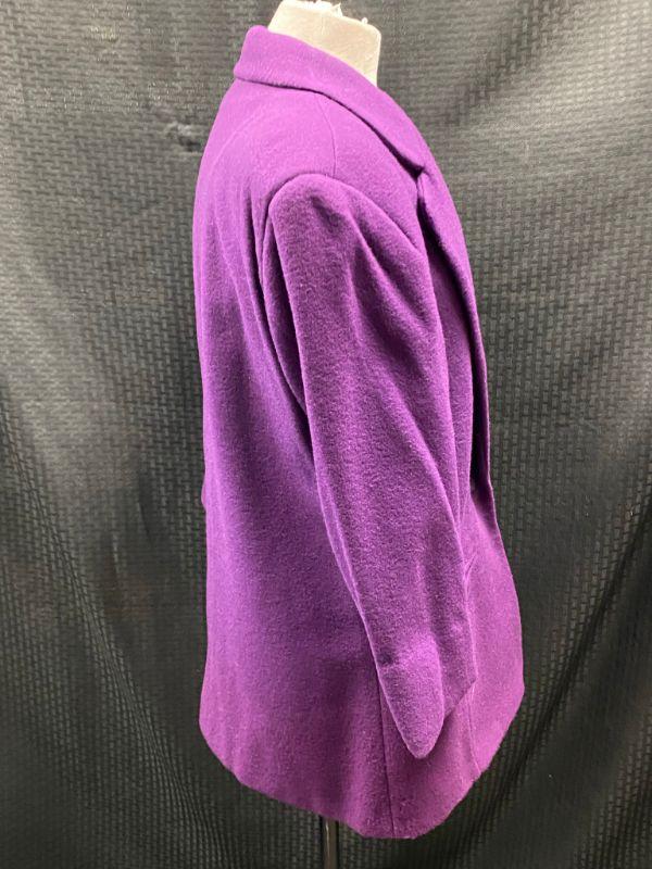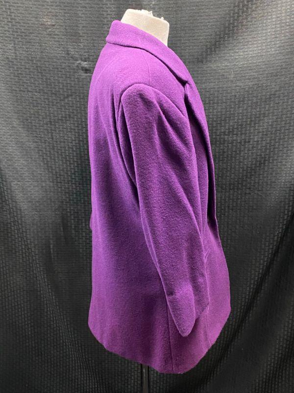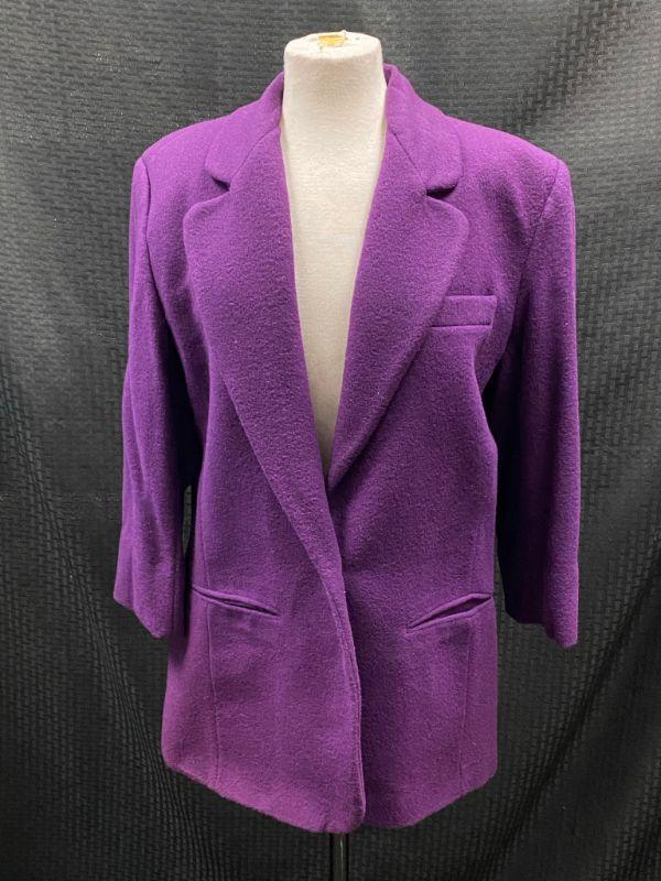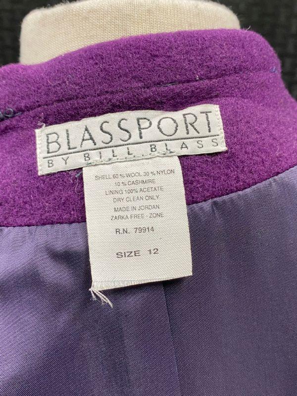 Blassport by Bill Blass woman's blazer. Purple wool blend. Single button closure. Front pockets and breast pocket. Size 12. Good condition, no holes, spots, or snags. May be dusty from storage.