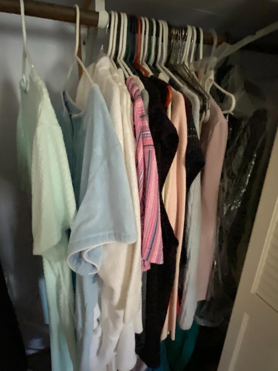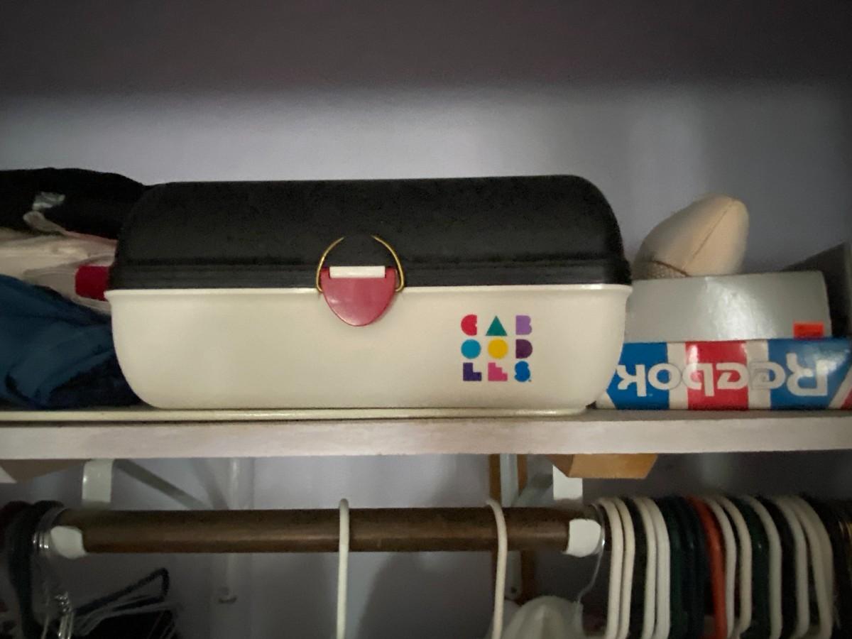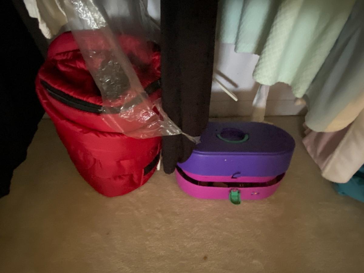 Contents of Closet, Including Womans Clothes, Caboodles Vintage Makeup Caddies, Shoes, Sleeping Bag, and More as Pictured
