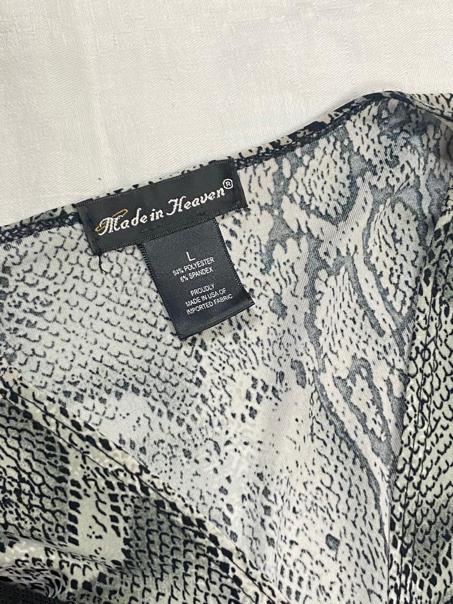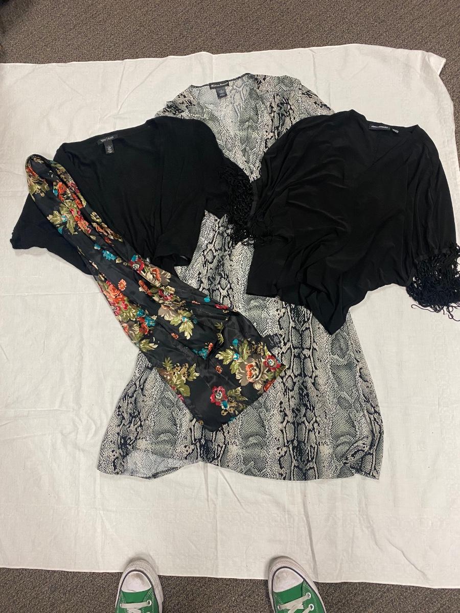 Woman's Date Night Dress Shrugs Sweater Scarf Outfit Lot Size Large. Reptile print v-neck dress, two shrug sweaters and a floral scarf. Dress and shrugs are size large. Everything in good condition.