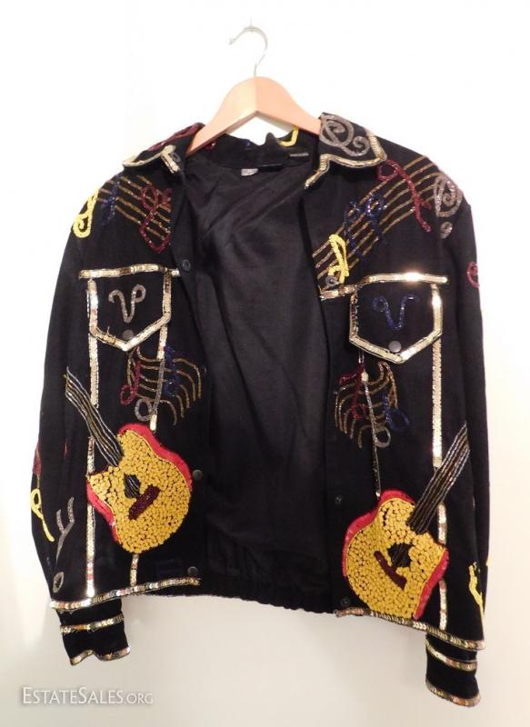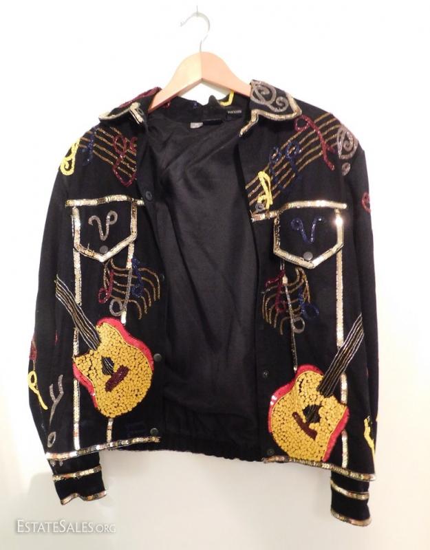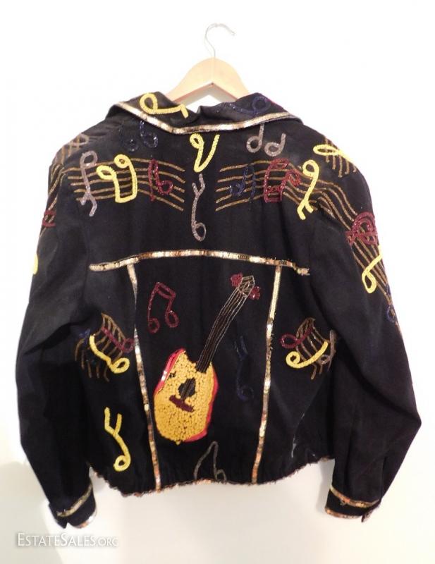 Woman's jacket beautifully hand decorated with guitars and music staff. Black with brilliant color mix. with beads. By Modi size M. In very good condition.