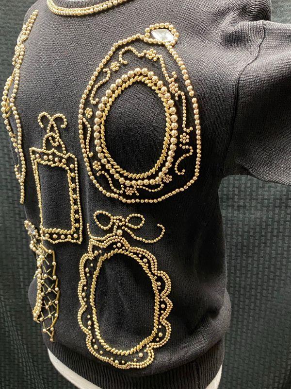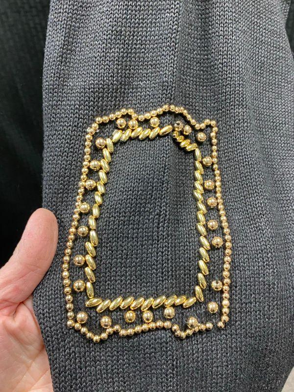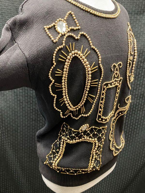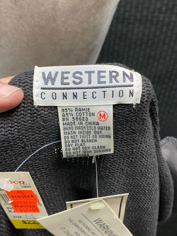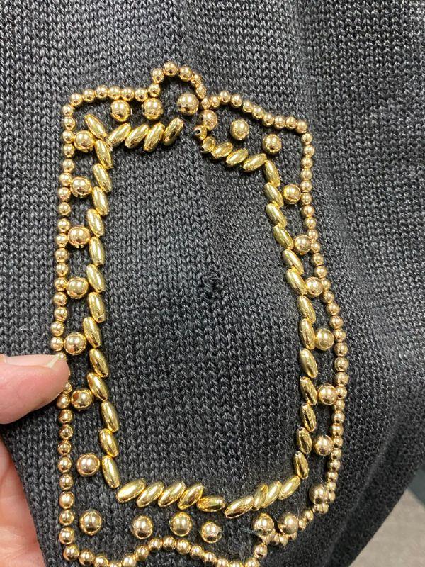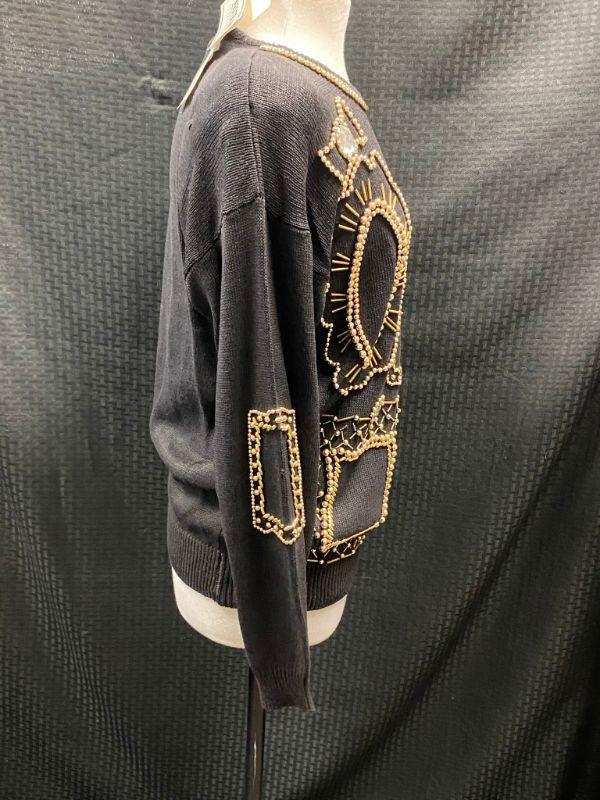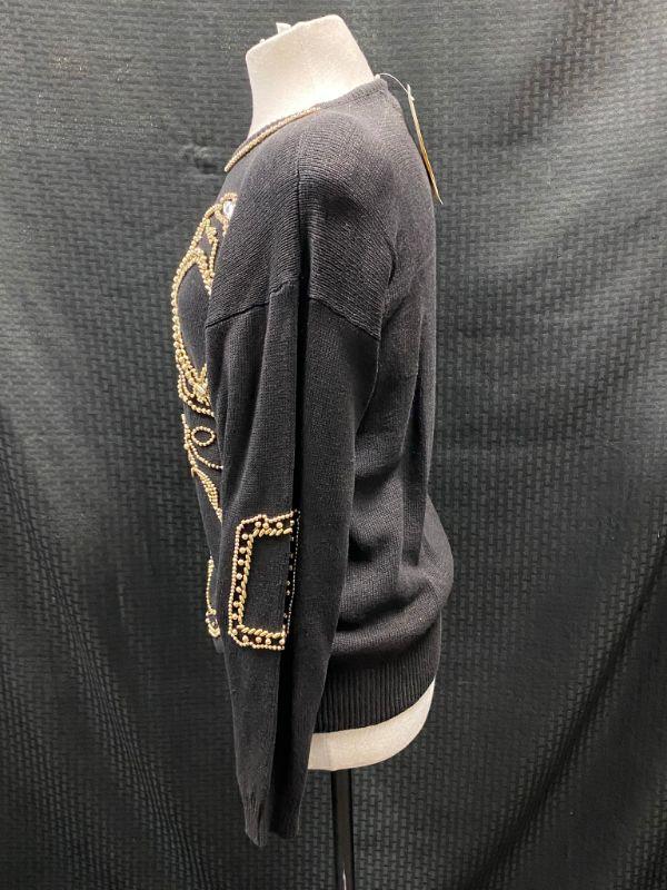Woman's beaded sweater by Western Connection. Black sweater with gold beaded picture frame design. Size Medium. Has original sales tags attached. Unfortunately there are two moth holes, one in the back, one in the sleeve, not too bad, possibly stitchable.