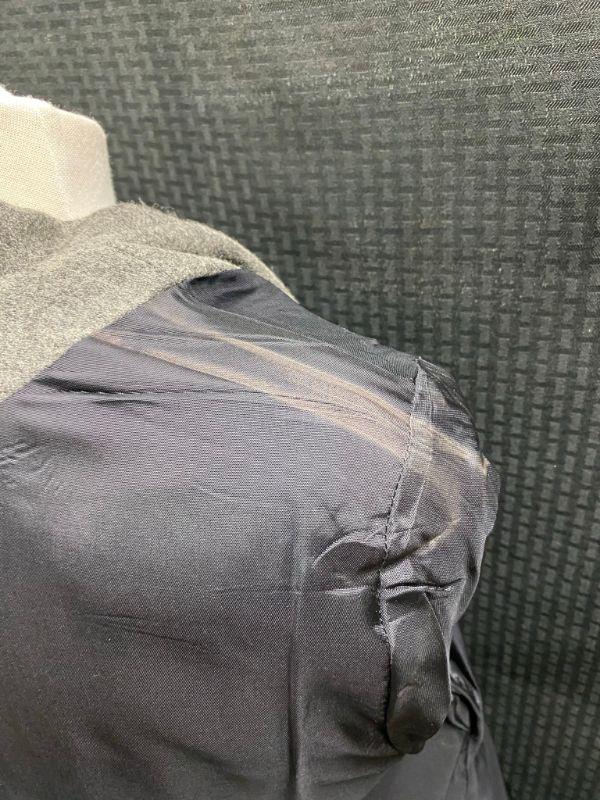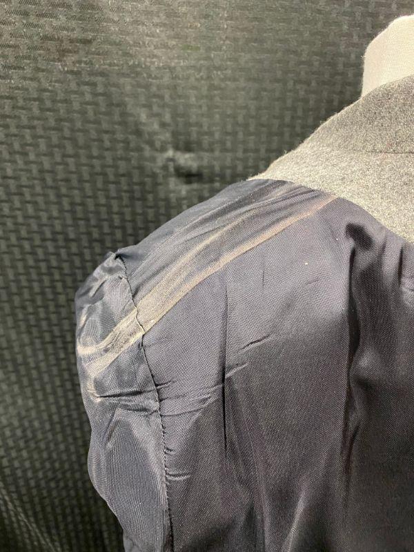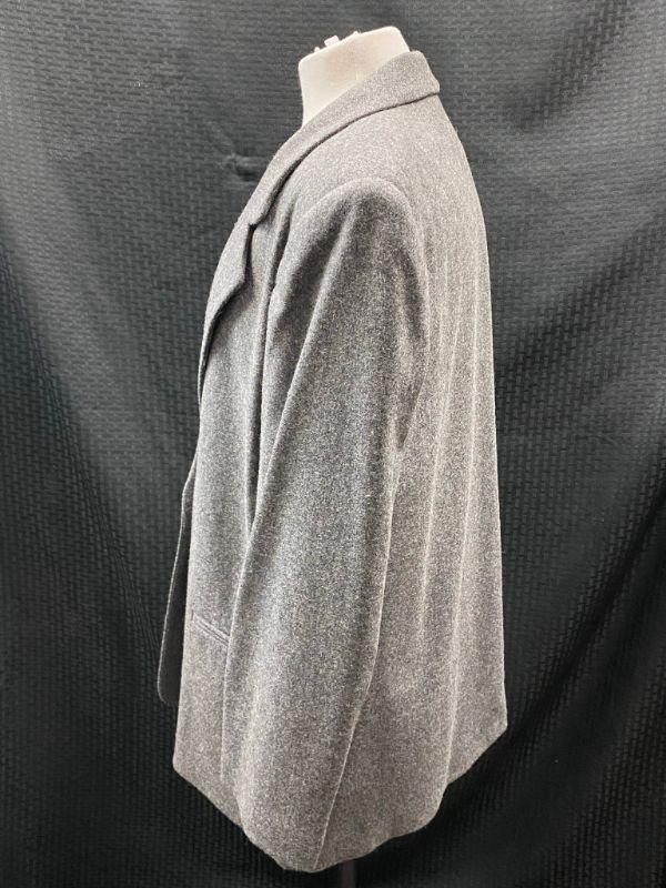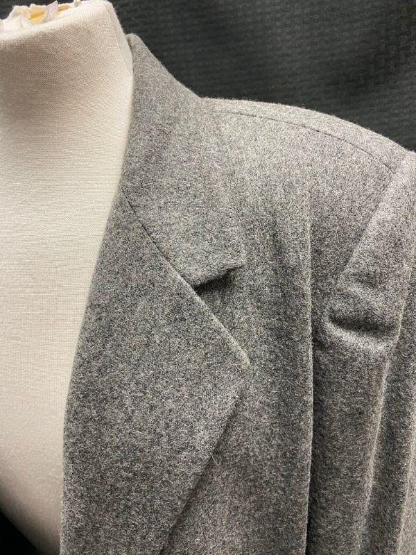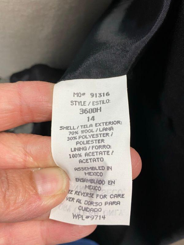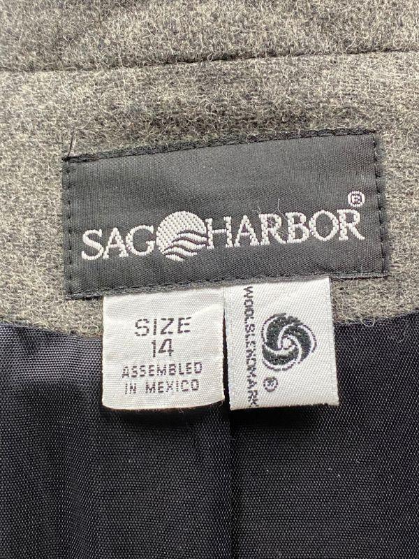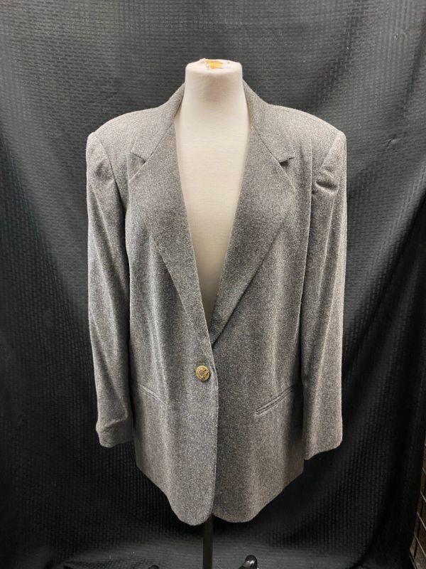 Woman's Sag Harbor wool blazer. Heather grey, wool & polyester blend. Single button closure, false pockets. Size 14. Good condition, no holes, spots, or snags. It needs to be cleaned. The inside shoulders are dusty from the hanger padding.