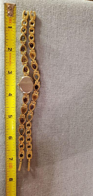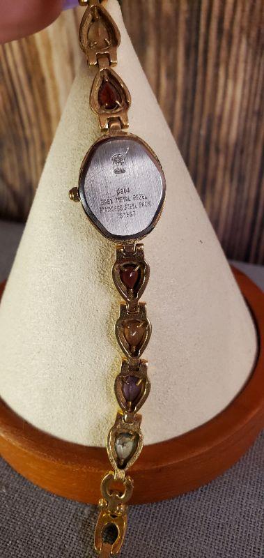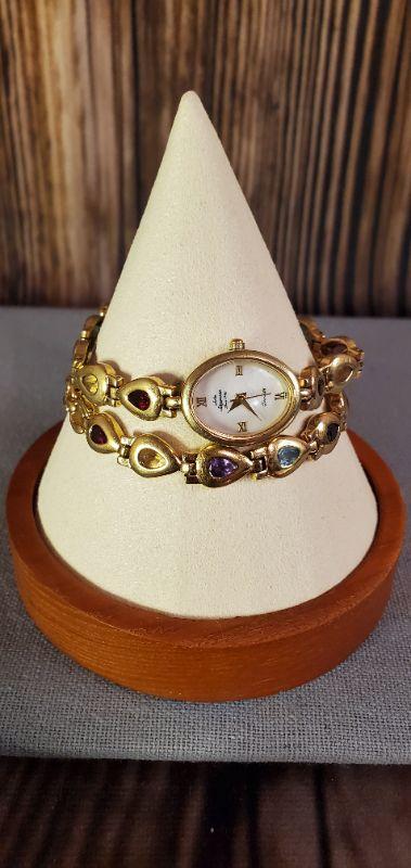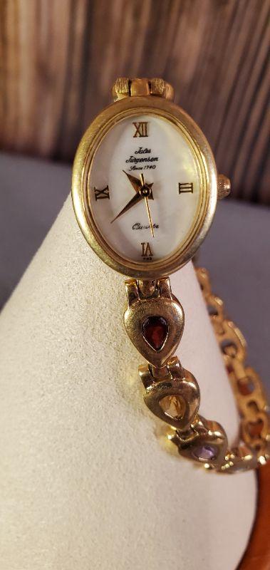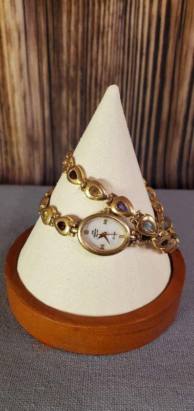 Vintage signed jules jurgensen ladies watch and matching bracelet with Amethyst, blue topaz, garnet, and peridot gemstones.