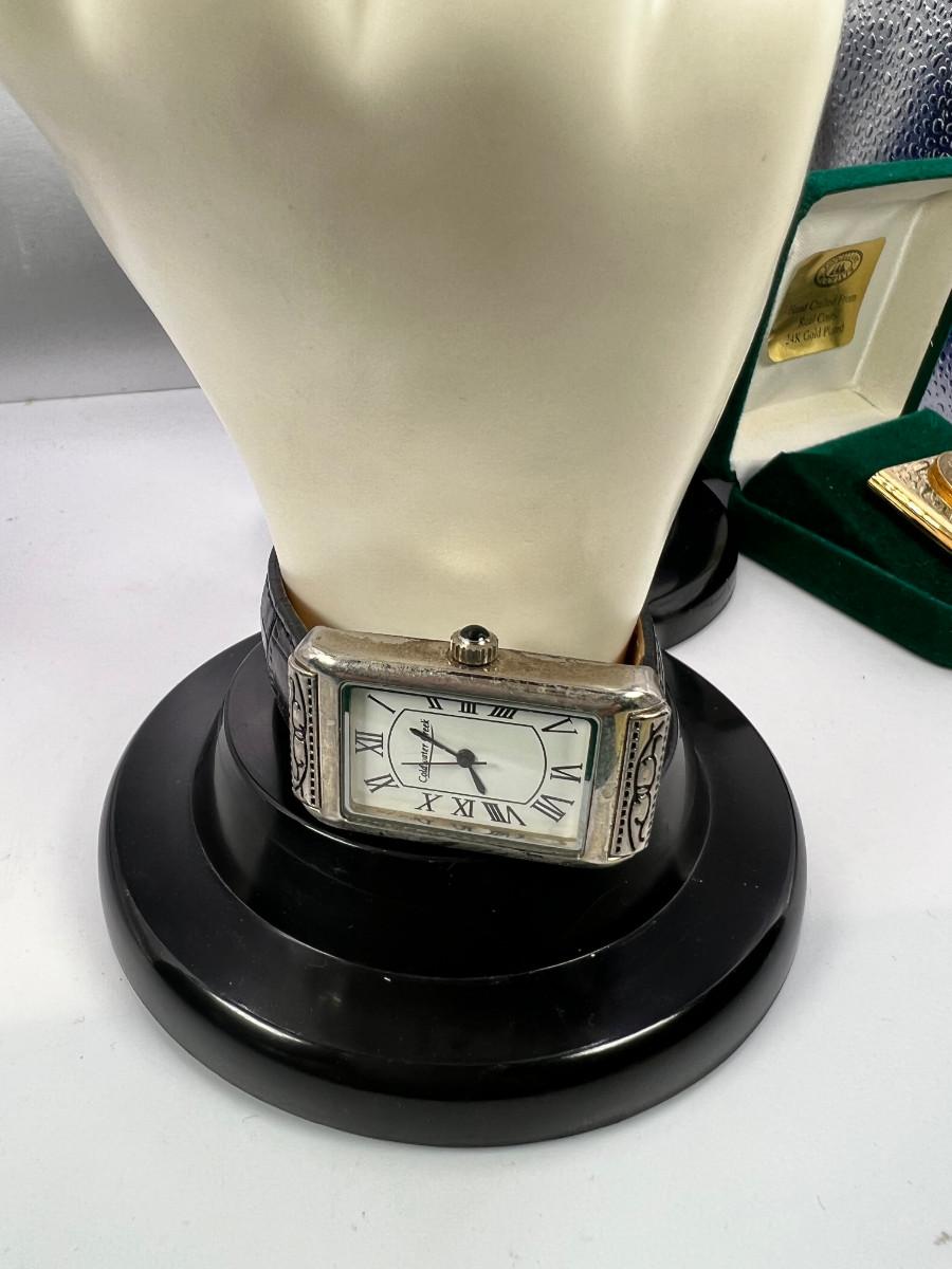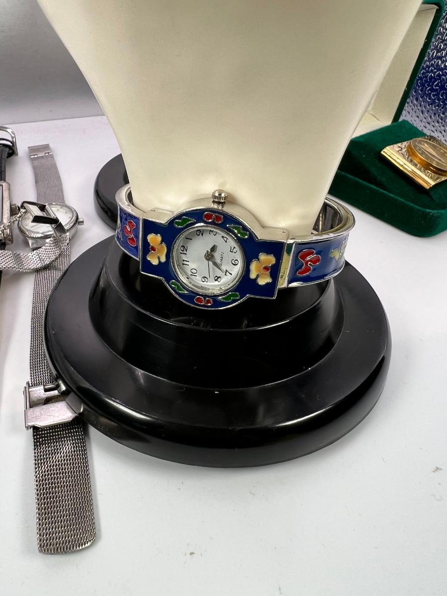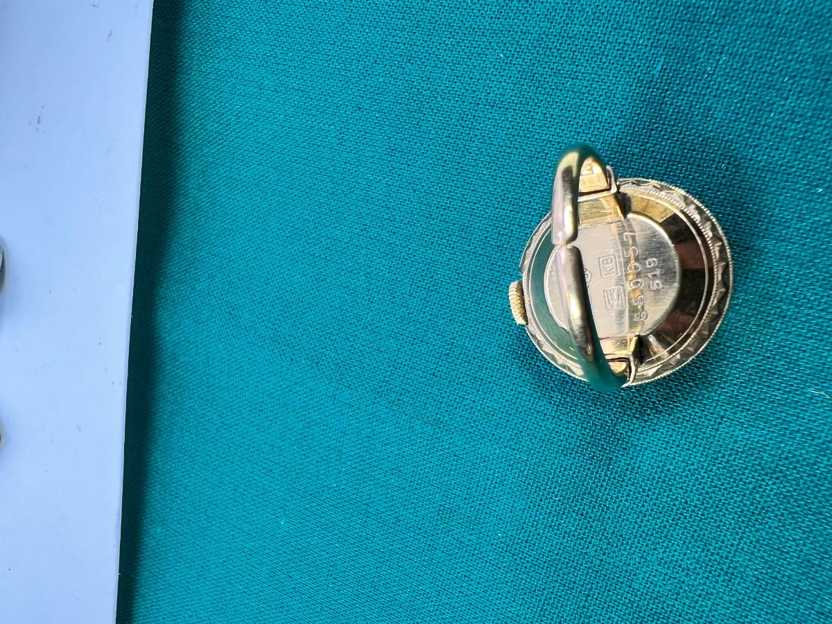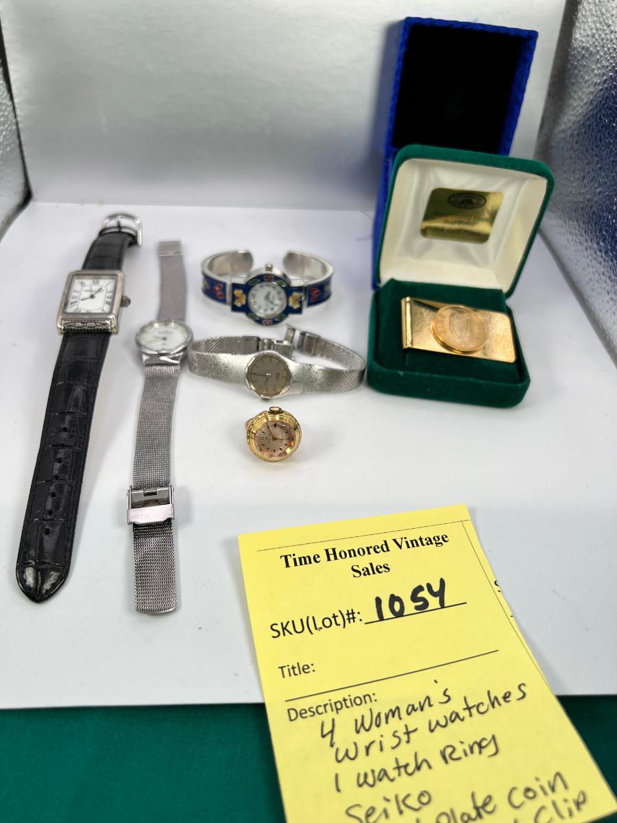 3 woman's wrist watches and 1 watch ring, 1 watch bracelet, and a 24K GF money coin clip.