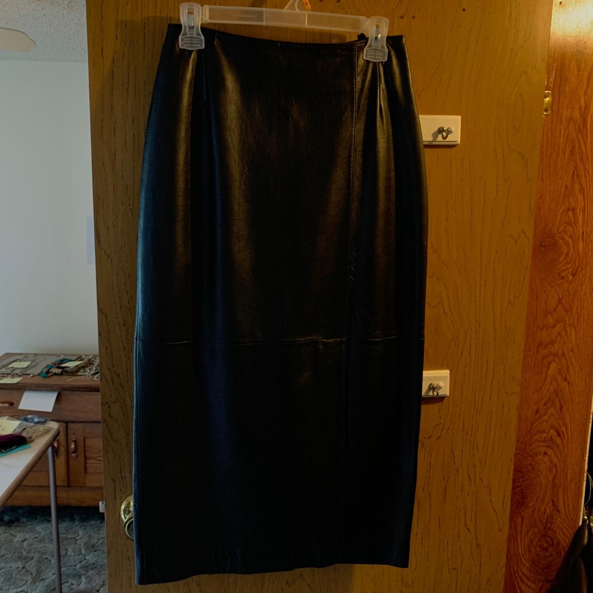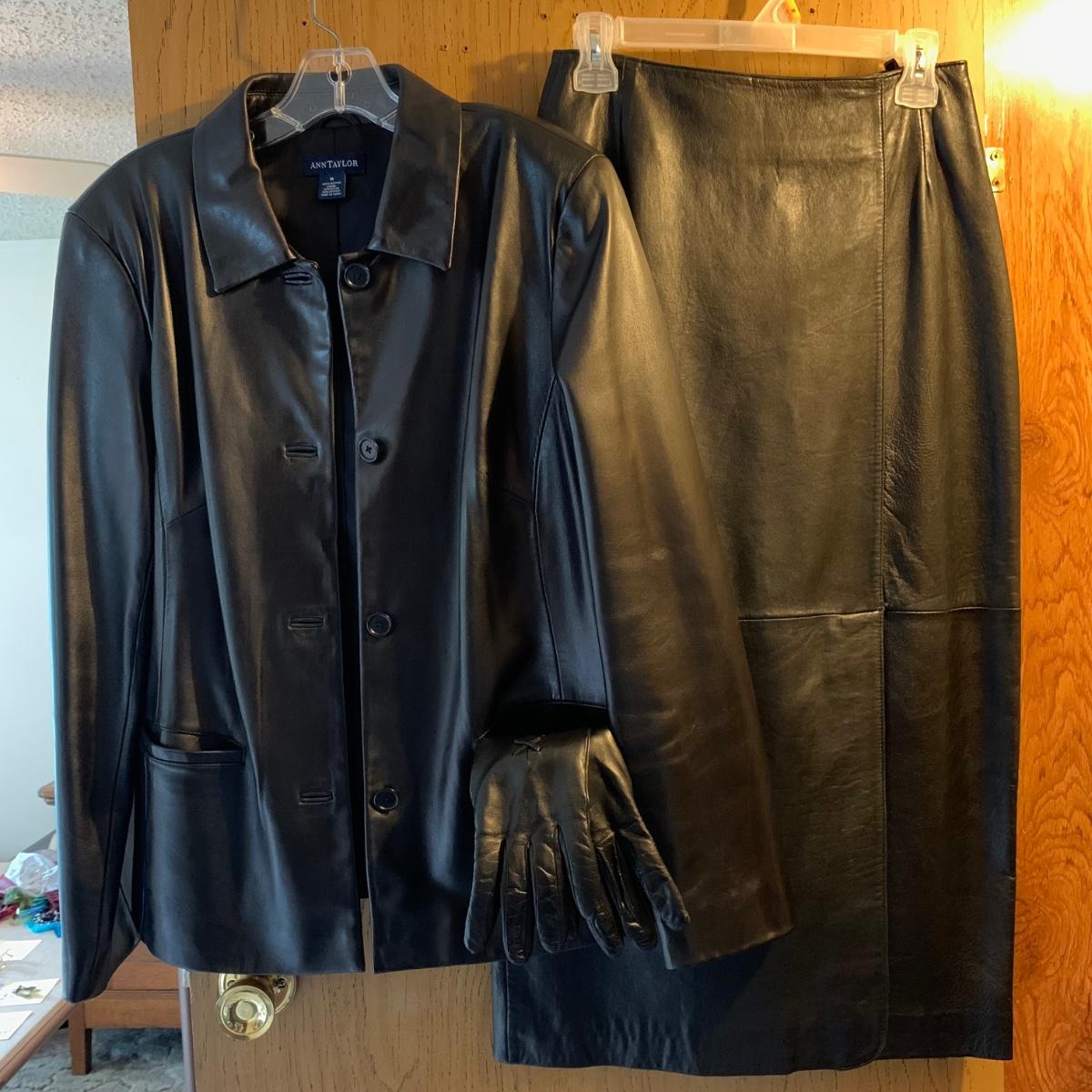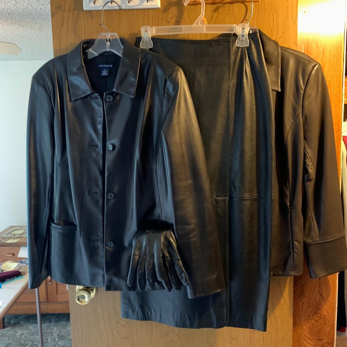 Two Ann Taylor 100% leather jackets, one button down black and one zippered dark brown, both size M. One pair of Ann Taylor genuine sheepskin gloves with yak, wool, & cashmere lining, size M. One black 100% leather Casual Corner skirt, with front and back slits and a zipper closure, size 6. All in very good condition. Shipping available.