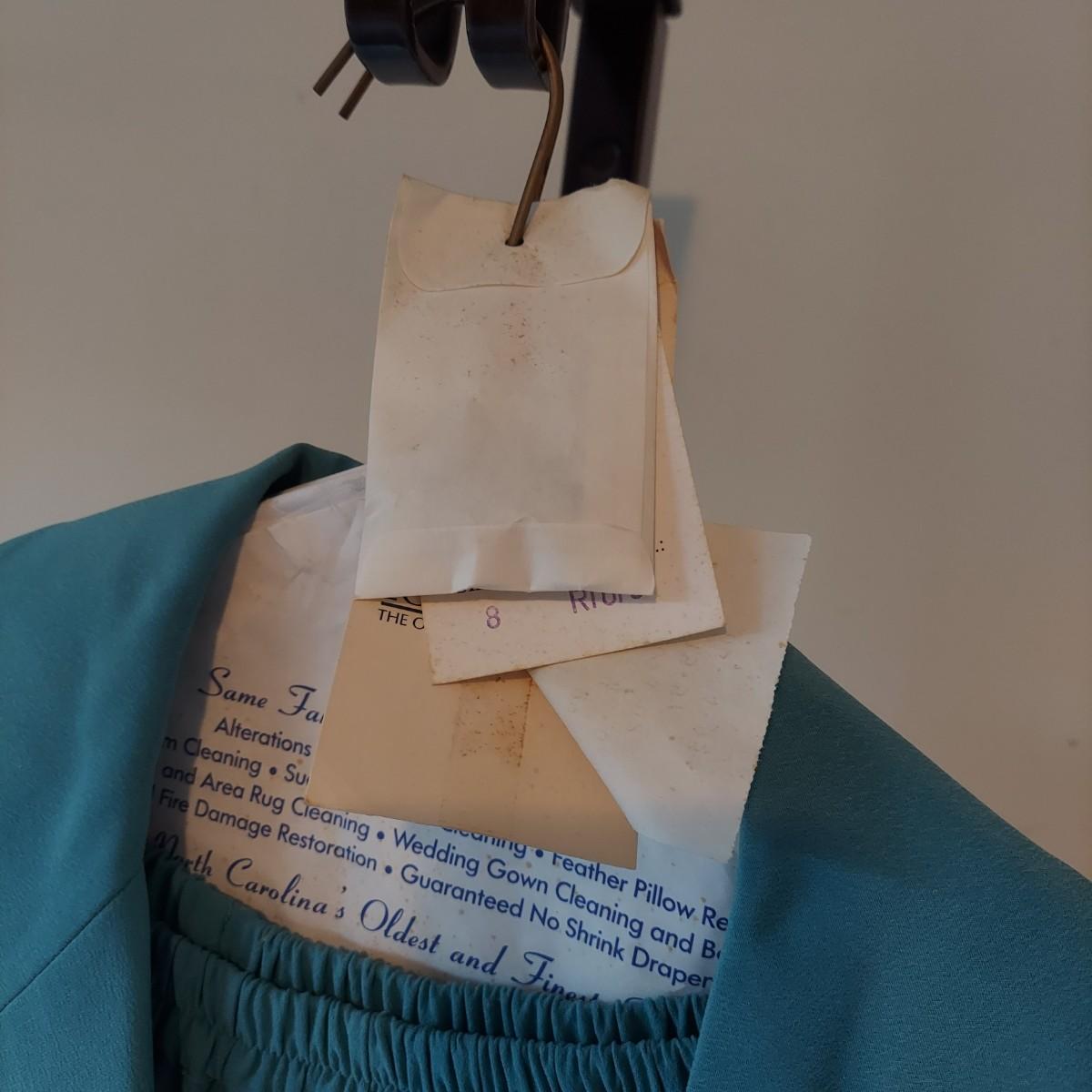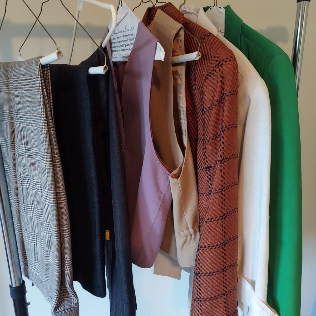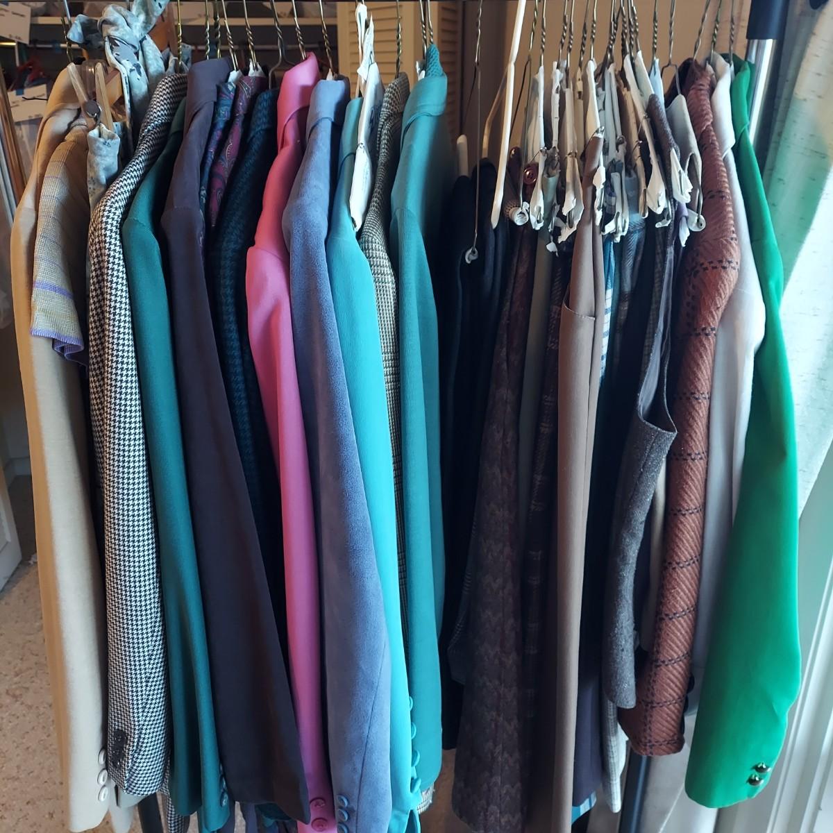 Lot includes approximately 30 pieces of clothing from the 1970s/1980s including suits, suit separates and matching sets in what appears to be size small. Please see photos for details. Shipping available. Clothing racks are props and are not included in the auction!