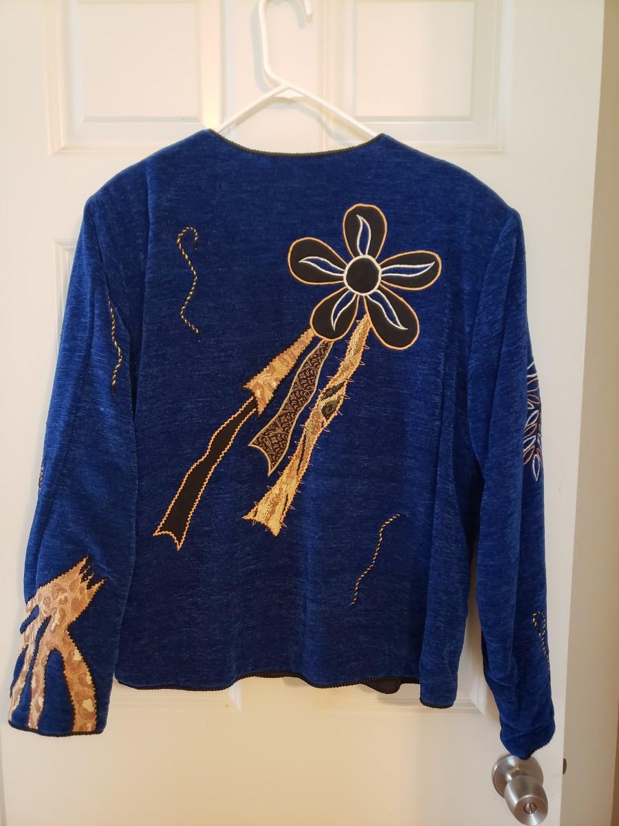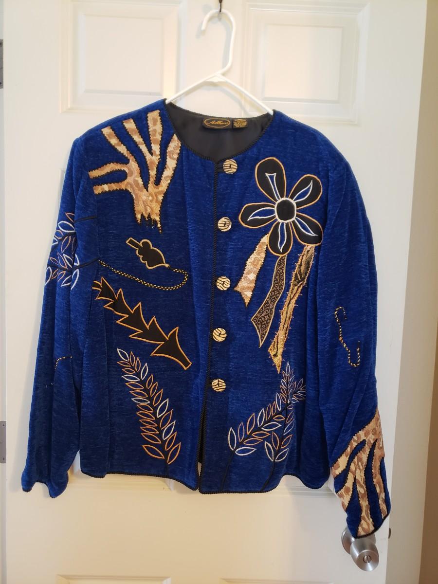 Women's Akkure royal blue appluqued & embroidered jacket. Size XL.