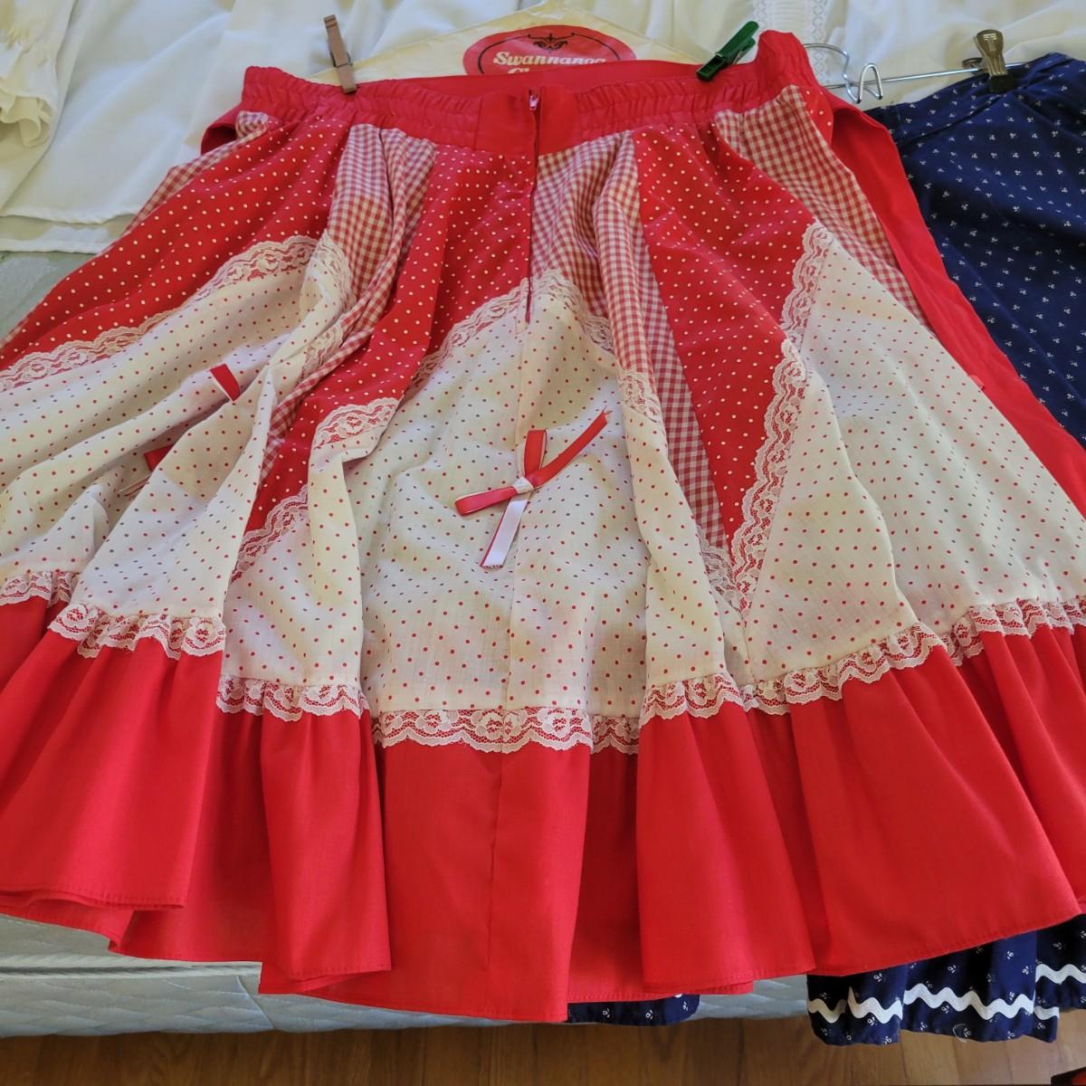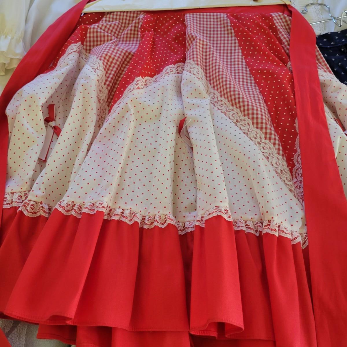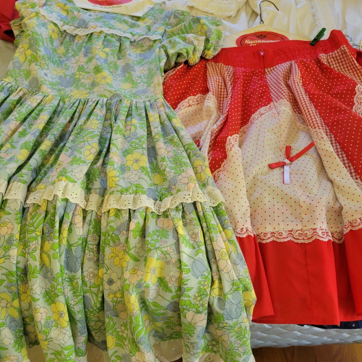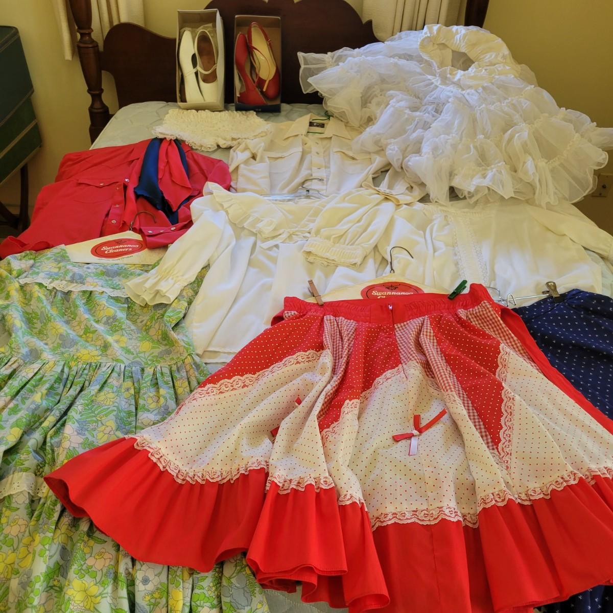 An assortment of women's and men's square dance clothes in good condition. One white shirt amd the red shirt are the men's pieces and are XL. Women's clothes are multiple skirts, a dress, some ruffled bloomers and a ruffled petticoat. Shirts are sized M and the skirts and dress appear to be handmade and do not include sizes. Also includes two pairs of shoes size 9 1/2;M. Local pickup only