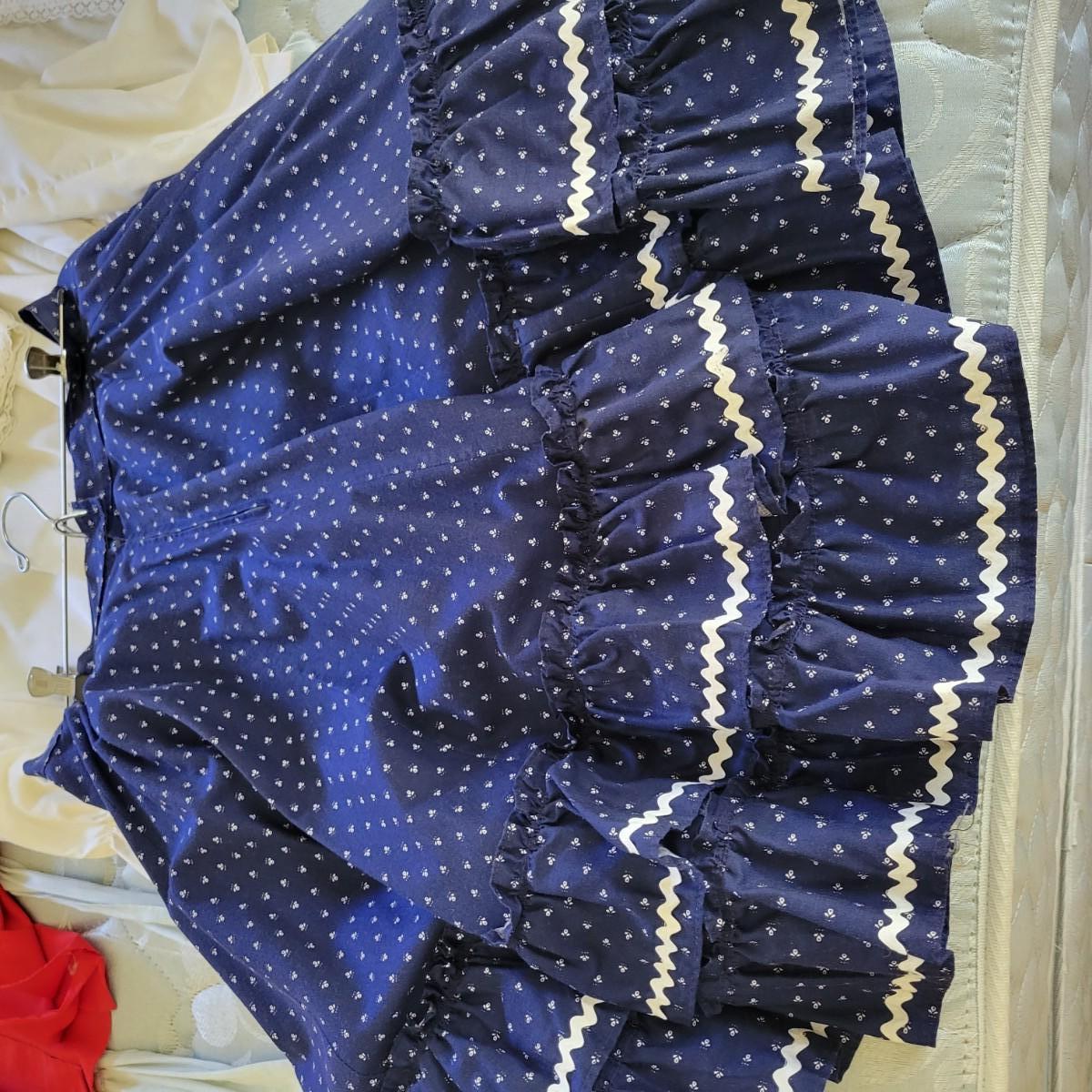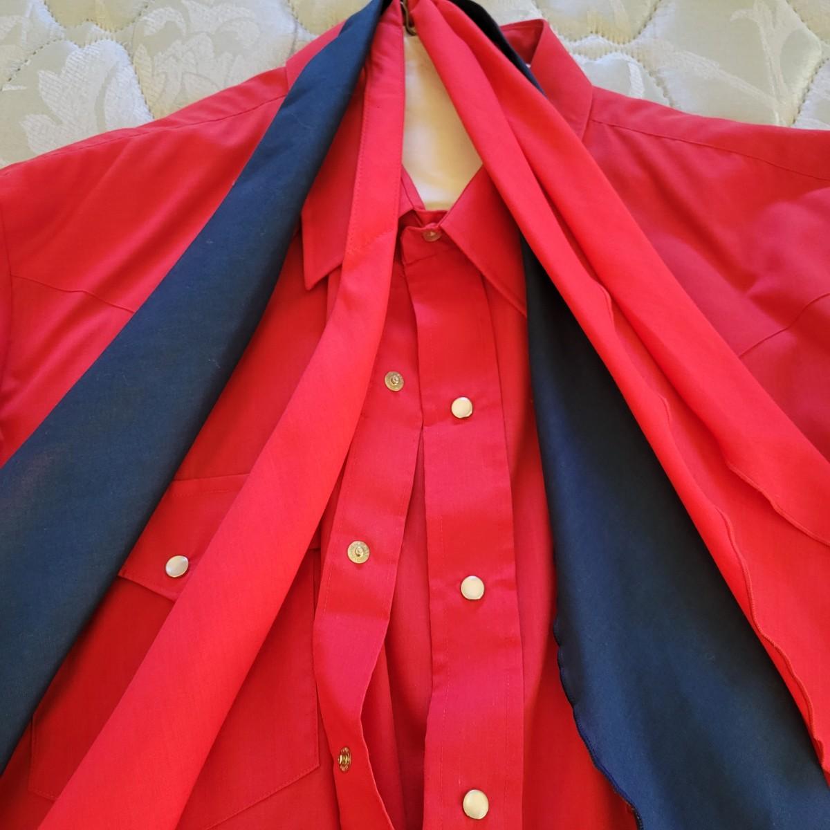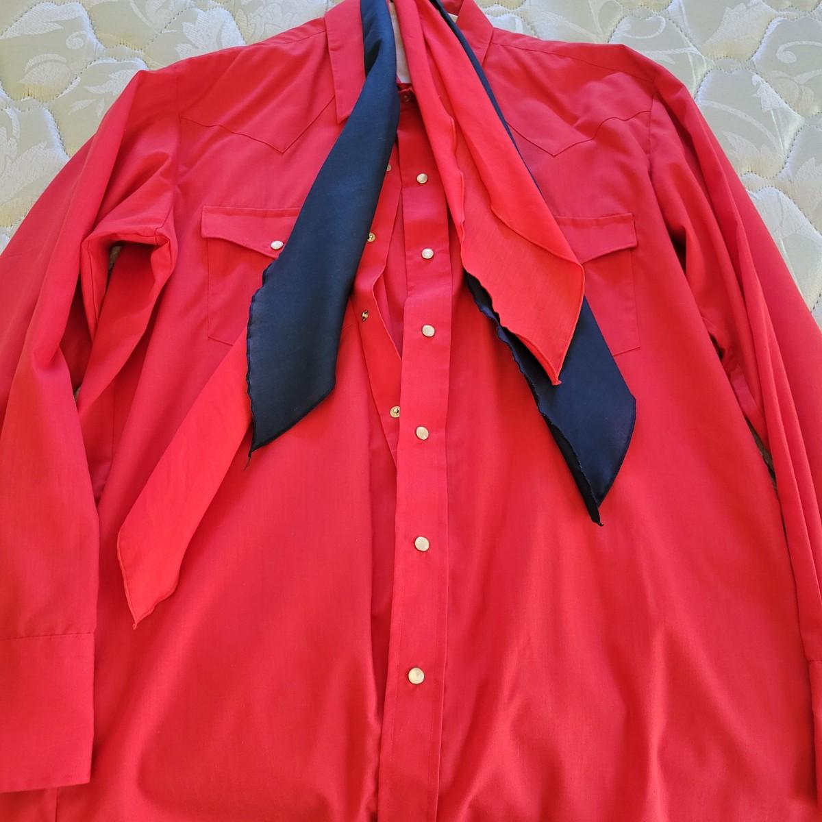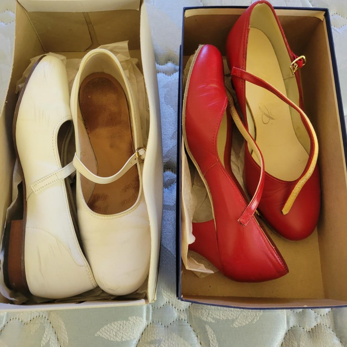 An assortment of women's and men's square dance clothes in good condition. One white shirt amd the red shirt are the men's pieces and are XL. Women's clothes are multiple skirts, a dress, some ruffled bloomers and a ruffled petticoat. Shirts are sized M and the skirts and dress appear to be handmade and do not include sizes. Also includes two pairs of shoes size 9 1/2;M. Local pickup only