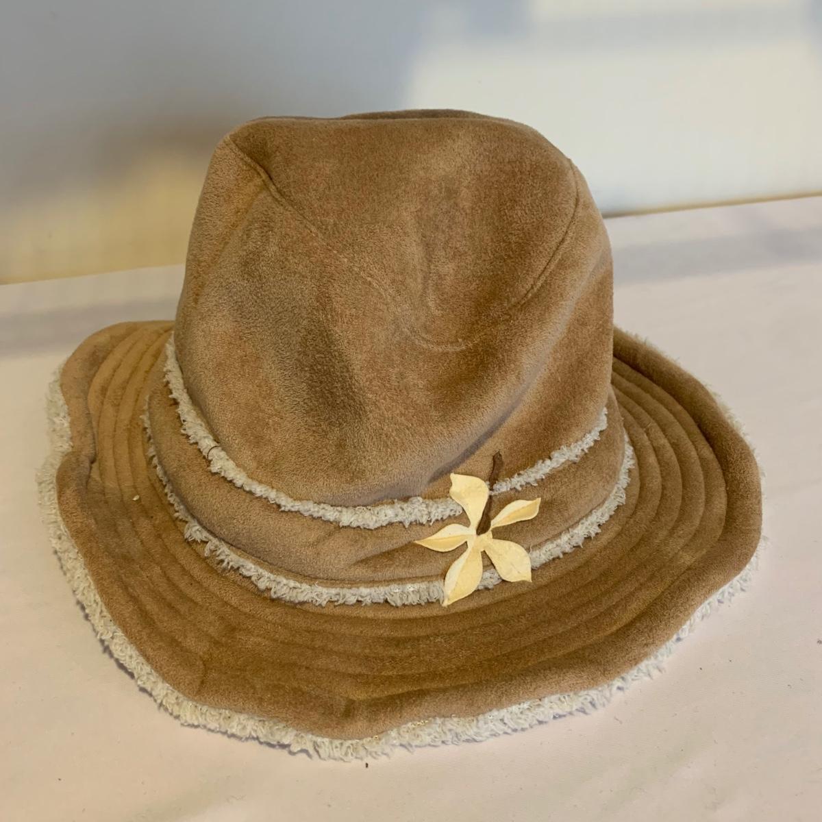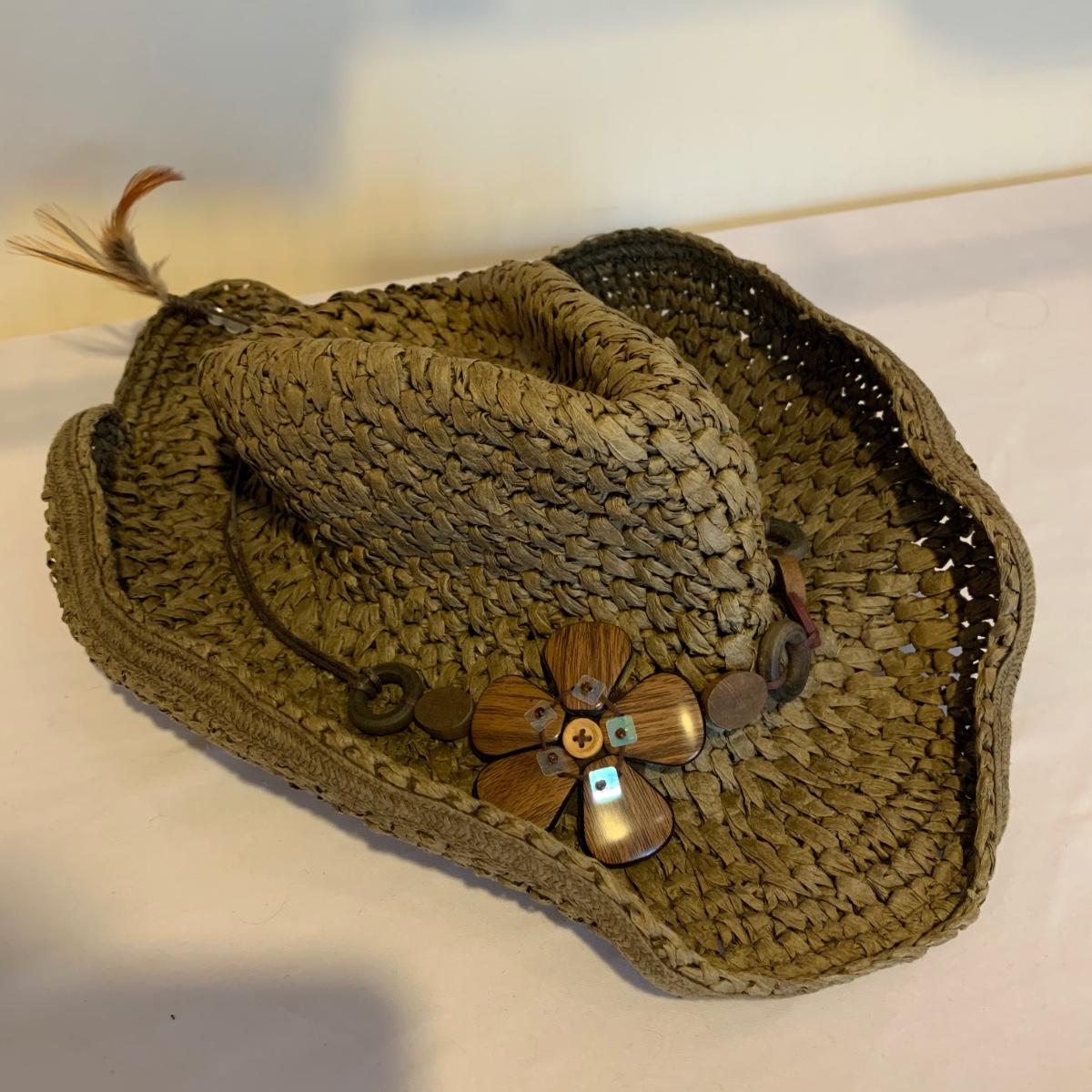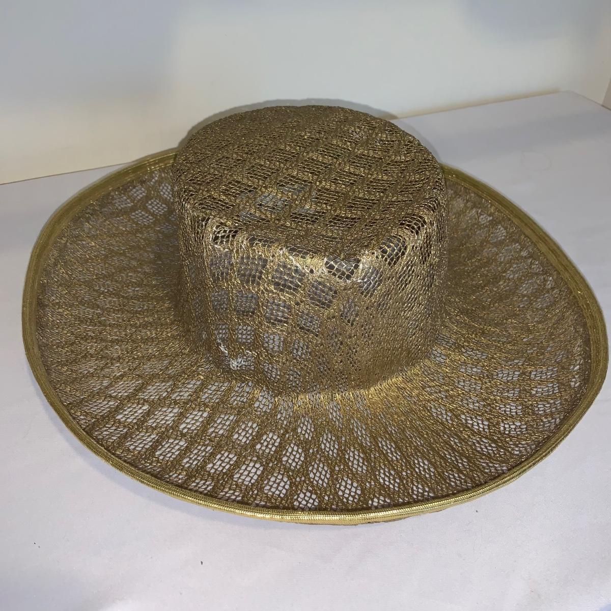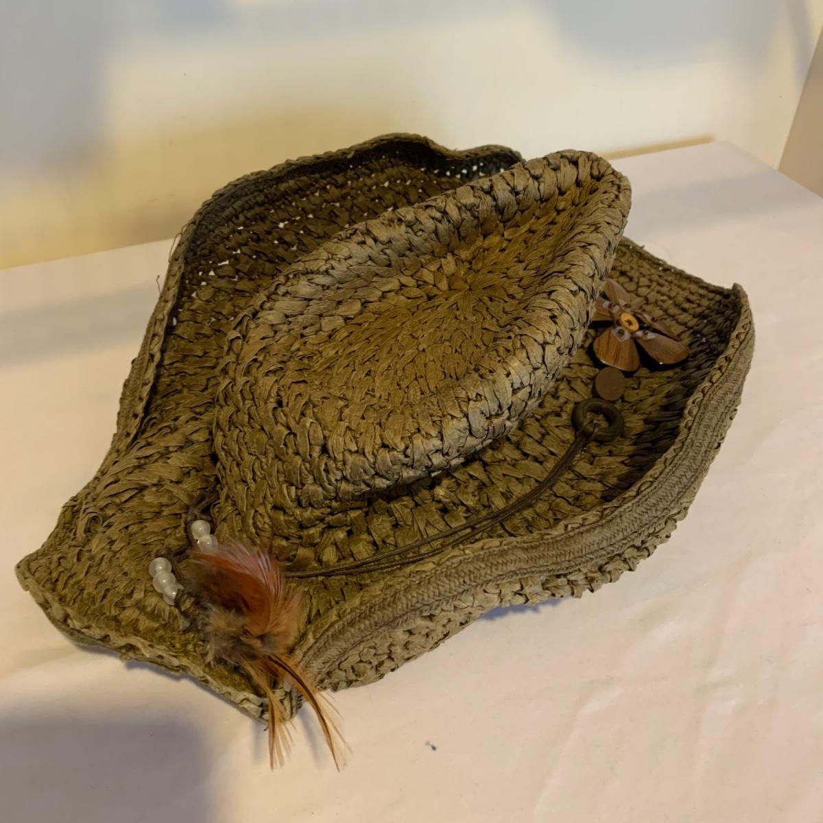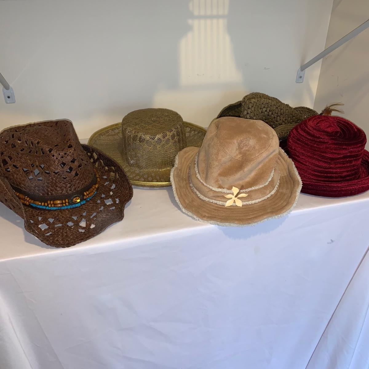 This lot includes 5 women’s hats. Included are two straw cowboy hats, one velvet material hat, one suede and fur material bucket hat, and more. All of the hats appear to be size small-medium. The largest hat measures about 14in x 6in. The gold wire material hat has some color chipping off (see photos). Shipping available.