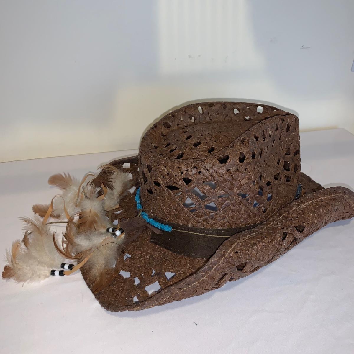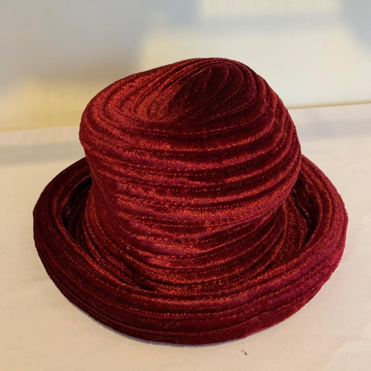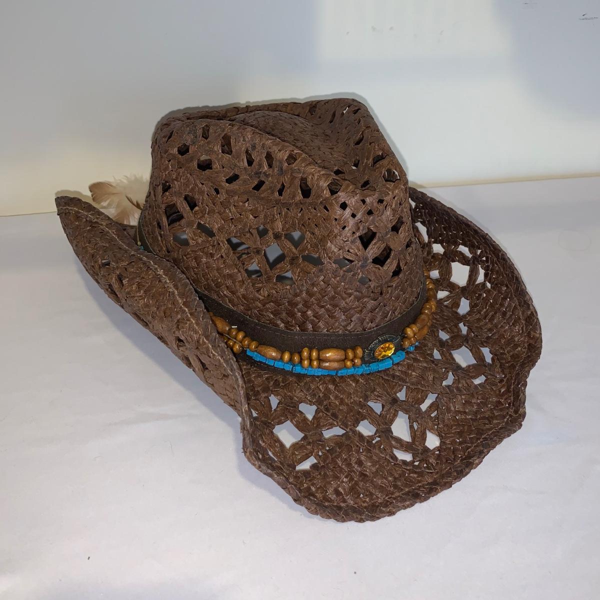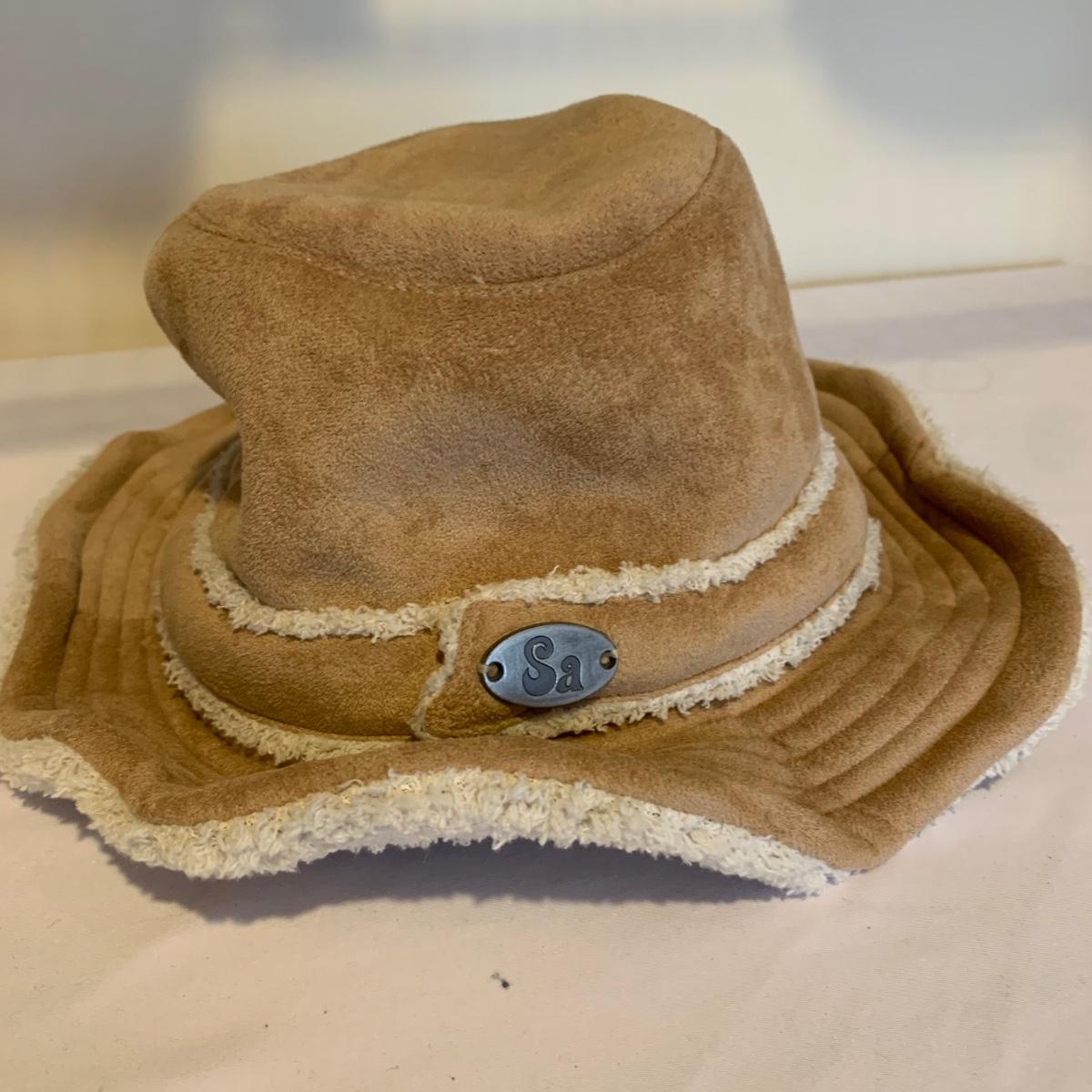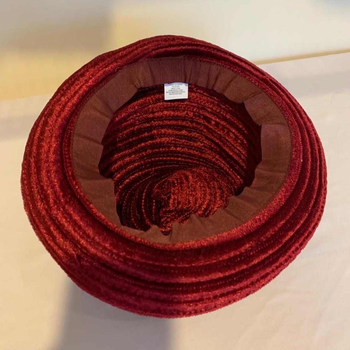 This lot includes 5 women’s hats. Included are two straw cowboy hats, one velvet material hat, one suede and fur material bucket hat, and more. All of the hats appear to be size small-medium. The largest hat measures about 14in x 6in. The gold wire material hat has some color chipping off (see photos). Shipping available.