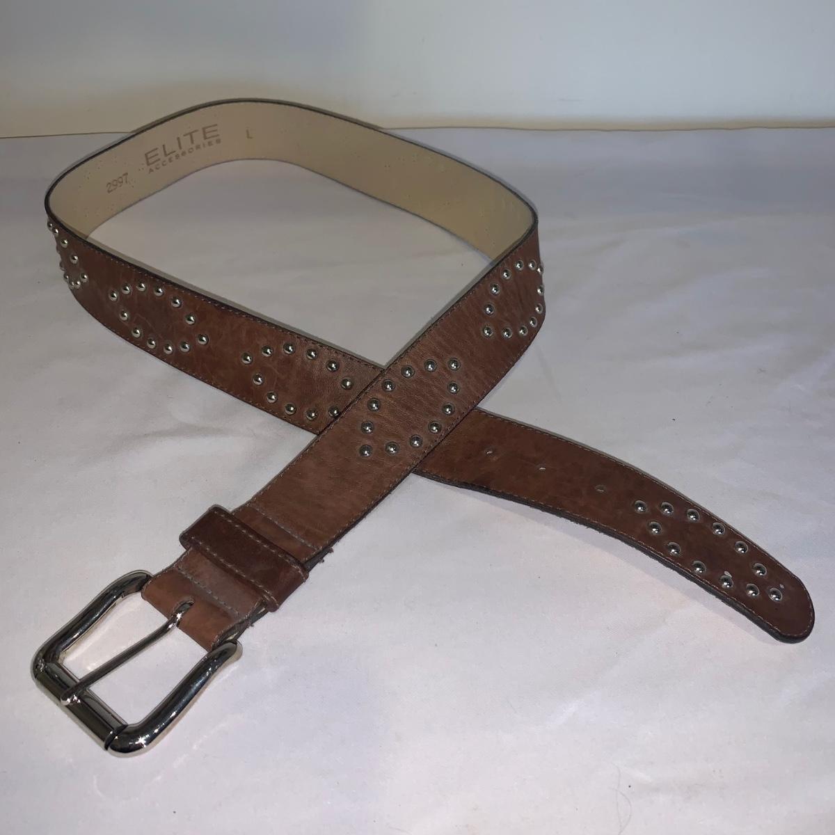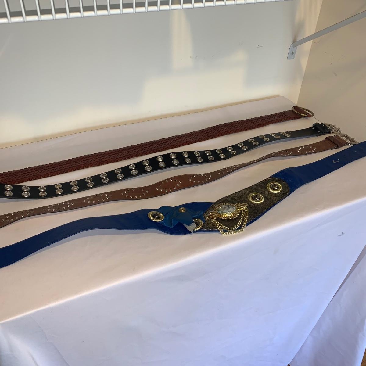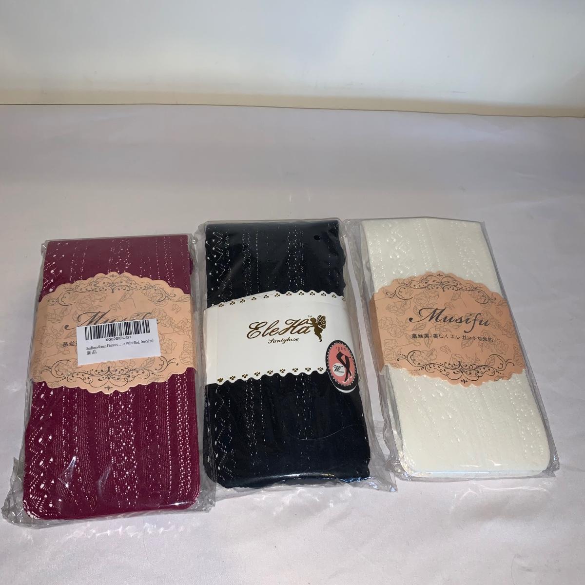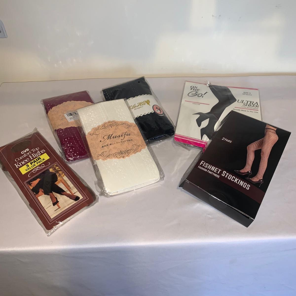 This lot includes four women’s belts all are labeled size Large but appear to be size Medium. The lot also includes 7 pairs of women’s stockings. Three of the stockings appear to be unopened in original packaging. All stockings appear to be one-size or women’s size medium. The brown studded belt measures about 40in. Shipping available.