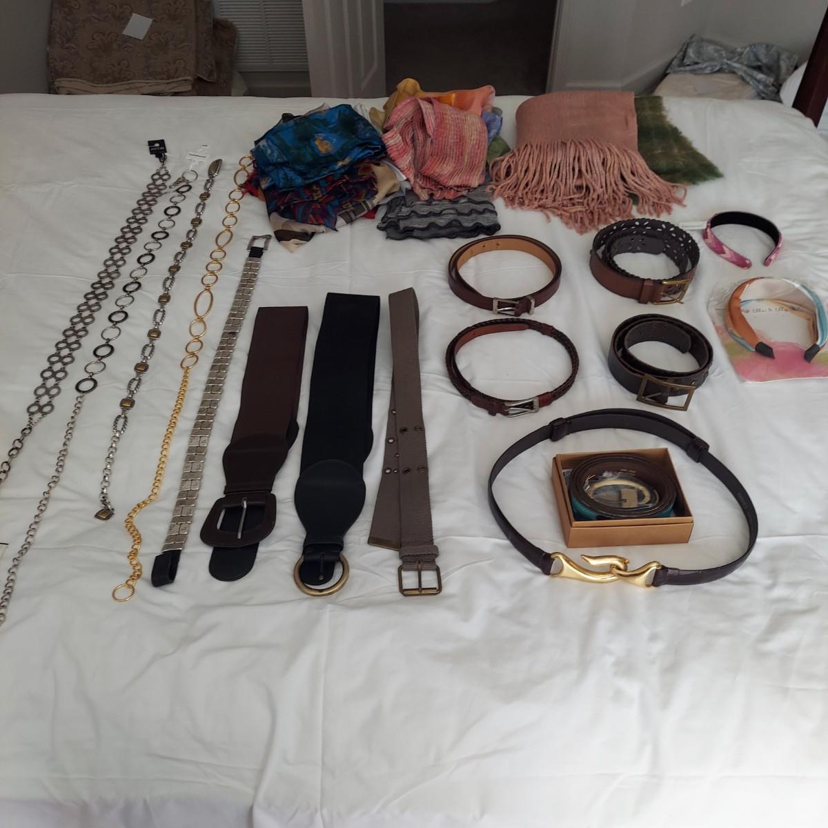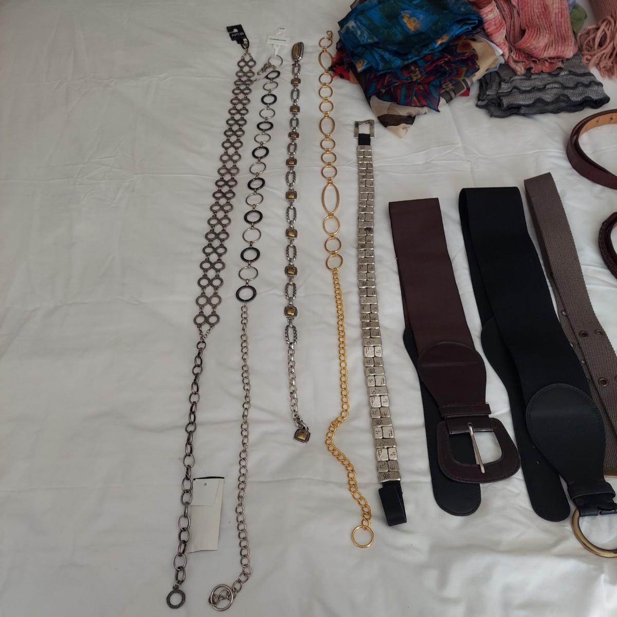 Several women's belts and scarves included. Featuring brands like Anushka, Chico's, Apt 9 and more. Please see photos for details. Shipping available