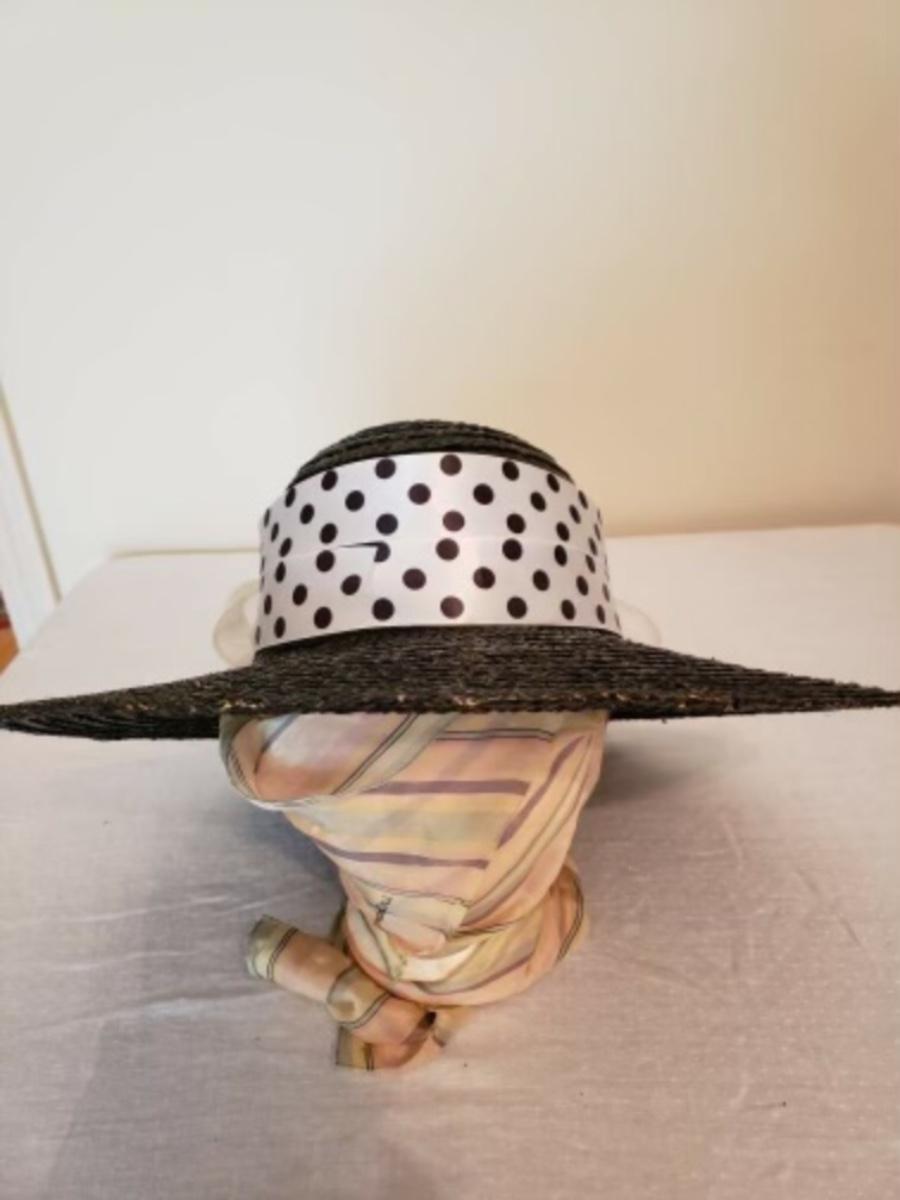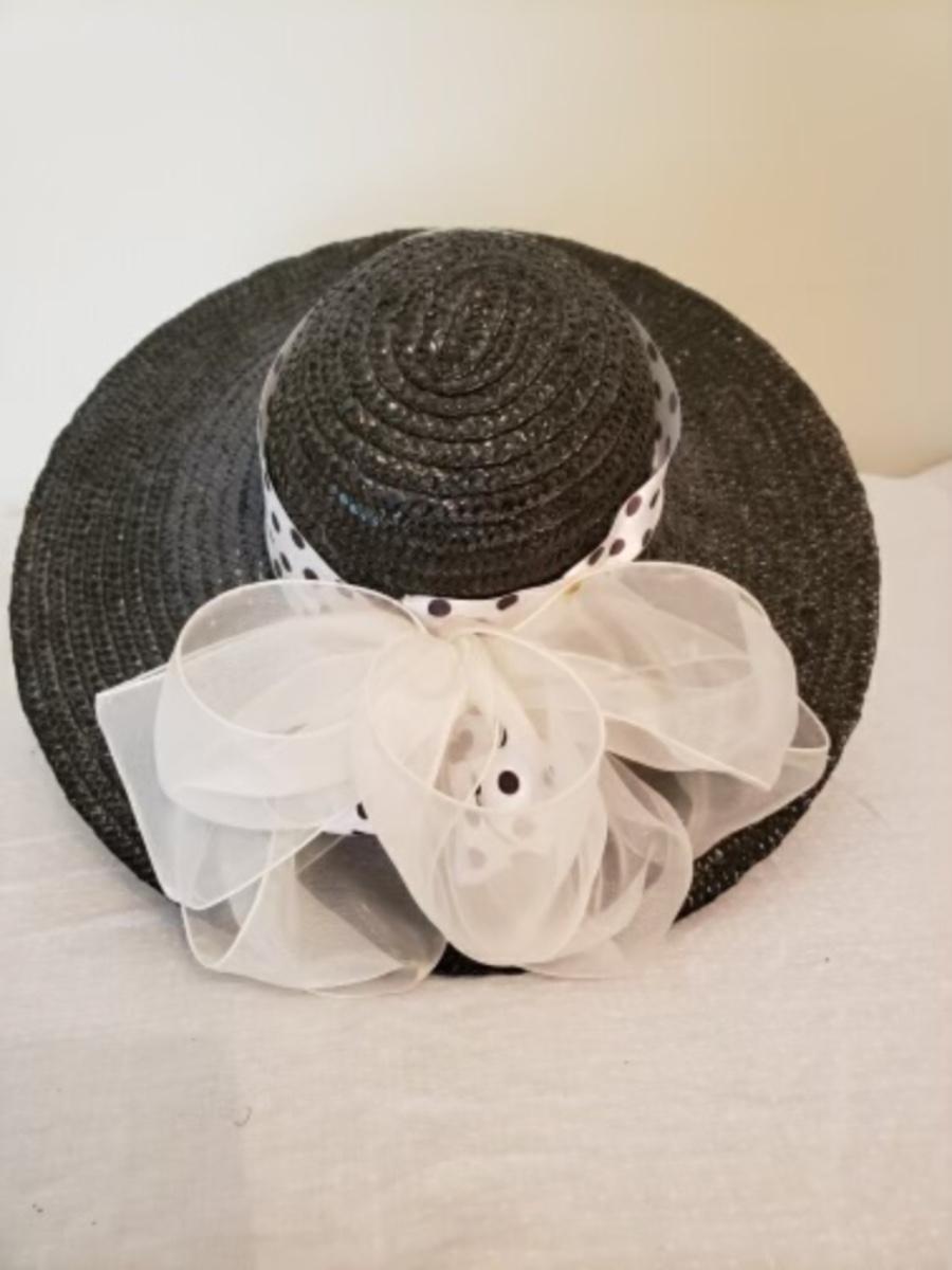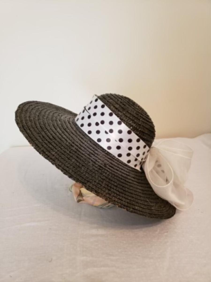 Women's black straw wide brim hat with polka dot ribbon & white organza bow