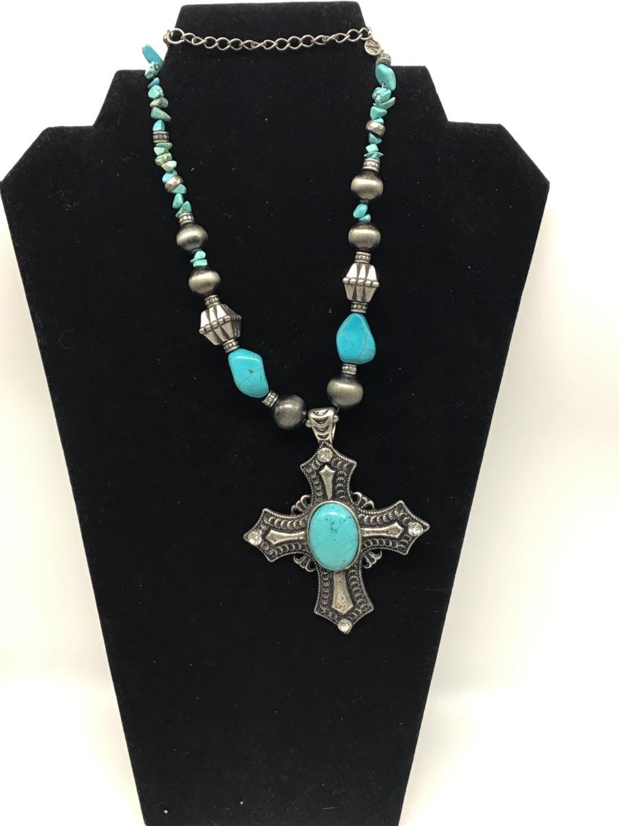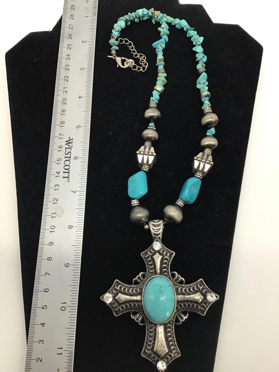 Women’s blue silver cross pendant beads necklace Rhinestones