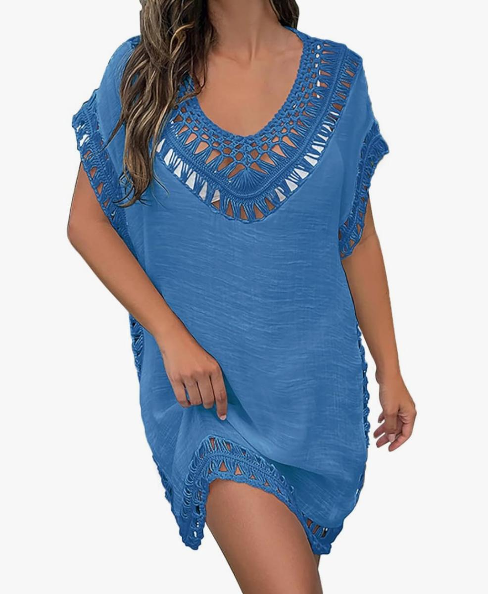Women's Blue Swim Cover Up Dress w/Macrame Detail - Women's Beachwear, Vacation Dress Relaxed Flowy Fit Summer Dress