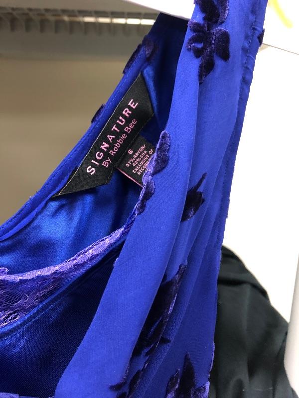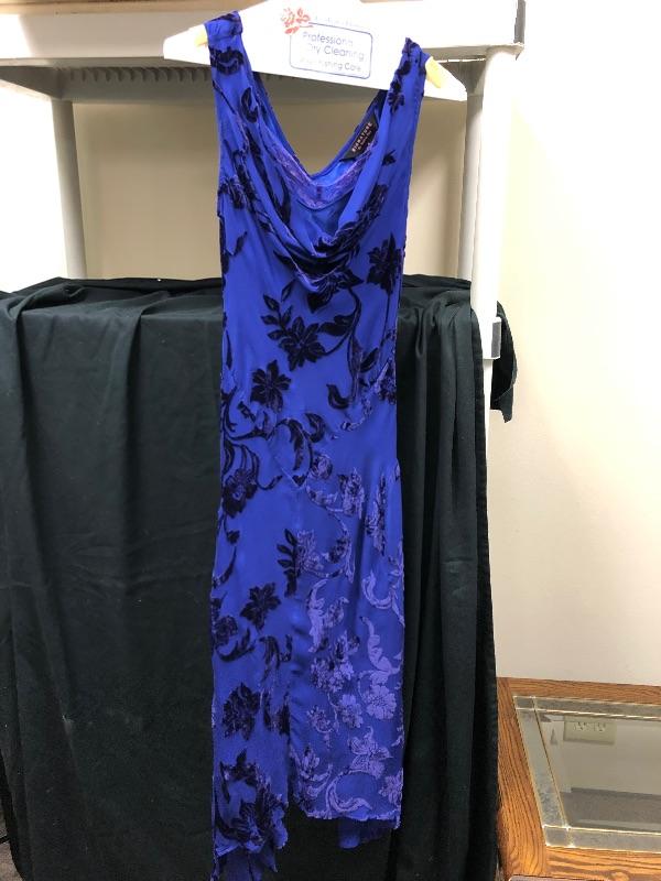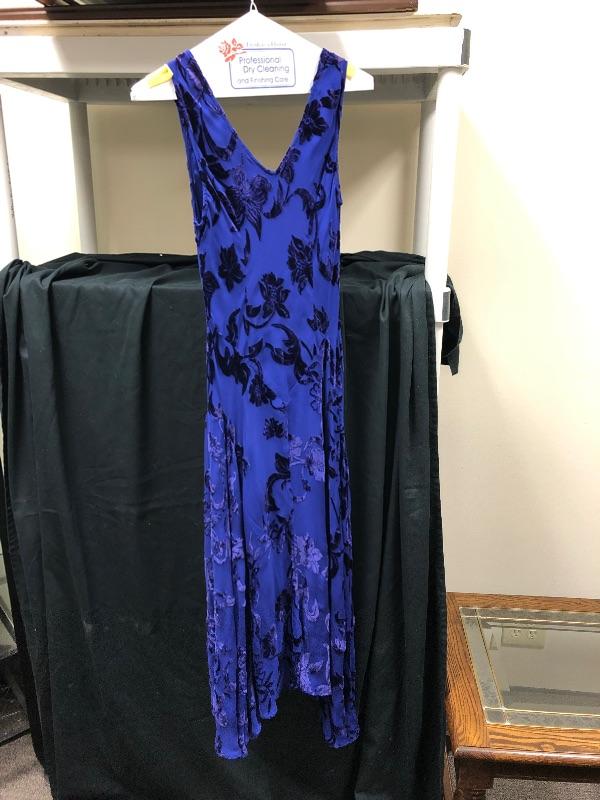 Women's Blue Dress. Blue velvet floral on a blue material. Size 6. From Signature by Robbie Bee. Has a shark bite bottom hem. Sleeveless. Good Condition.
