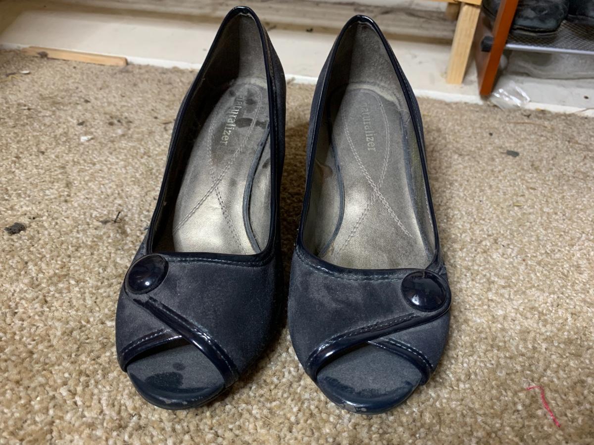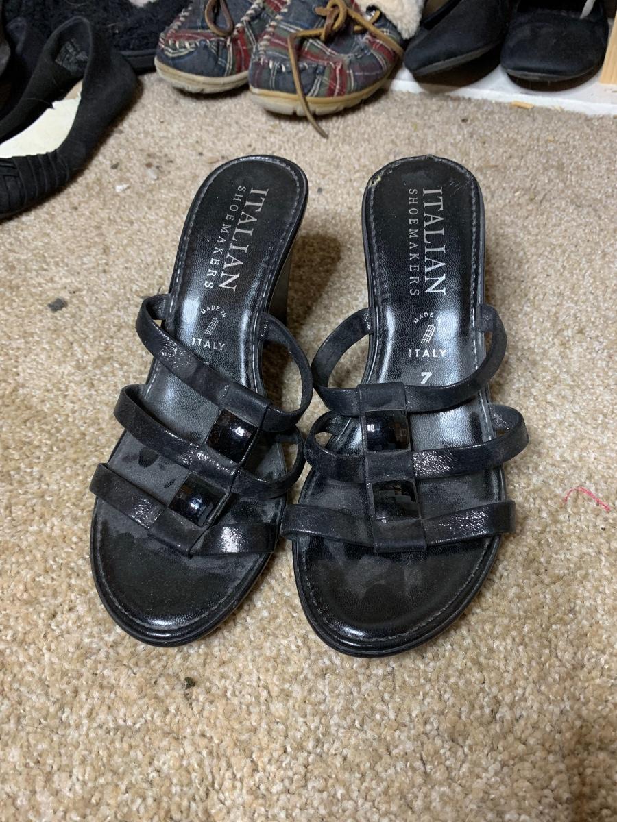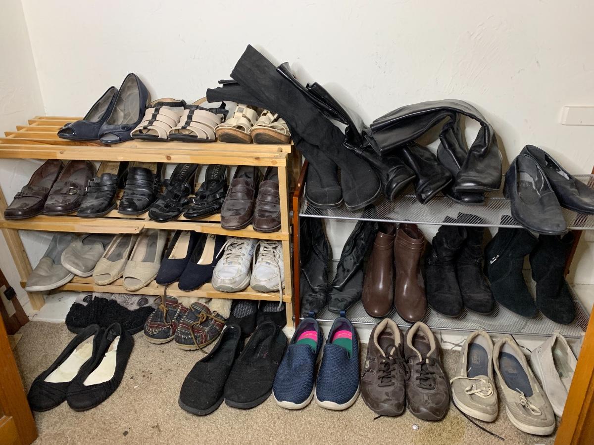 Size 6.5 to 7. Assorted shoes and boots brand names including Calvin Klein, Bobs and Sketchers in lightly used to very used condition. *Shoe racks not included*