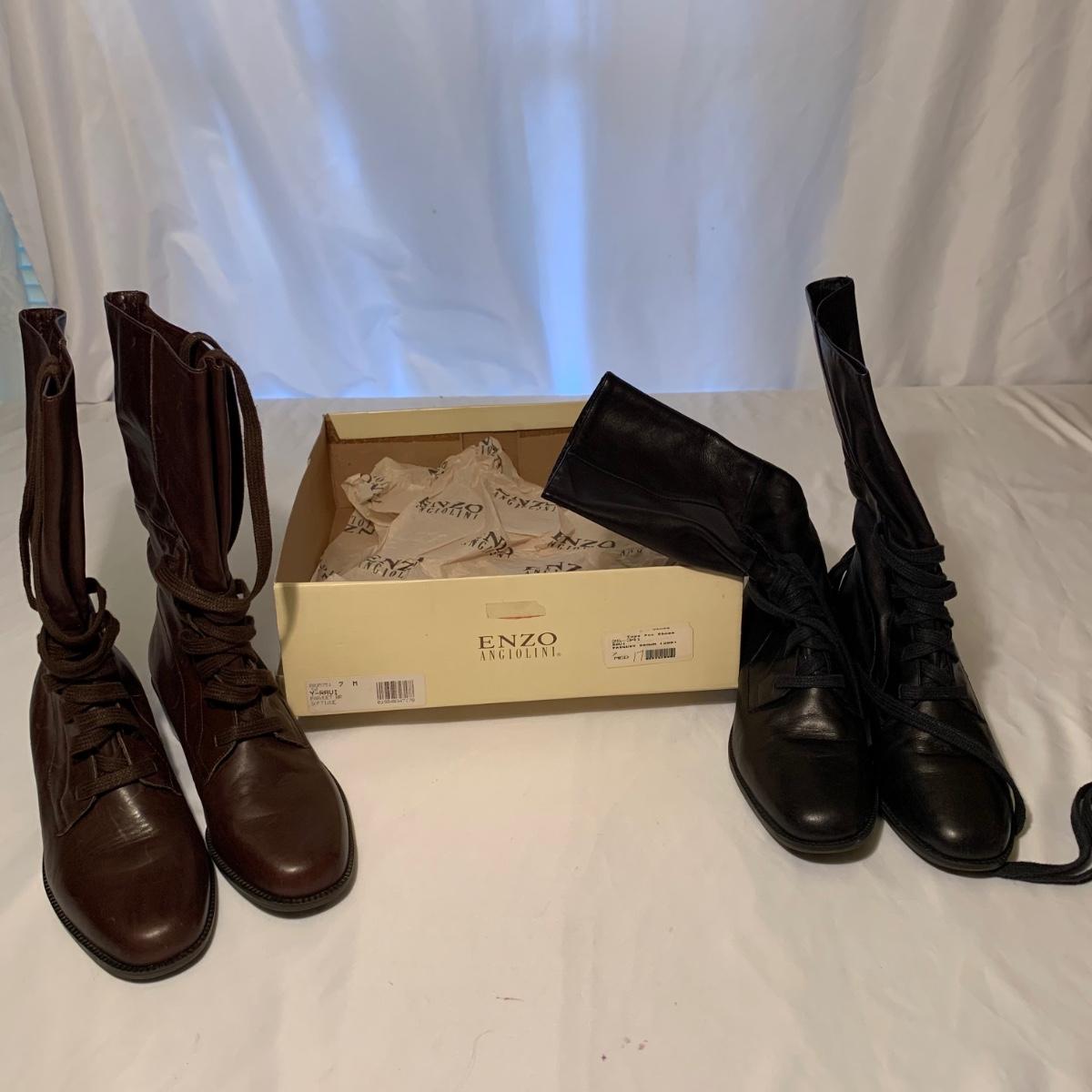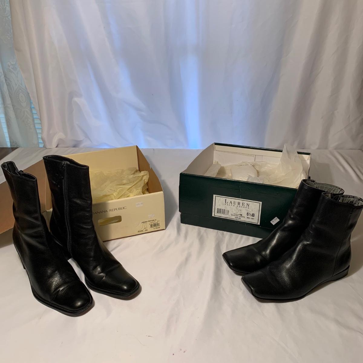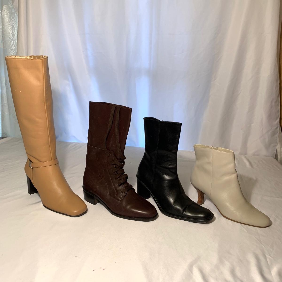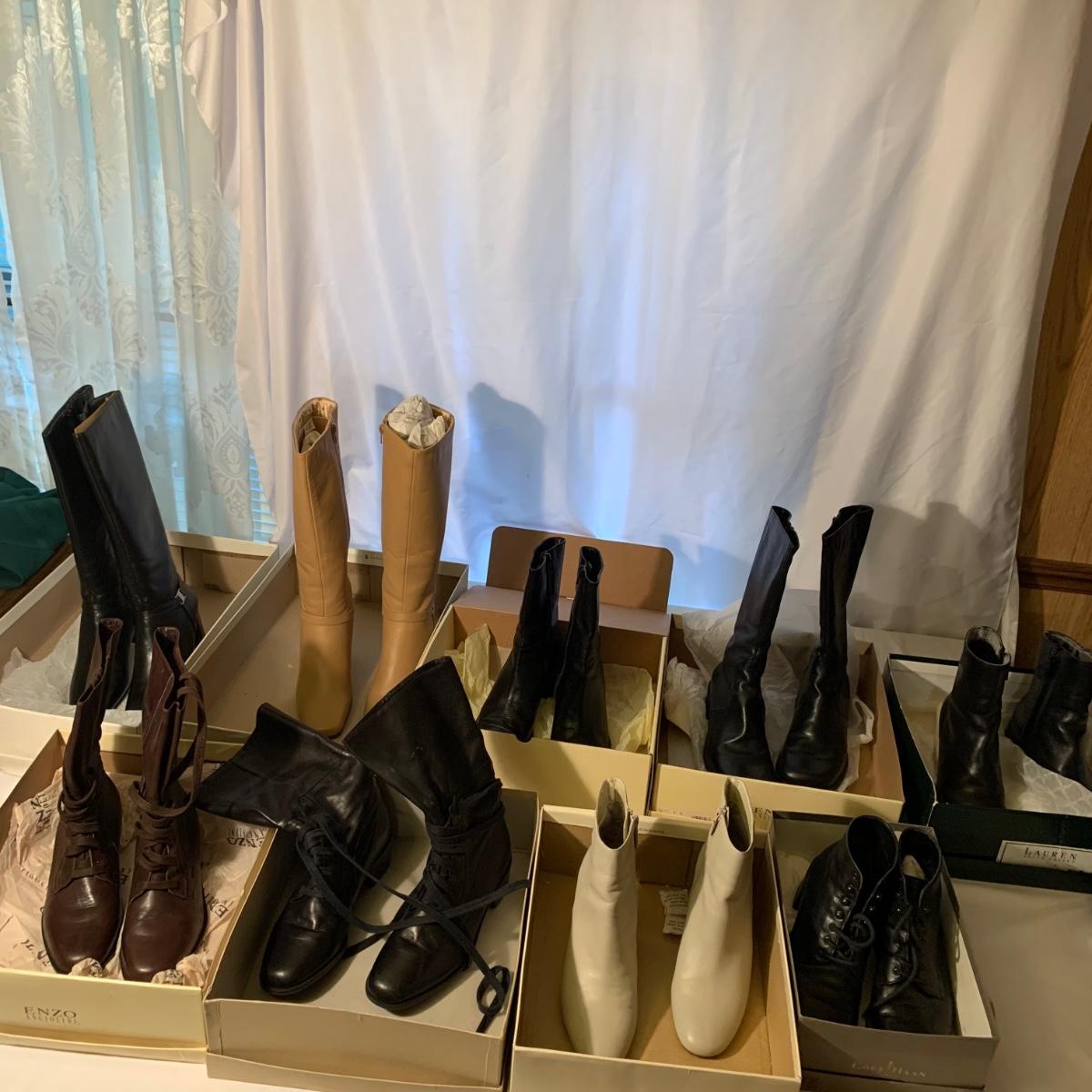Nine pairs of women’s boots, all size 6.5-7. All boots appear to be leather. Some are in their original boxes. They have been stored and kept in very good condition, with most looking new or very gently used. Six pairs are black, one pair is dark brown, one pair is camel, and one pair is white. Brands included are Enzo Angolini, Bloomingdale’s, Nine West, Ralph Lauren, Banana Republic, Reaction for J. Jill, and Naturalizer. Local pickup only.
