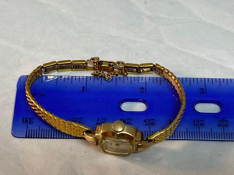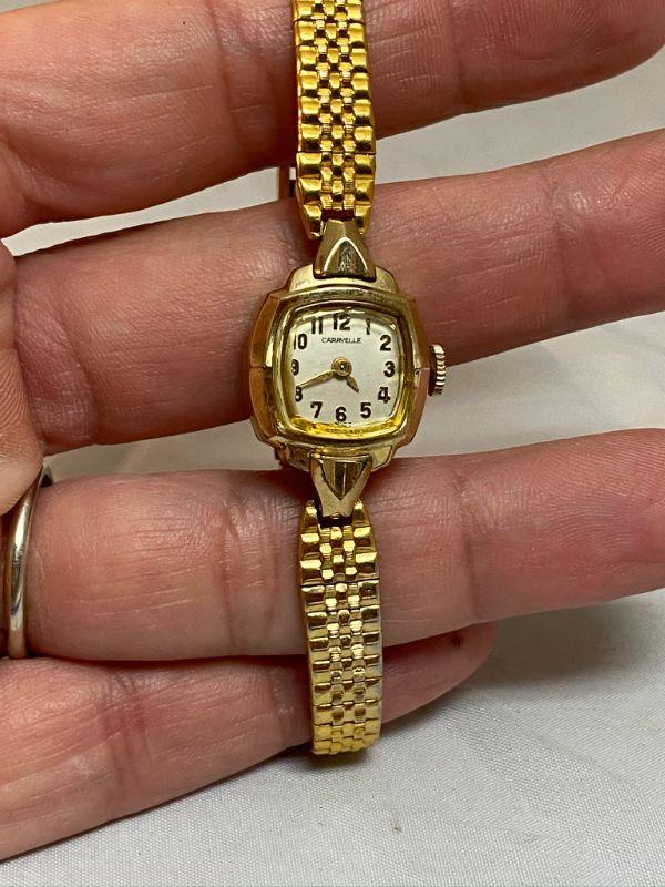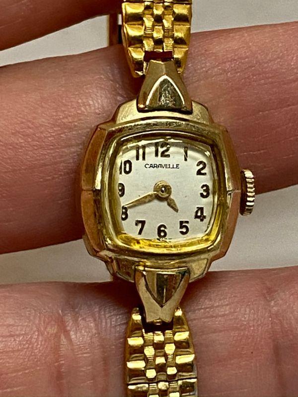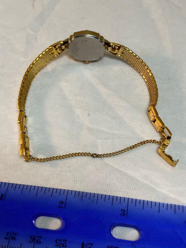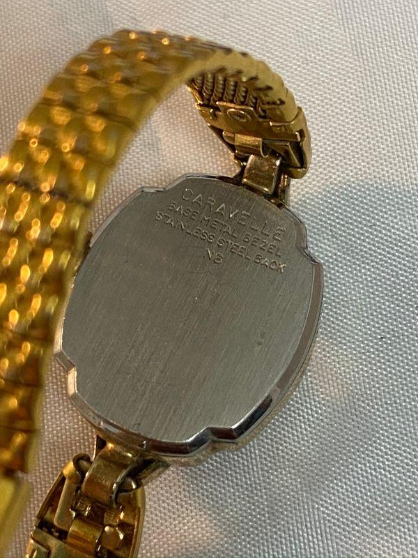 Women's Caravelle Watch. Wind up goldtone wristwatch. Works. Has clasp closure with added safety chain connecting the ends. Previously worn and has signs from normal use.