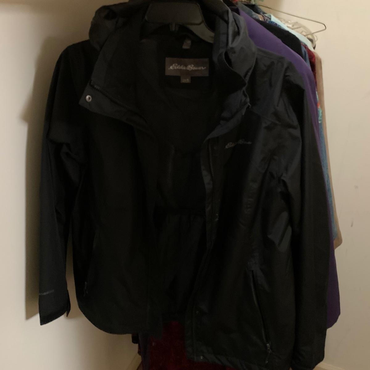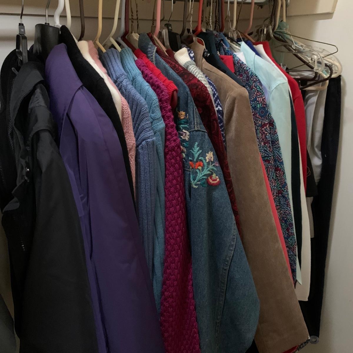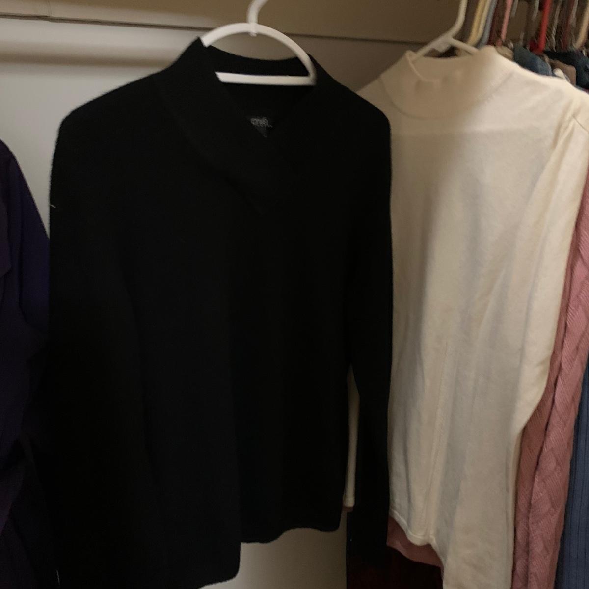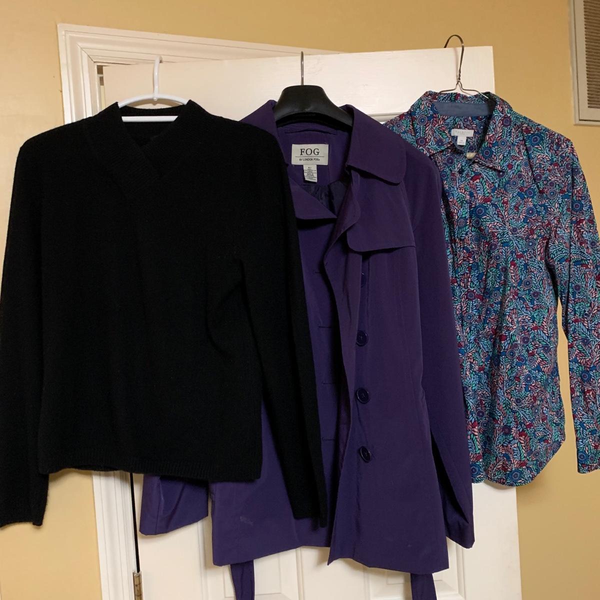 Various items of women’s casual clothing and outerwear, including sweaters, shirts, pants, dresses, skirts, and jackets. Clothing ranges in size mostly from M to L. There are two Privé 100% cashmere sweaters, an XL Eddie Bauer coat, a London Fog jacket, two dresses (one corduroy), as well as various shirts, cardigans, skirts, and pants.