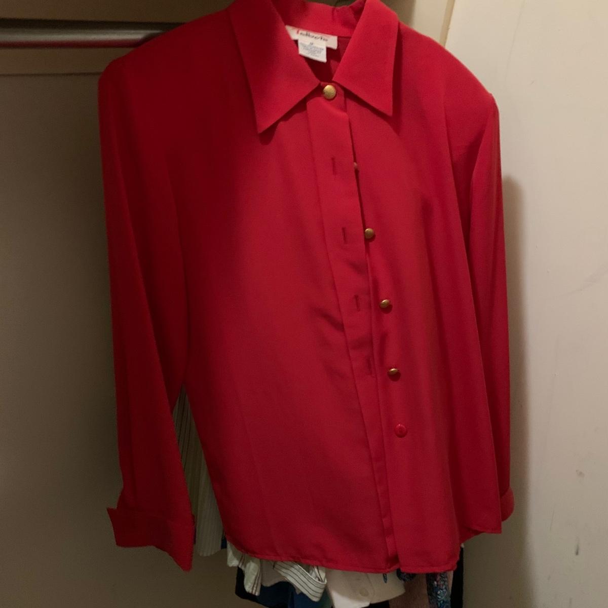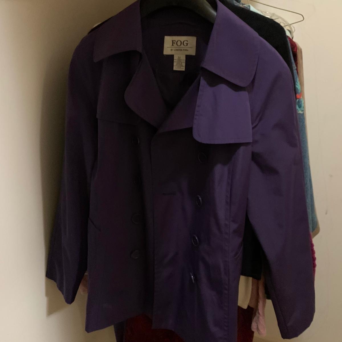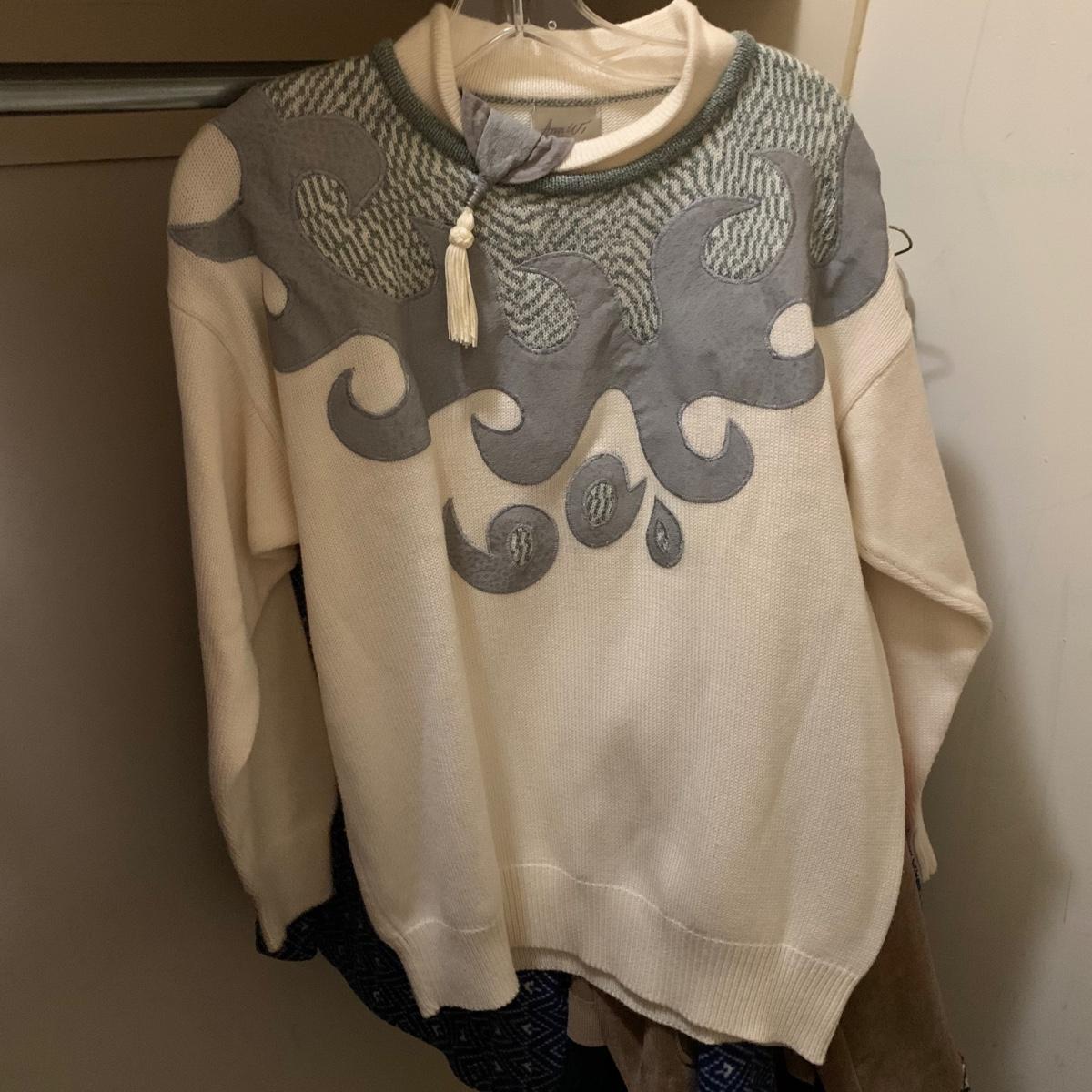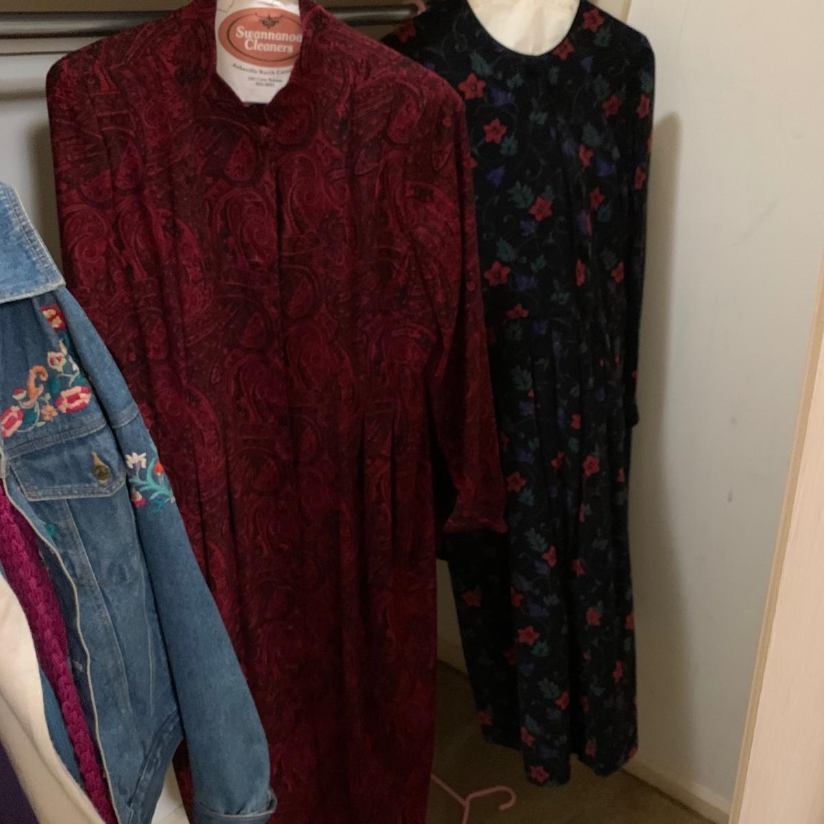 Various items of women’s casual clothing and outerwear, including sweaters, shirts, pants, dresses, skirts, and jackets. Clothing ranges in size mostly from M to L. There are two Privé 100% cashmere sweaters, an XL Eddie Bauer coat, a London Fog jacket, two dresses (one corduroy), as well as various shirts, cardigans, skirts, and pants.