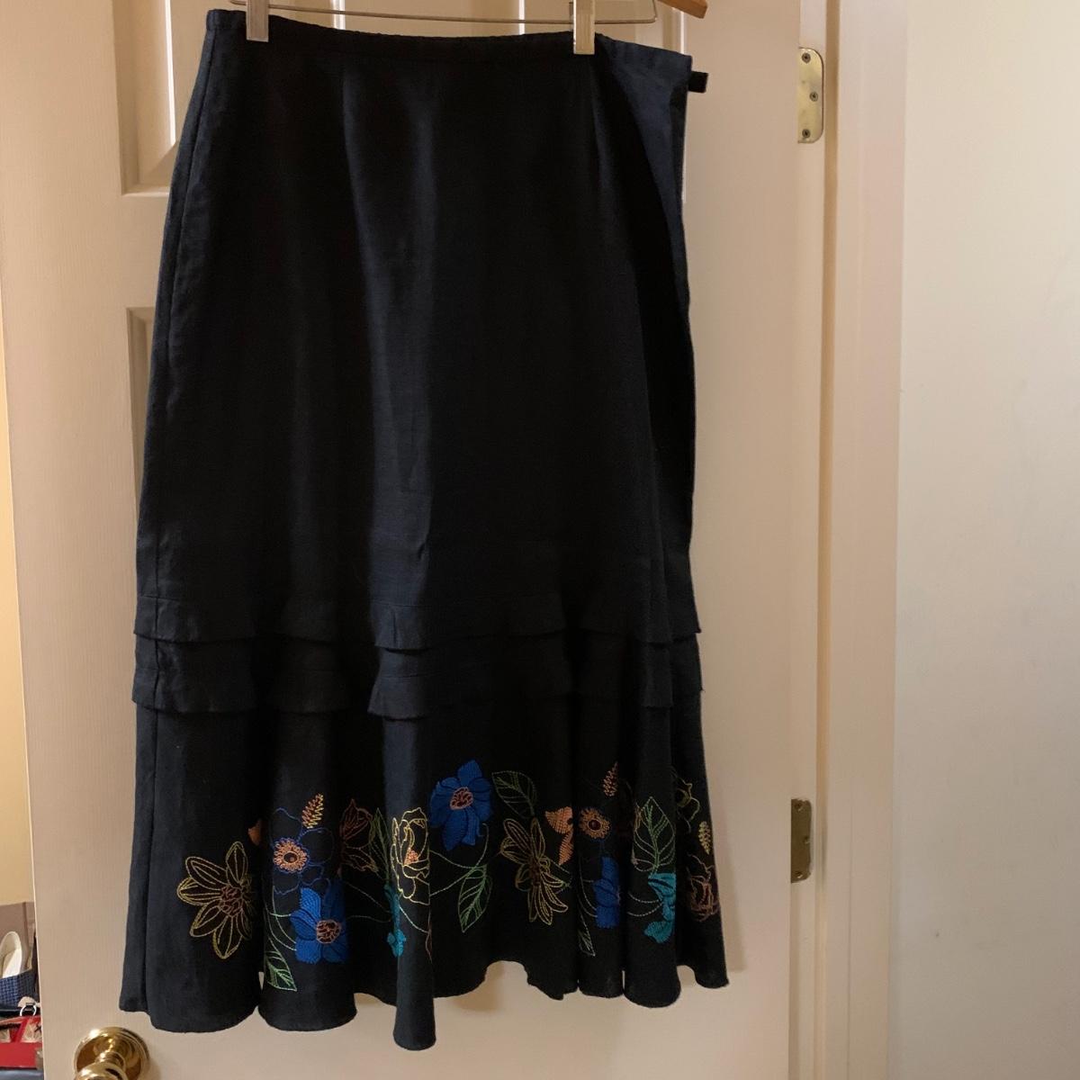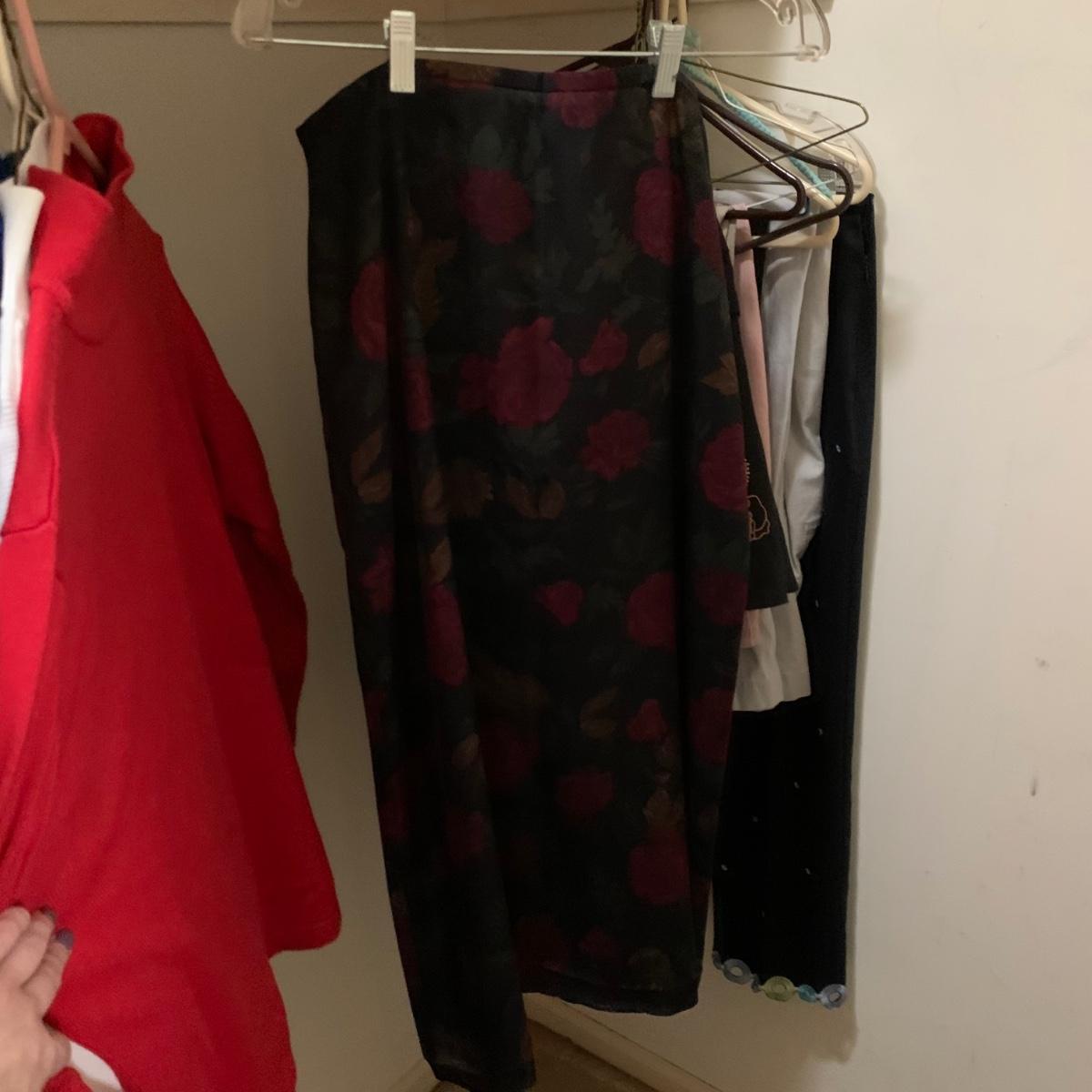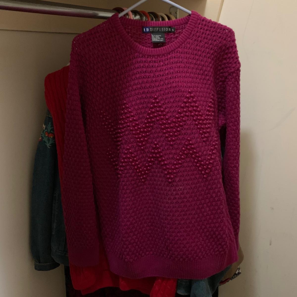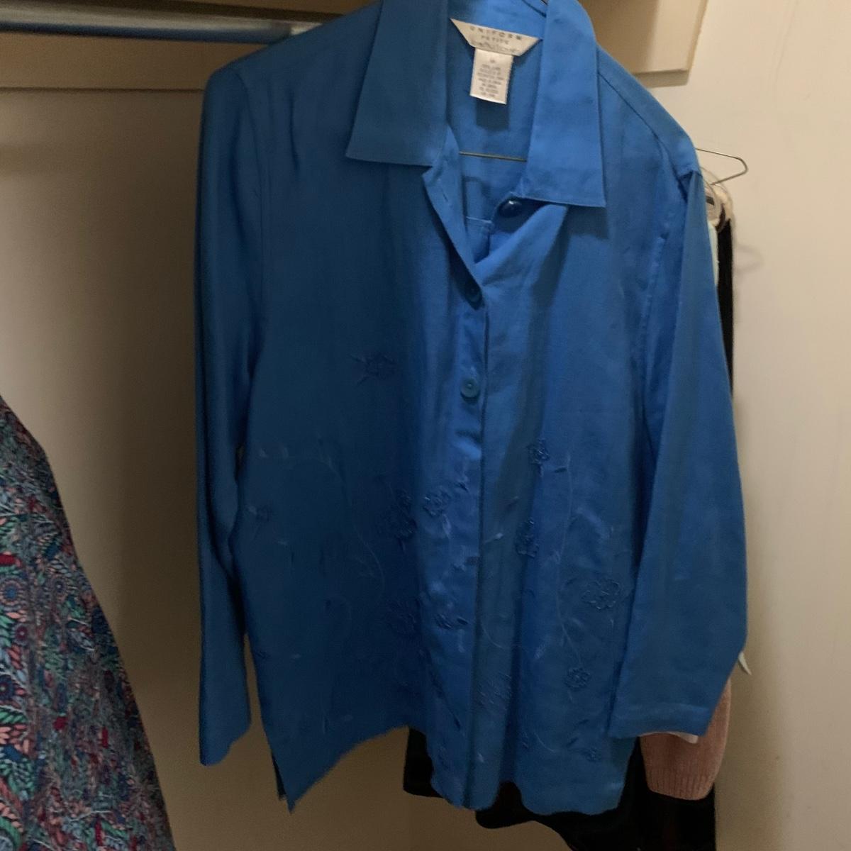 Various items of women’s casual clothing and outerwear, including sweaters, shirts, pants, dresses, skirts, and jackets. Clothing ranges in size mostly from M to L. There are two Privé 100% cashmere sweaters, an XL Eddie Bauer coat, a London Fog jacket, two dresses (one corduroy), as well as various shirts, cardigans, skirts, and pants.