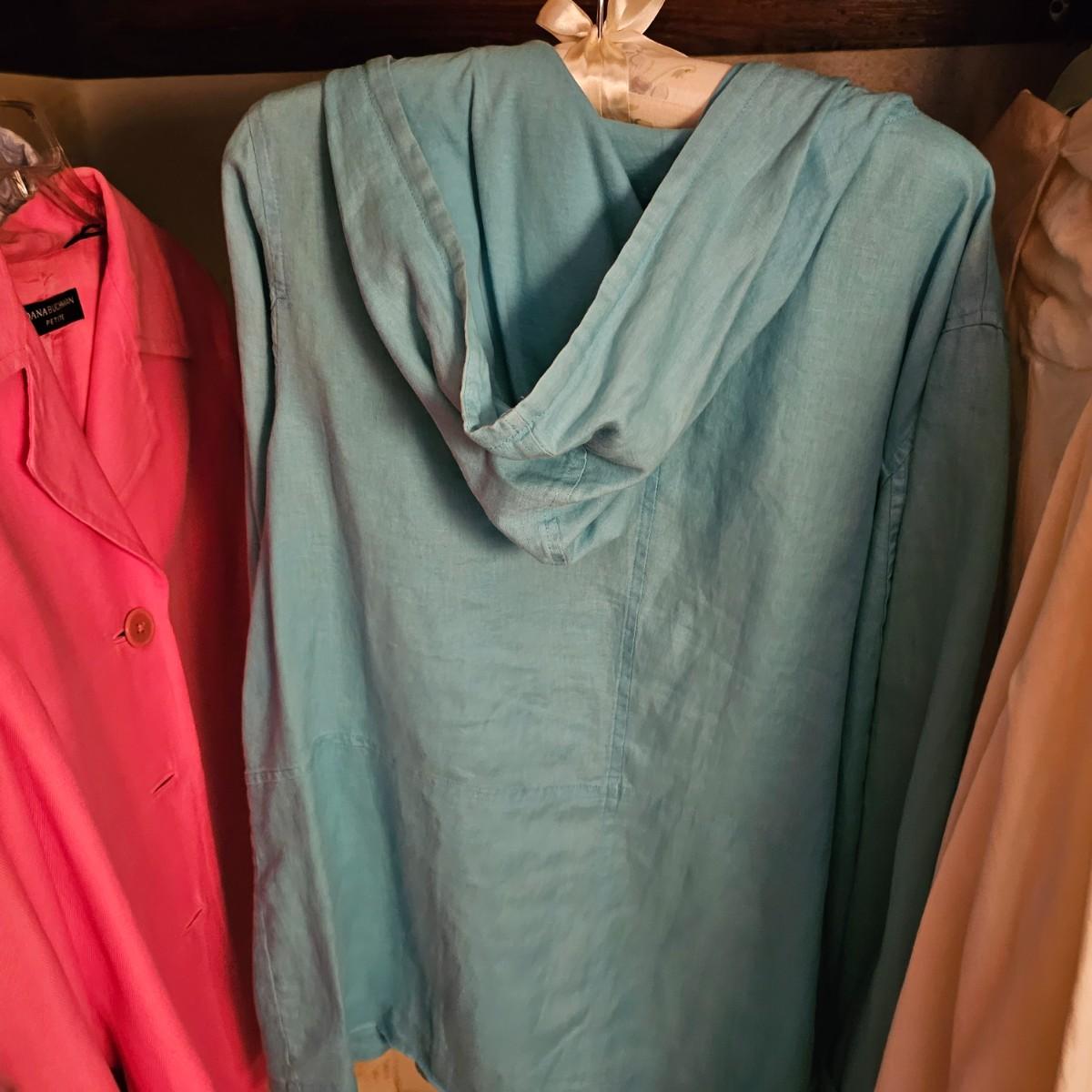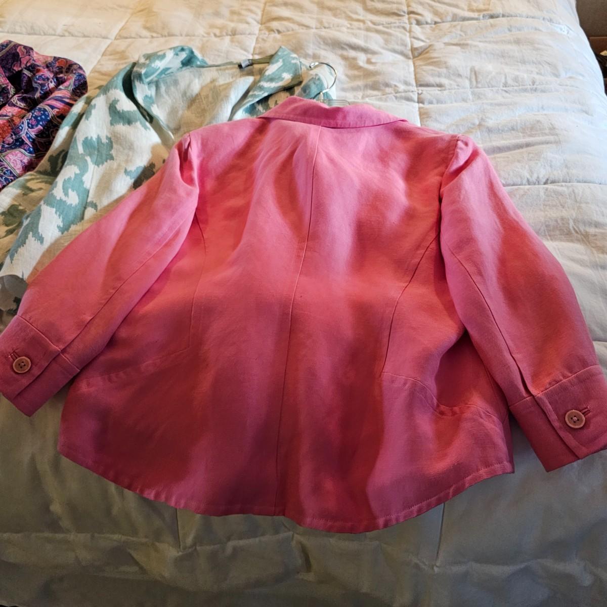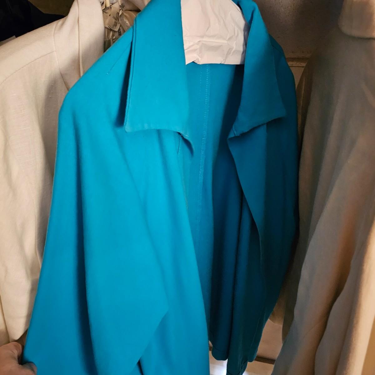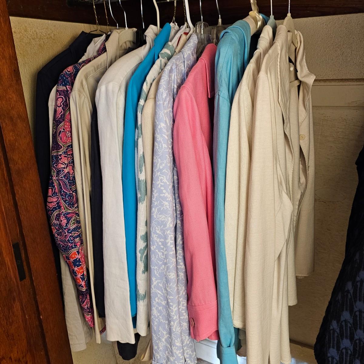 Fourteen lightweight jackets for in between seasonal wear. Solids, patterns, cotton, linens, more. Sizes range from 14 to 16, Medium, Large, X-Large. Lots of different manufacturers. See photos for details. Shipping available.
