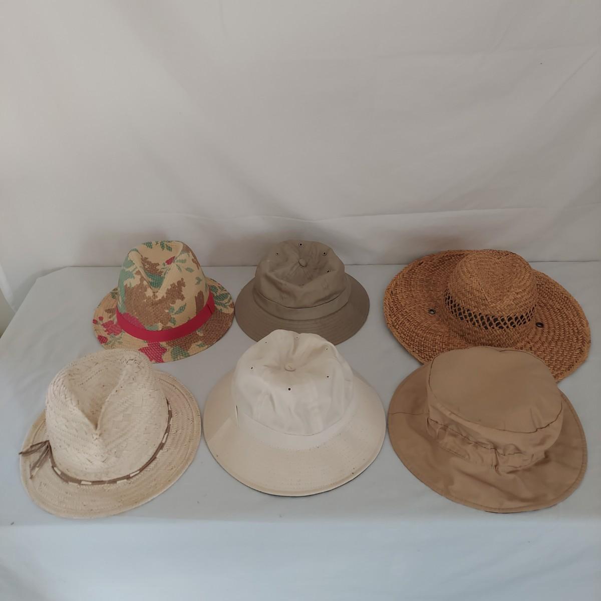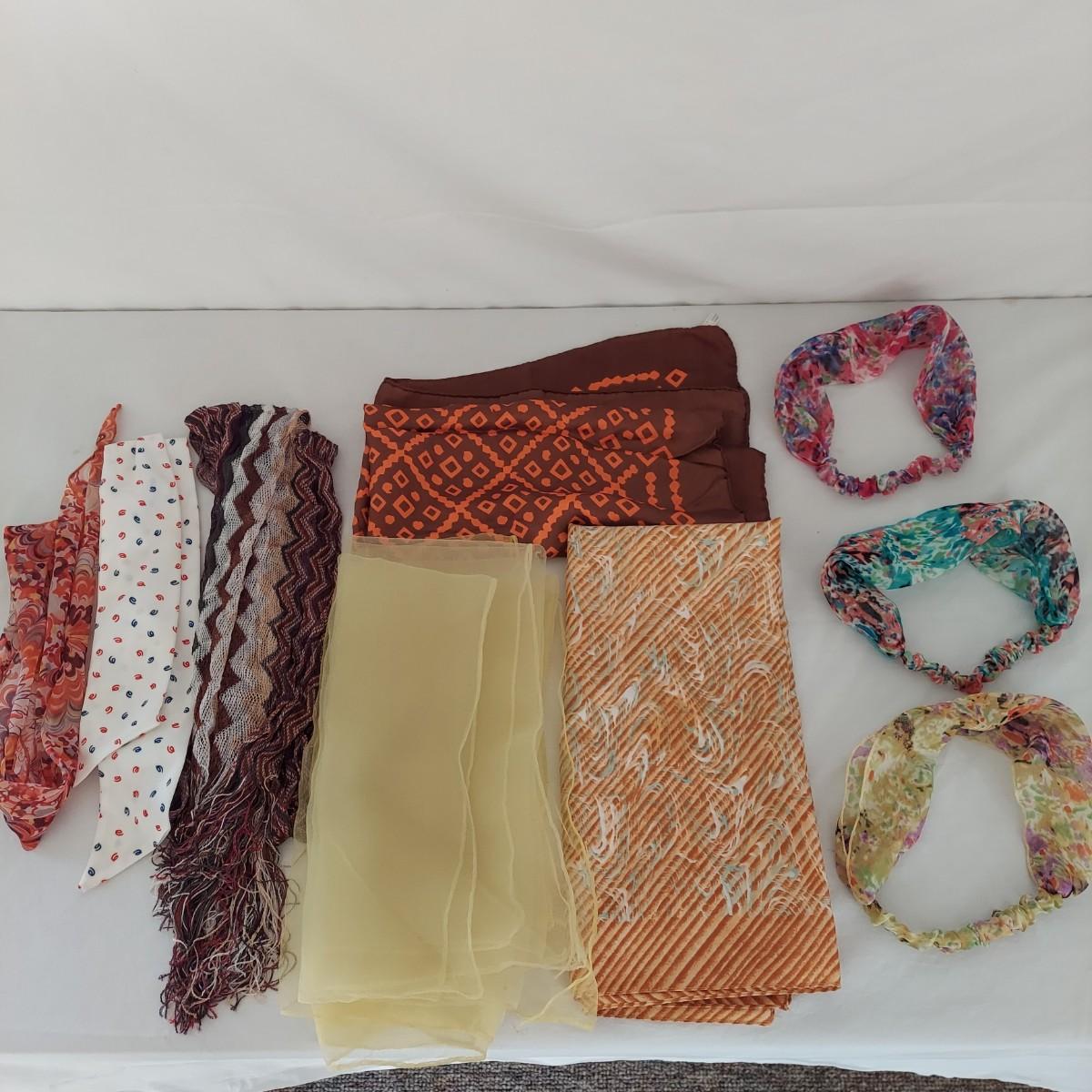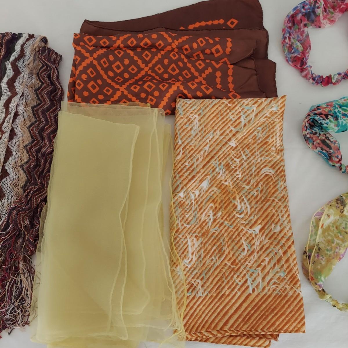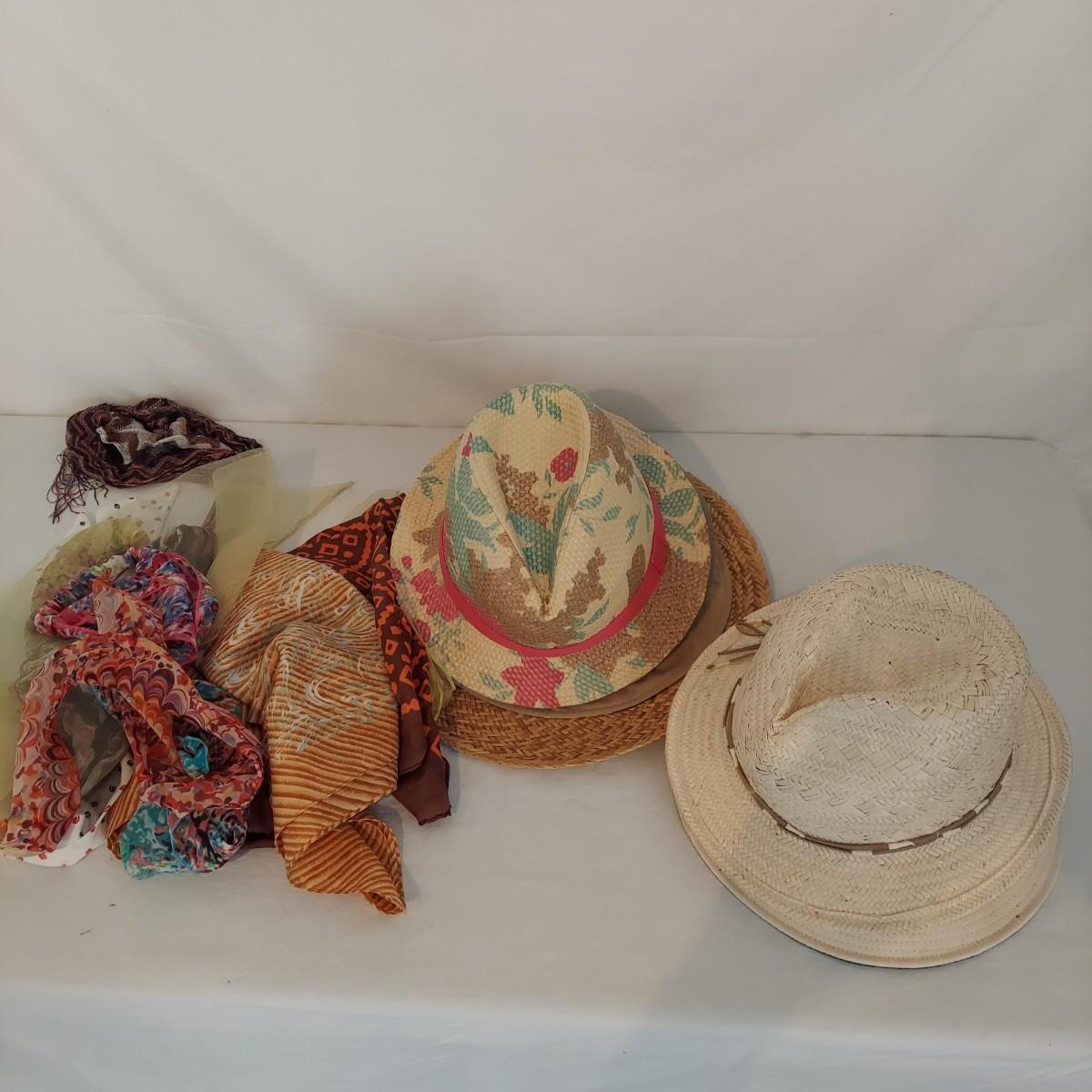Several women's tops with summer hats and scarves. There are three long, thin head wrap scarves, four square scarves, three cloth headbands. As well as six sun hats. There are approximately 15 tops that are mostly size Large or XL. Brands include Lands End, Jaclyn Smith, Southern Lady, Liz Claiborne, Alfred Dunner and more. Shipping available
