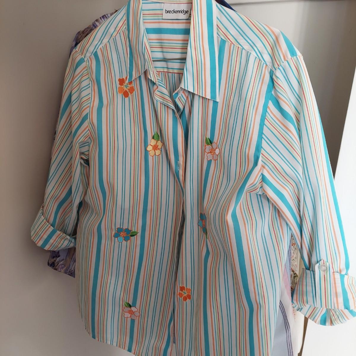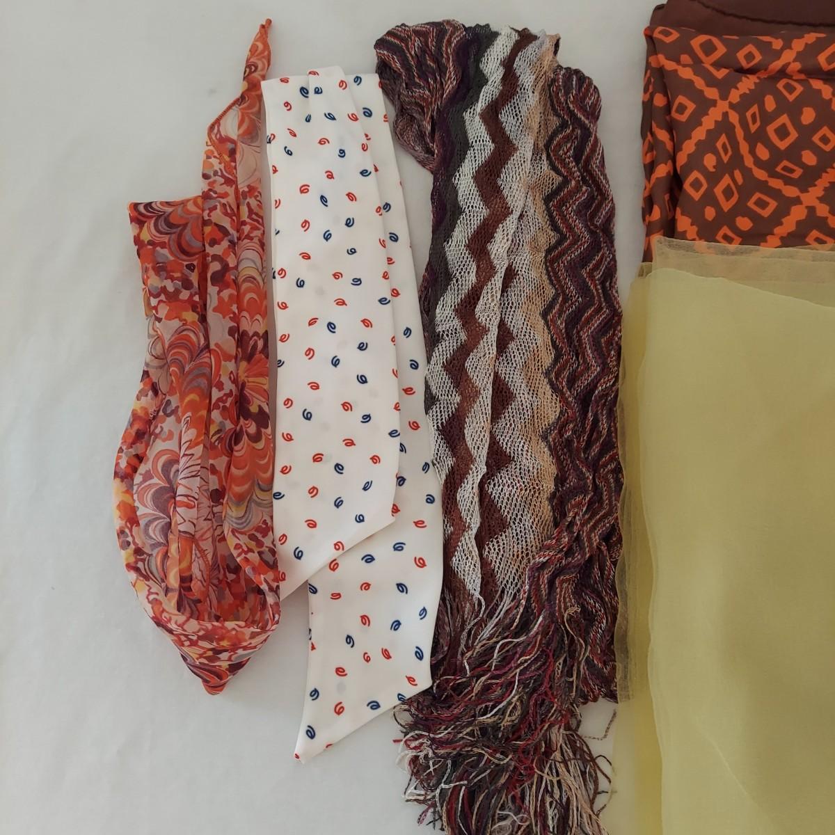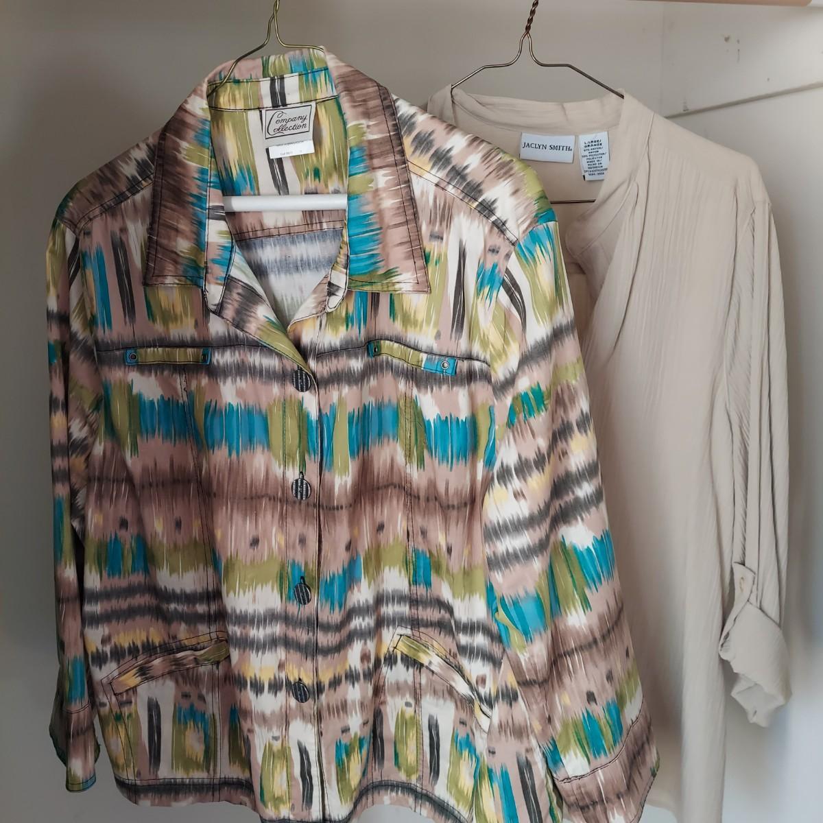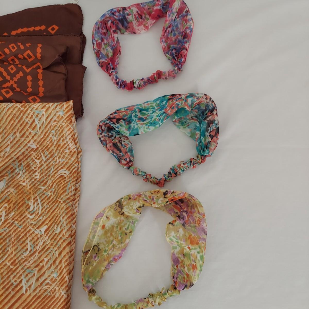 Several women's tops with summer hats and scarves. There are three long, thin head wrap scarves, four square scarves, three cloth headbands. As well as six sun hats. There are approximately 15 tops that are mostly size Large or XL. Brands include Lands End, Jaclyn Smith, Southern Lady, Liz Claiborne, Alfred Dunner and more. Shipping available