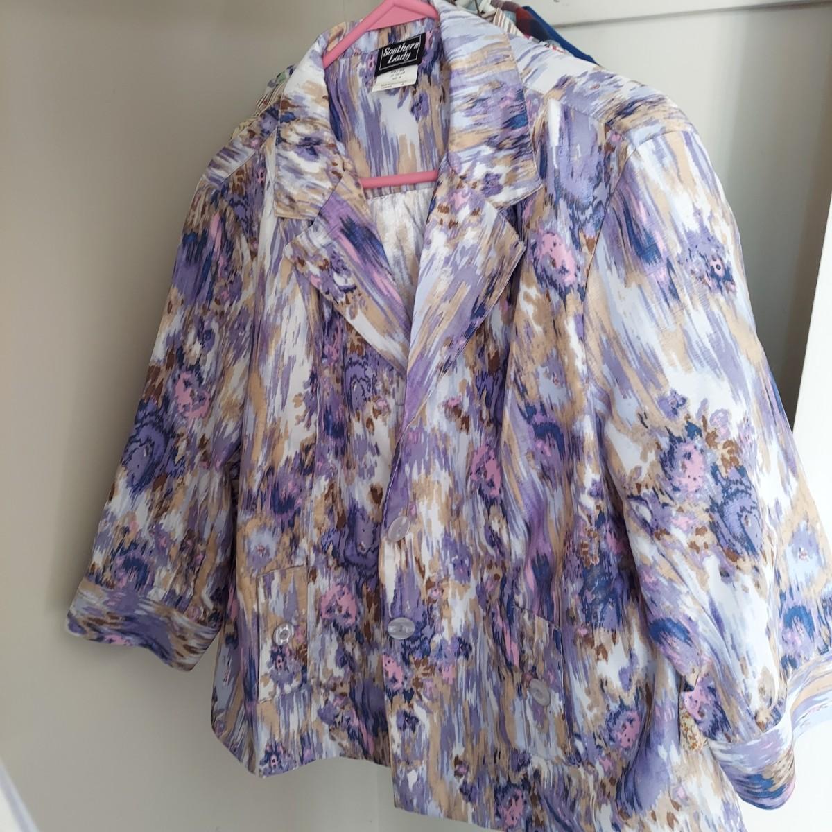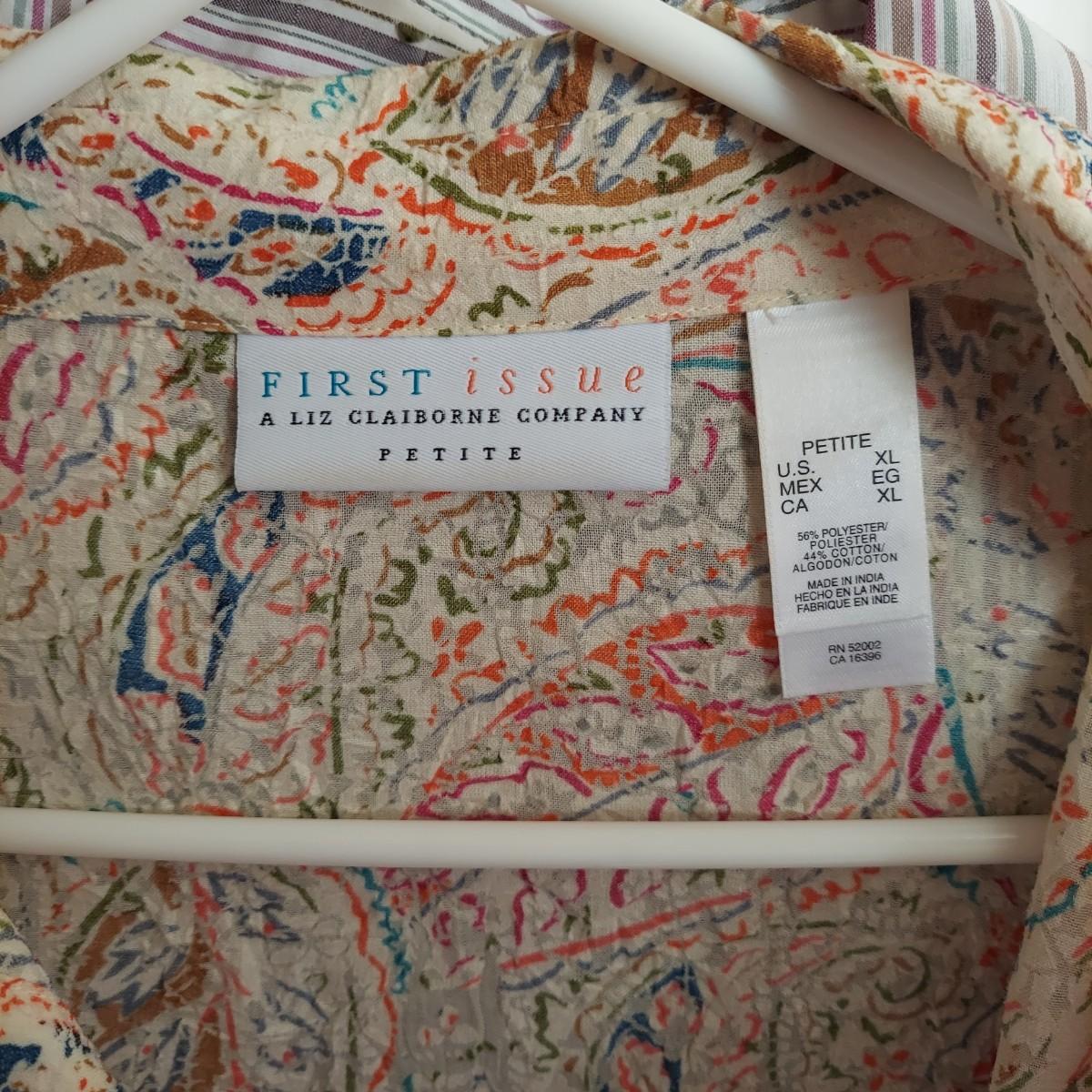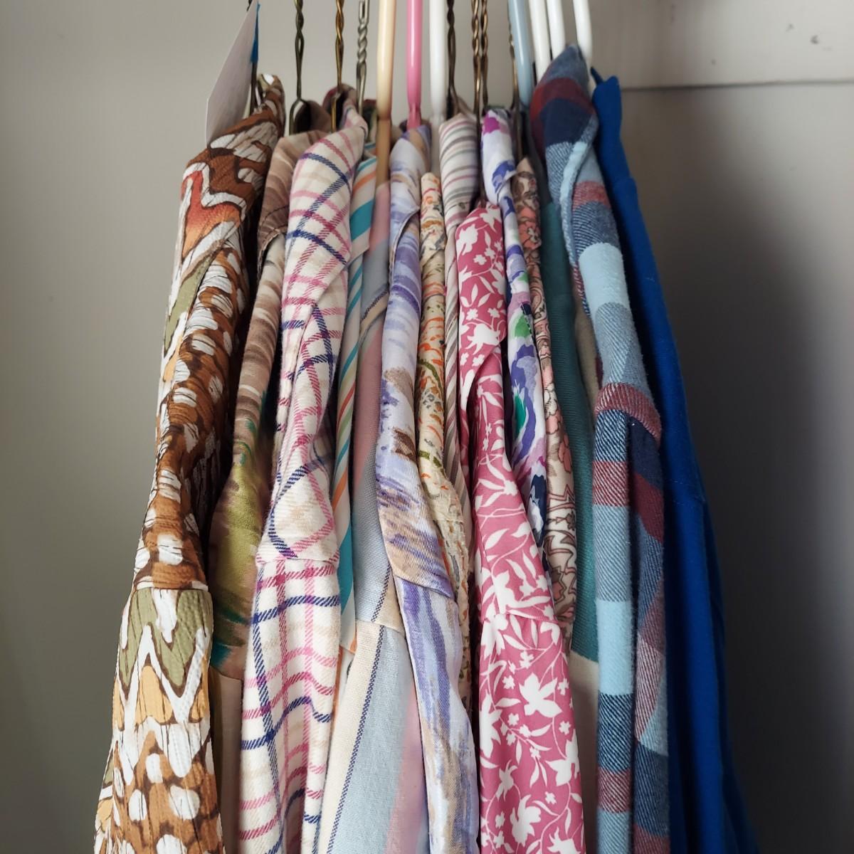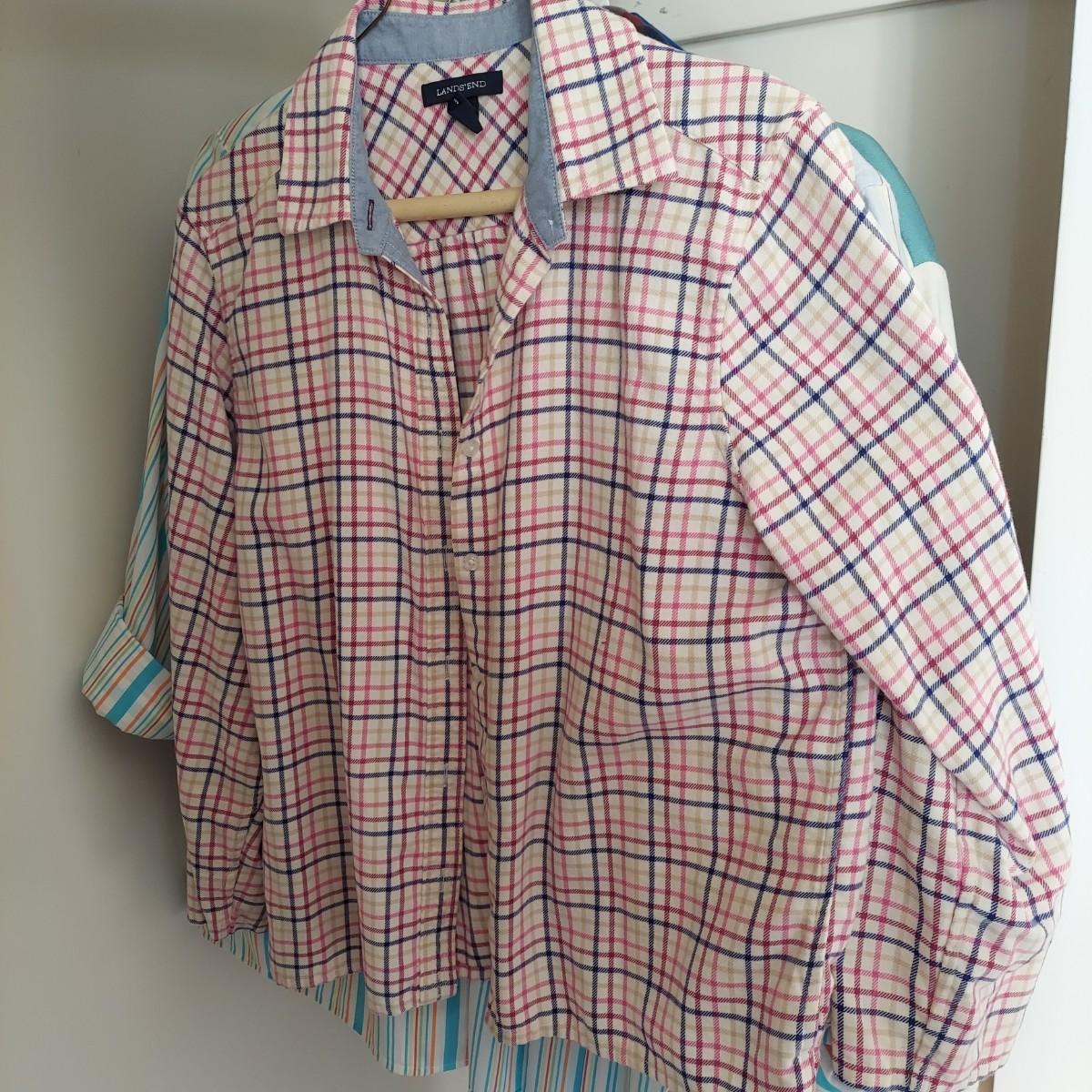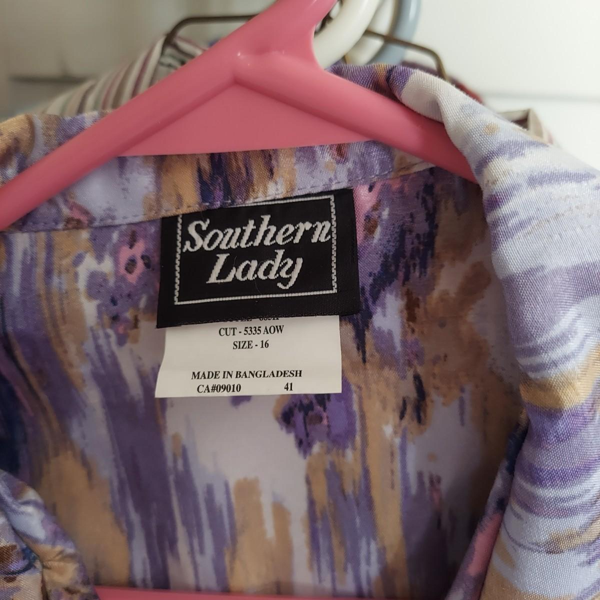 Several women's tops with summer hats and scarves. There are three long, thin head wrap scarves, four square scarves, three cloth headbands. As well as six sun hats. There are approximately 15 tops that are mostly size Large or XL. Brands include Lands End, Jaclyn Smith, Southern Lady, Liz Claiborne, Alfred Dunner and more. Shipping available