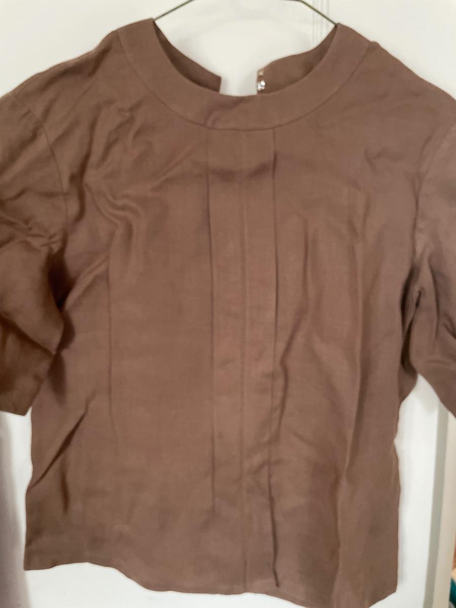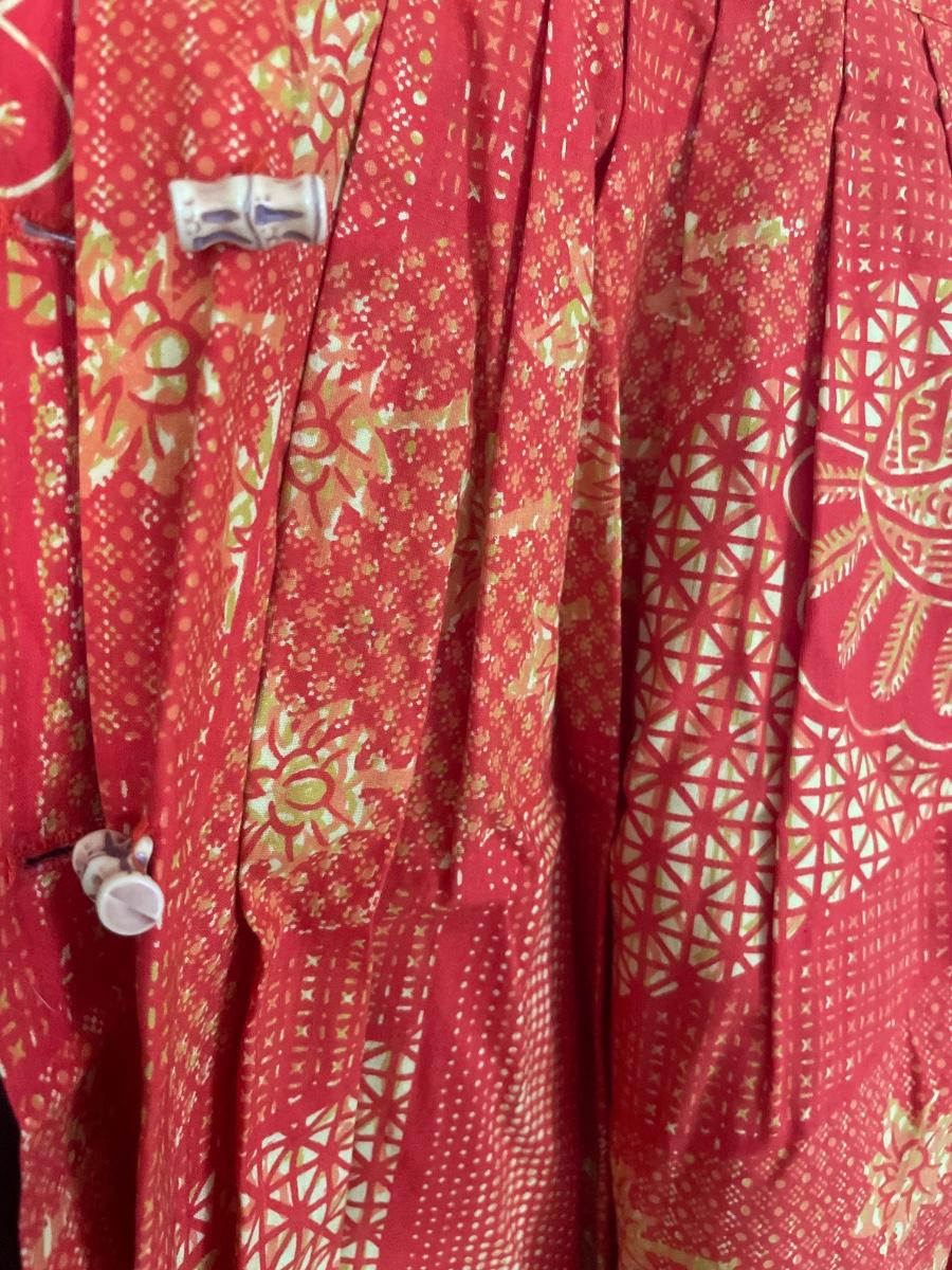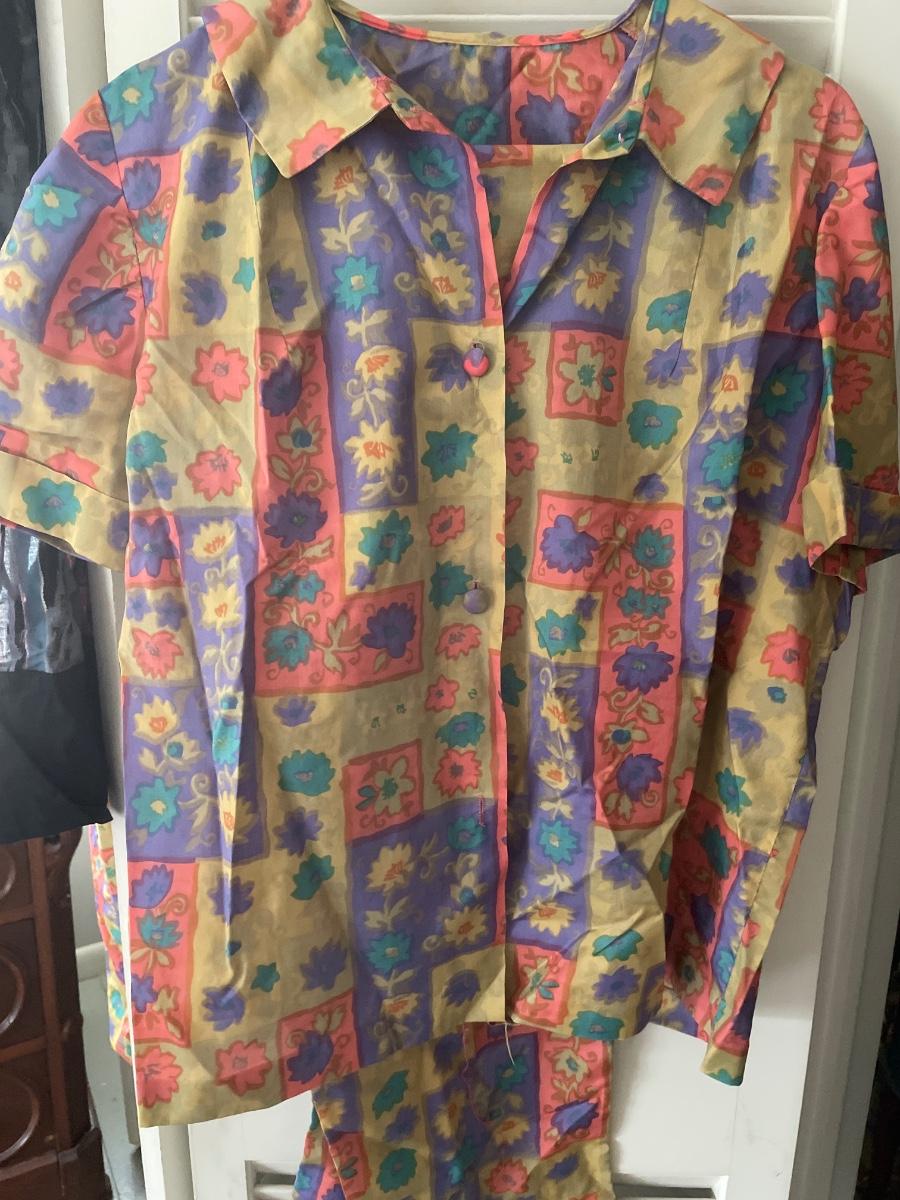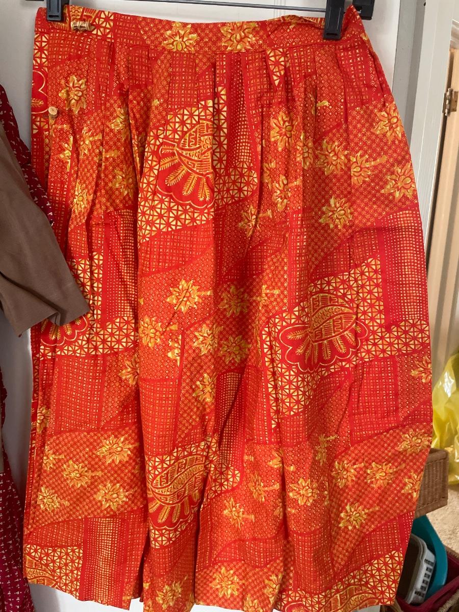 Very fun buttons on orange skirt, two piece pant outfit may be silk, plus