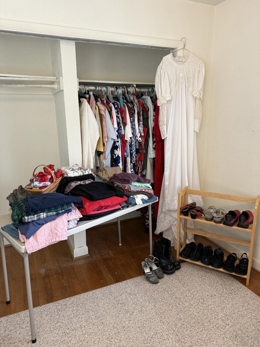 Women’s clothing, shoes, wedding dress, scarves, military outfit