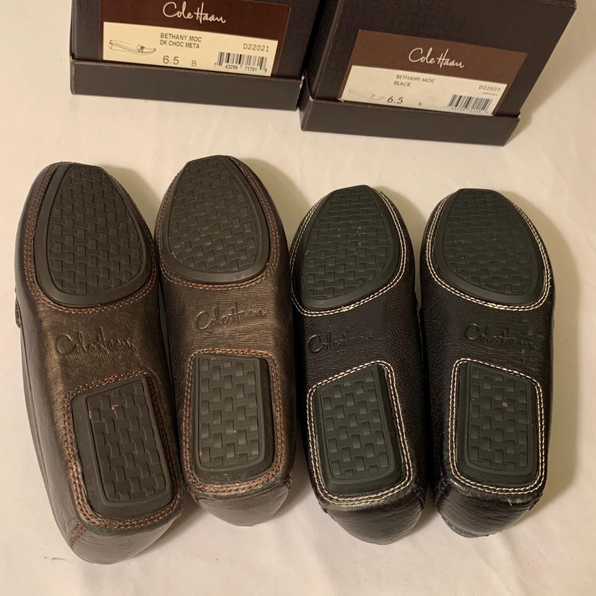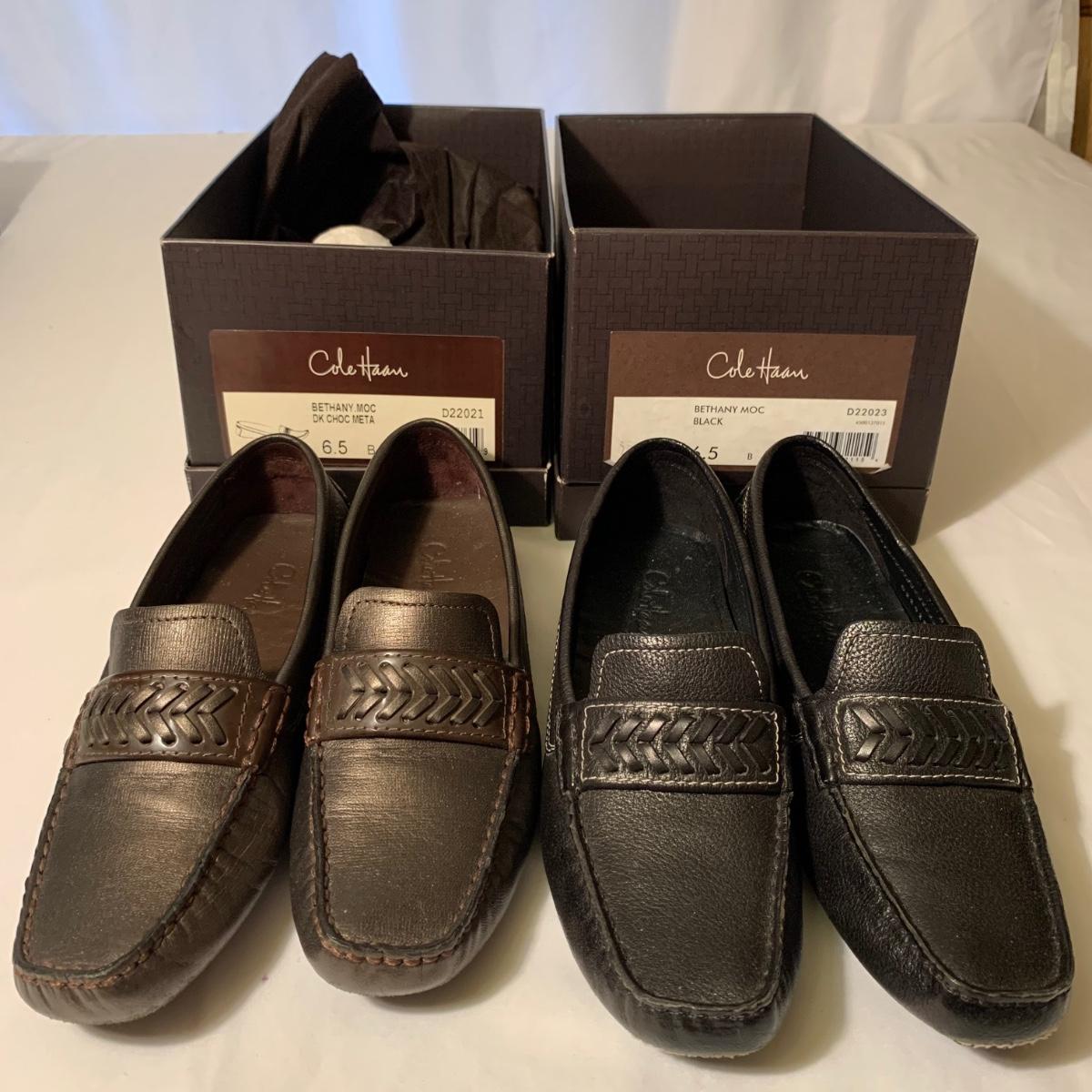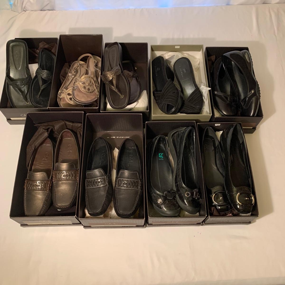 Nine pairs of women’s Cole Haan brand shoes. All size 6-6.5. All are in their original boxes. They have been stored and kept in very good condition, with some looking brand new or very gently used. Shoes appear to be leather or suede, six black pairs and three metallic browns. Local pickup only.