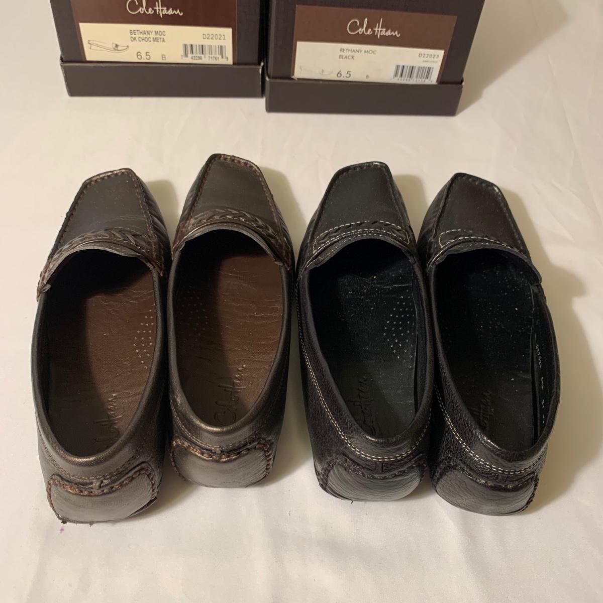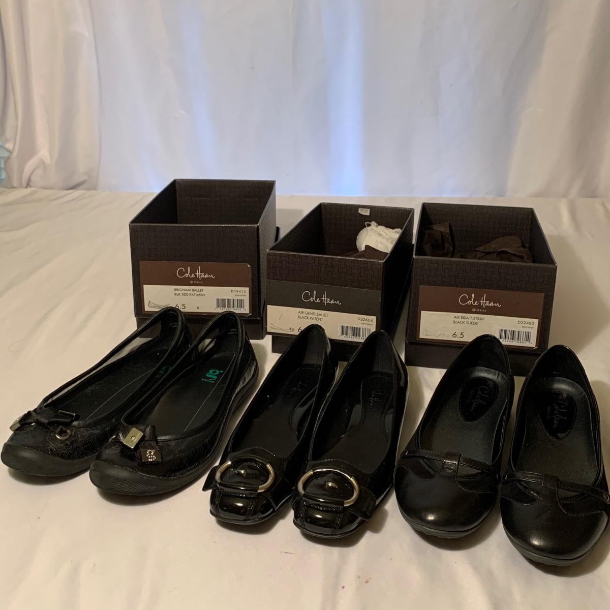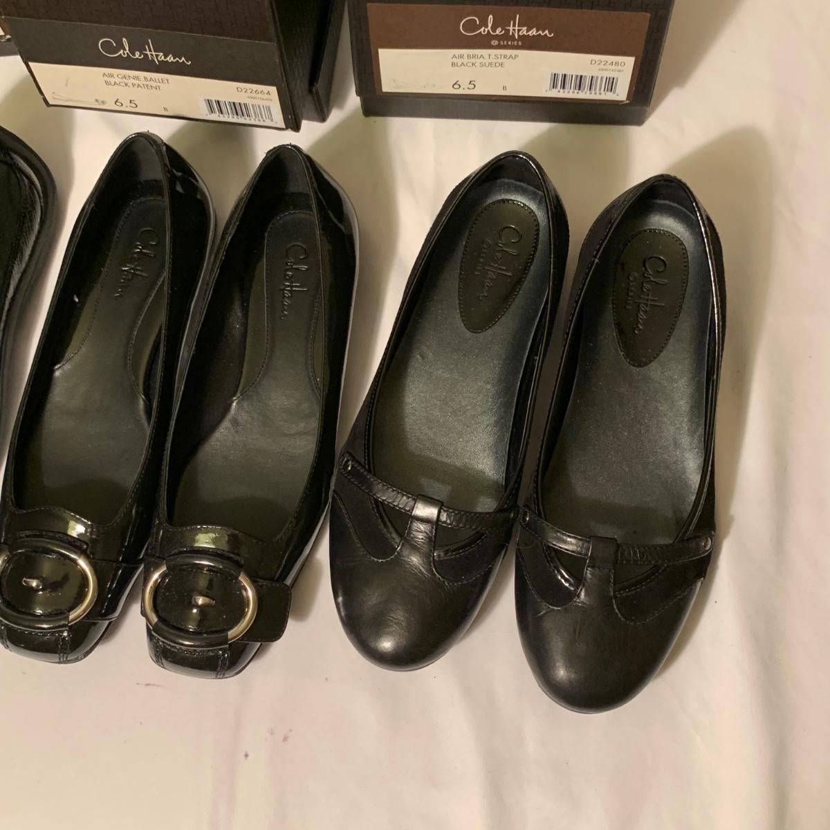 Nine pairs of women’s Cole Haan brand shoes. All size 6-6.5. All are in their original boxes. They have been stored and kept in very good condition, with some looking brand new or very gently used. Shoes appear to be leather or suede, six black pairs and three metallic browns. Local pickup only.