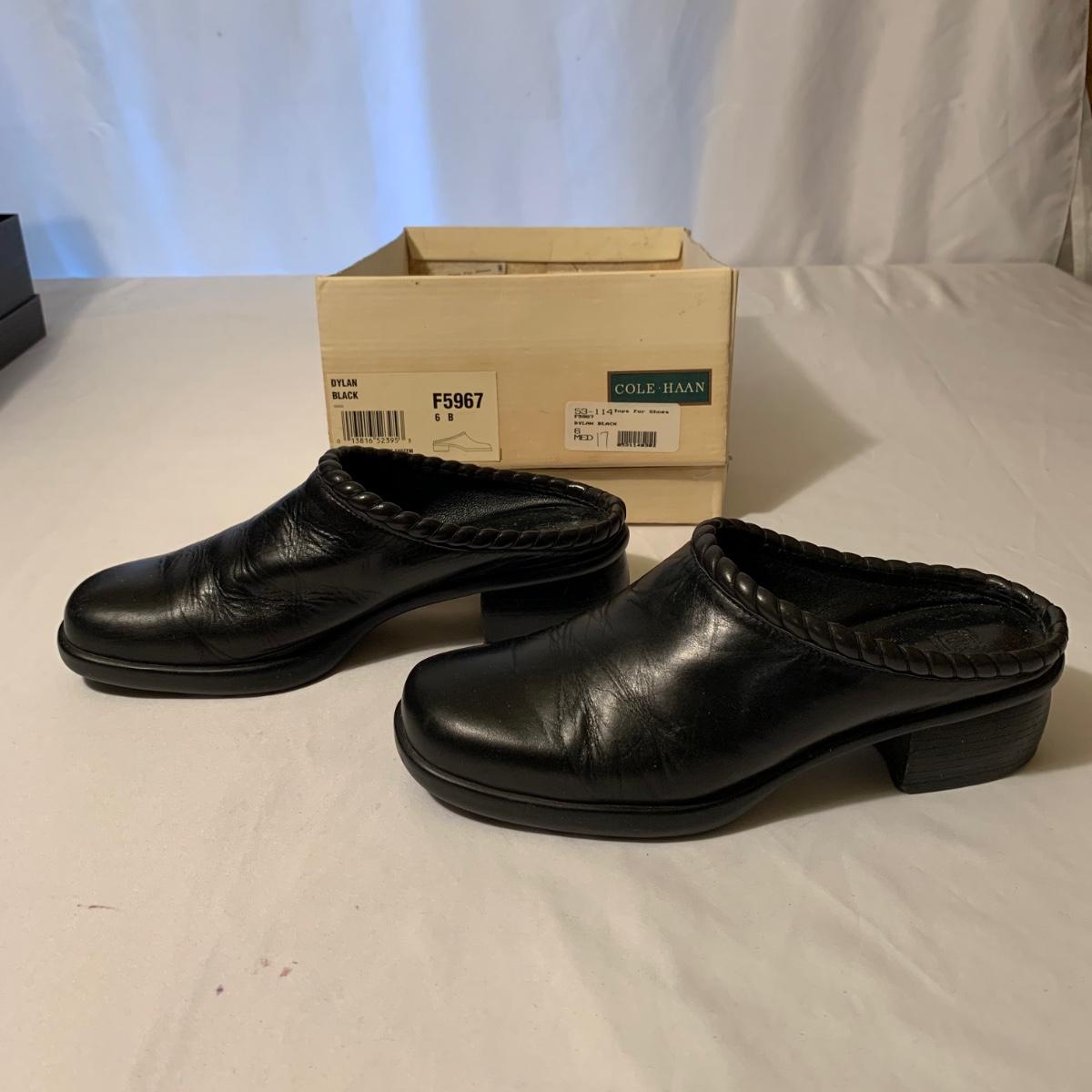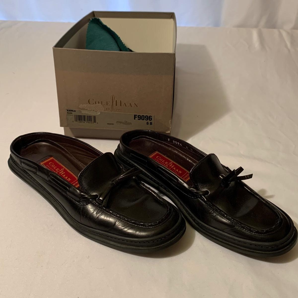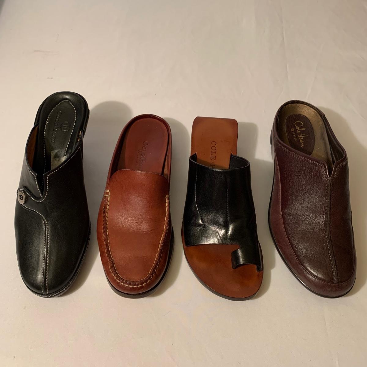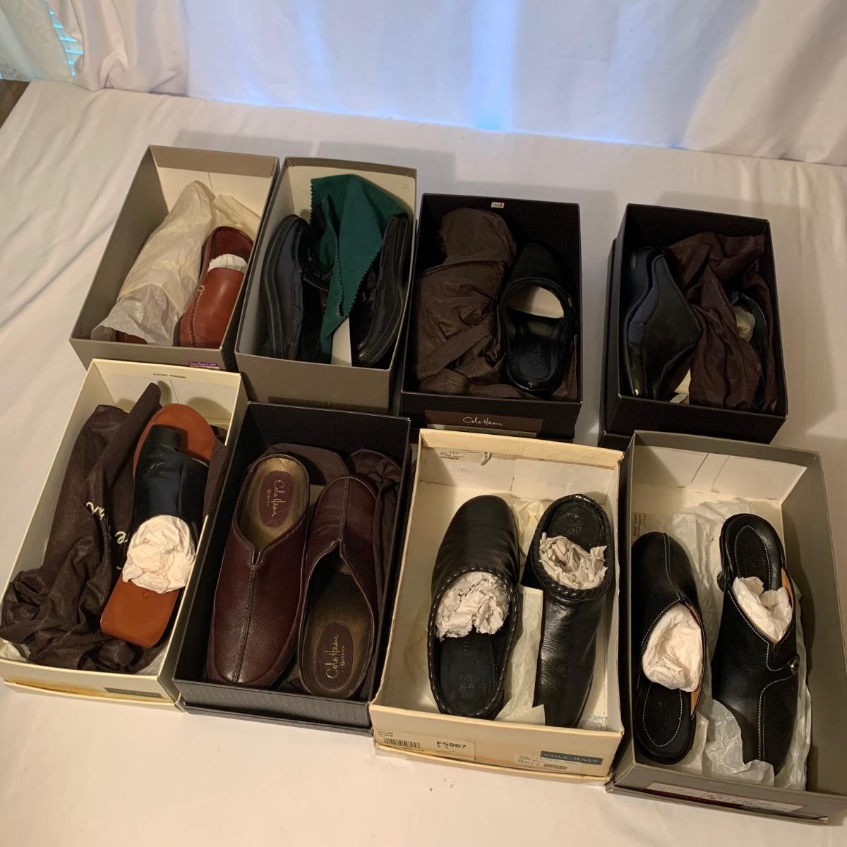Eight pairs of women’s Cole Haan brand slides. All size 6-6.5. All are in their original boxes. They have been stored and kept in very good condition, with some looking brand new or very gently used. Shoes appear to be leather, two brown pairs and six black. Local pickup only.