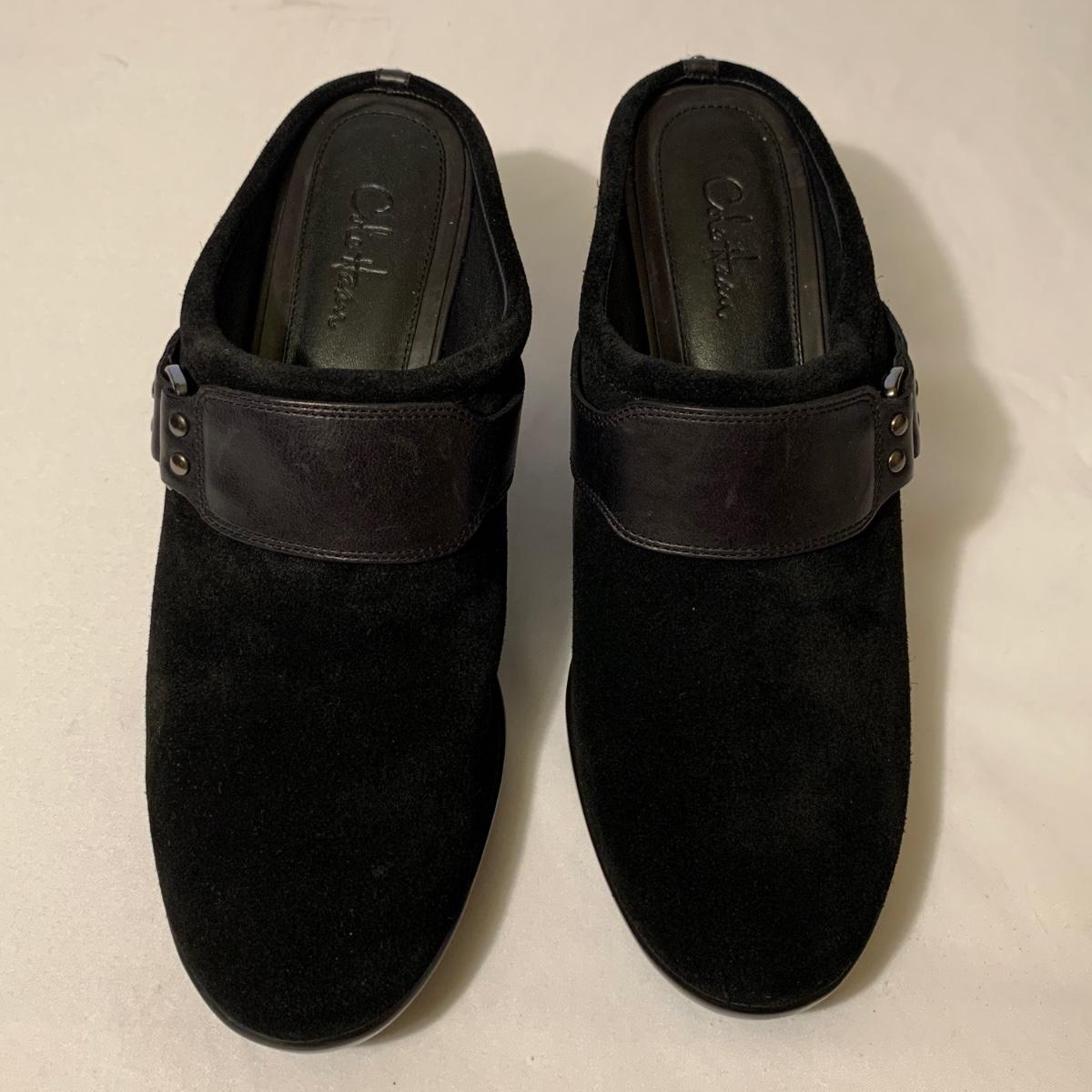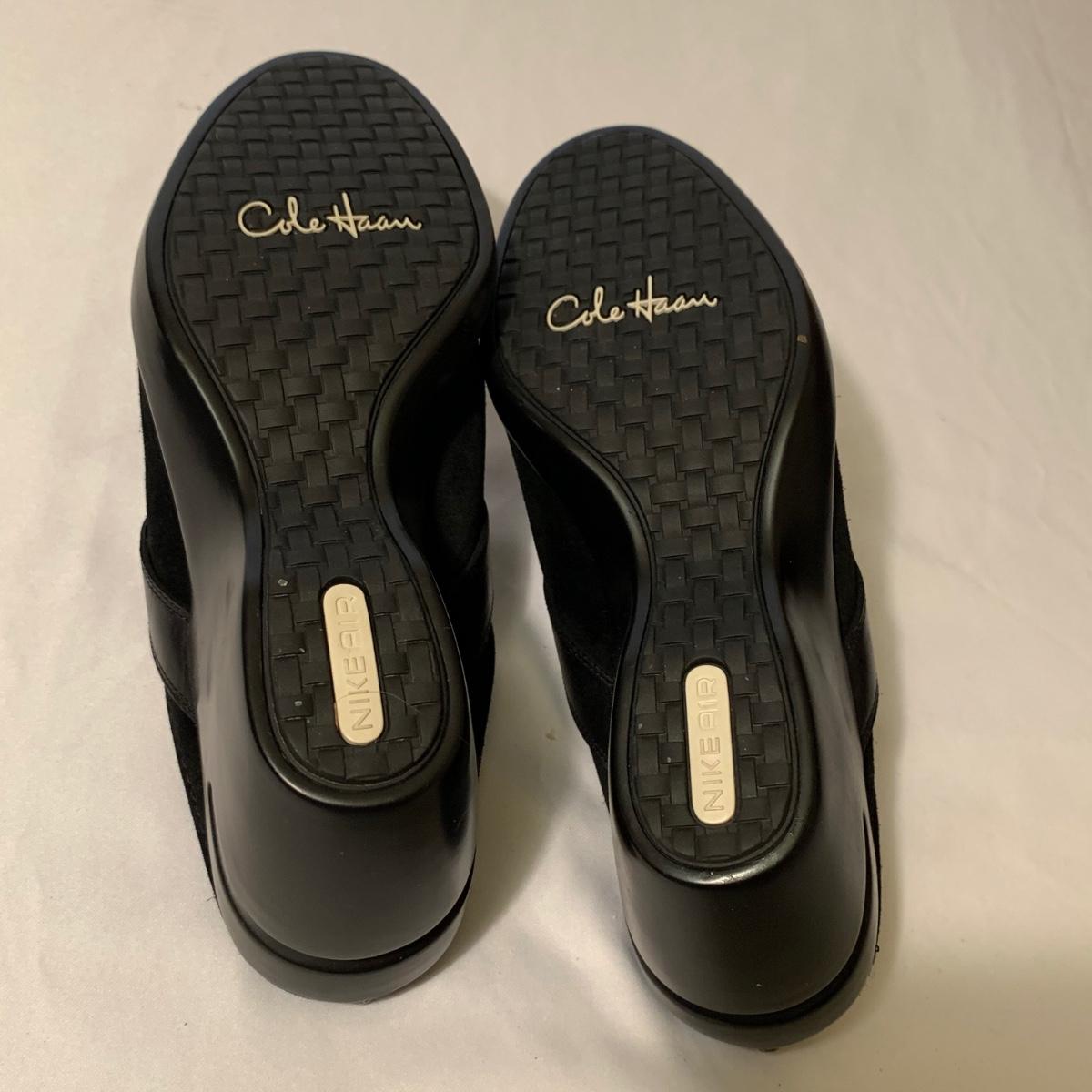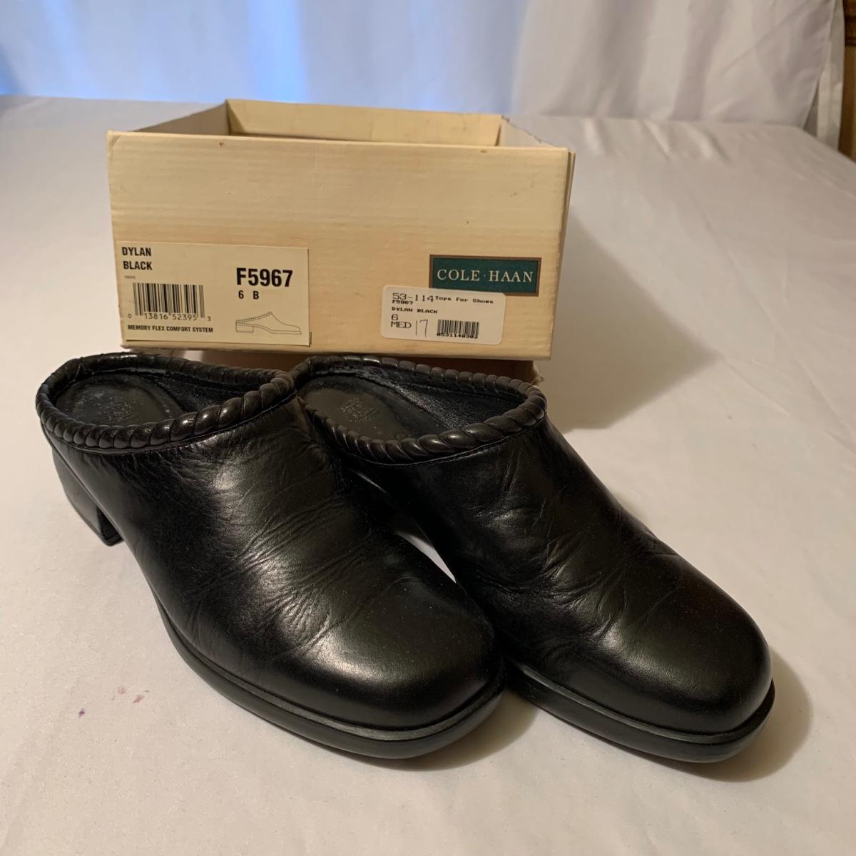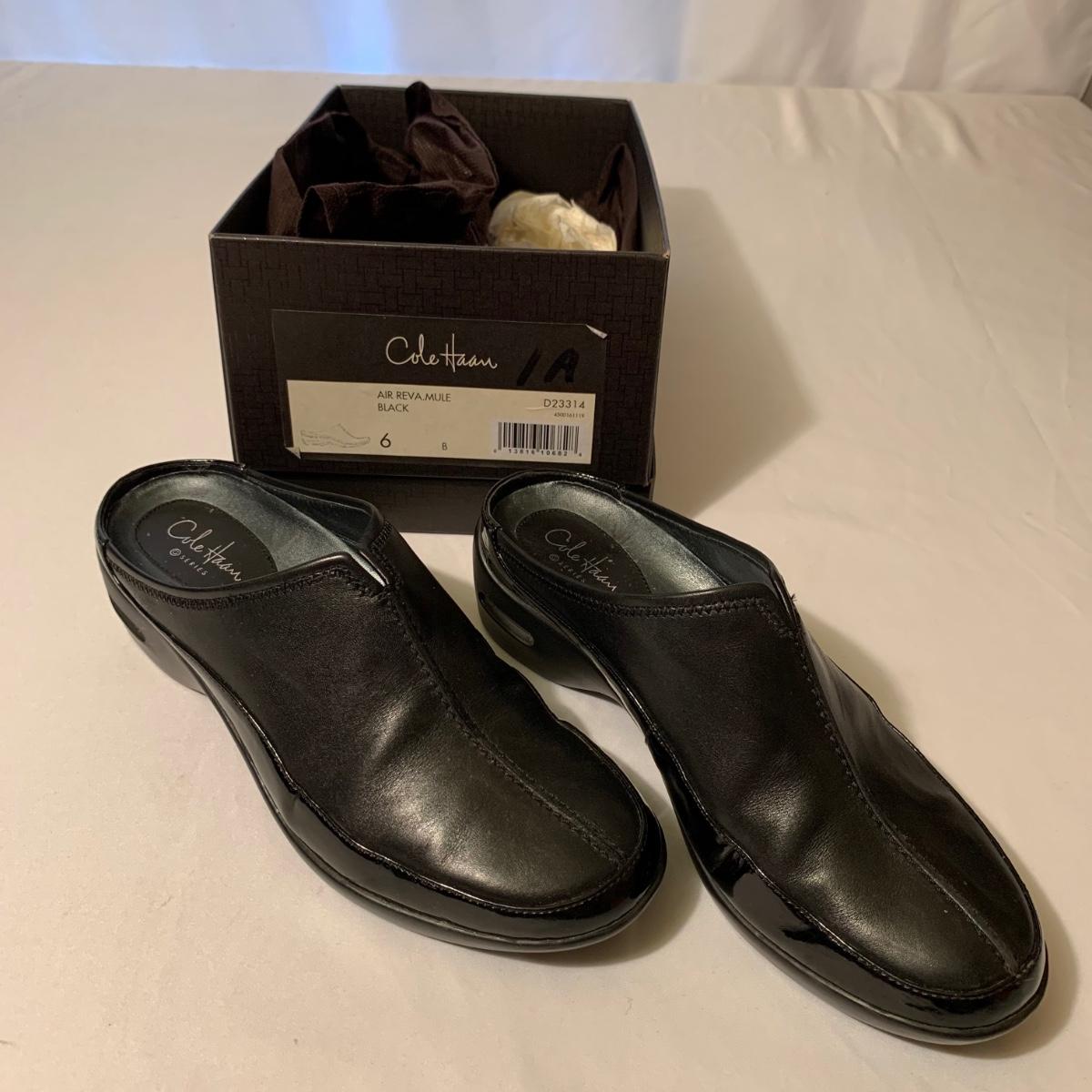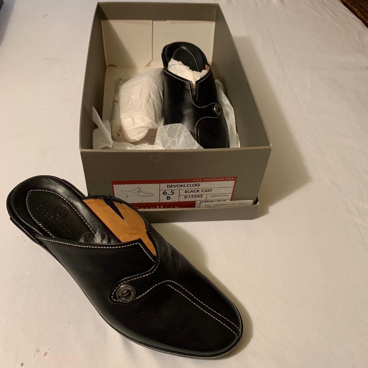 Eight pairs of women’s Cole Haan brand slides. All size 6-6.5. All are in their original boxes. They have been stored and kept in very good condition, with some looking brand new or very gently used. Shoes appear to be leather, two brown pairs and six black. Local pickup only.