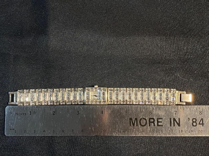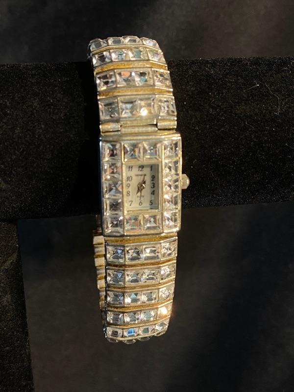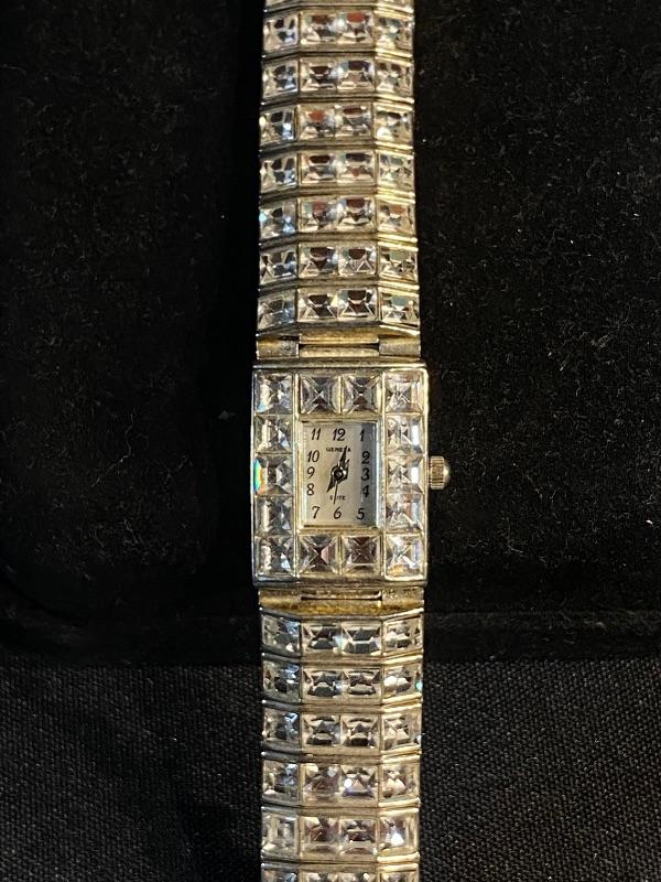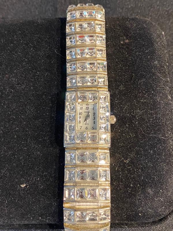 Women's Geneva Elite Wristwatch. Elegant Cubic Zirconia face and band. Great sparkle. Previously used, does have some wear to the clasp. Needs a new battery.